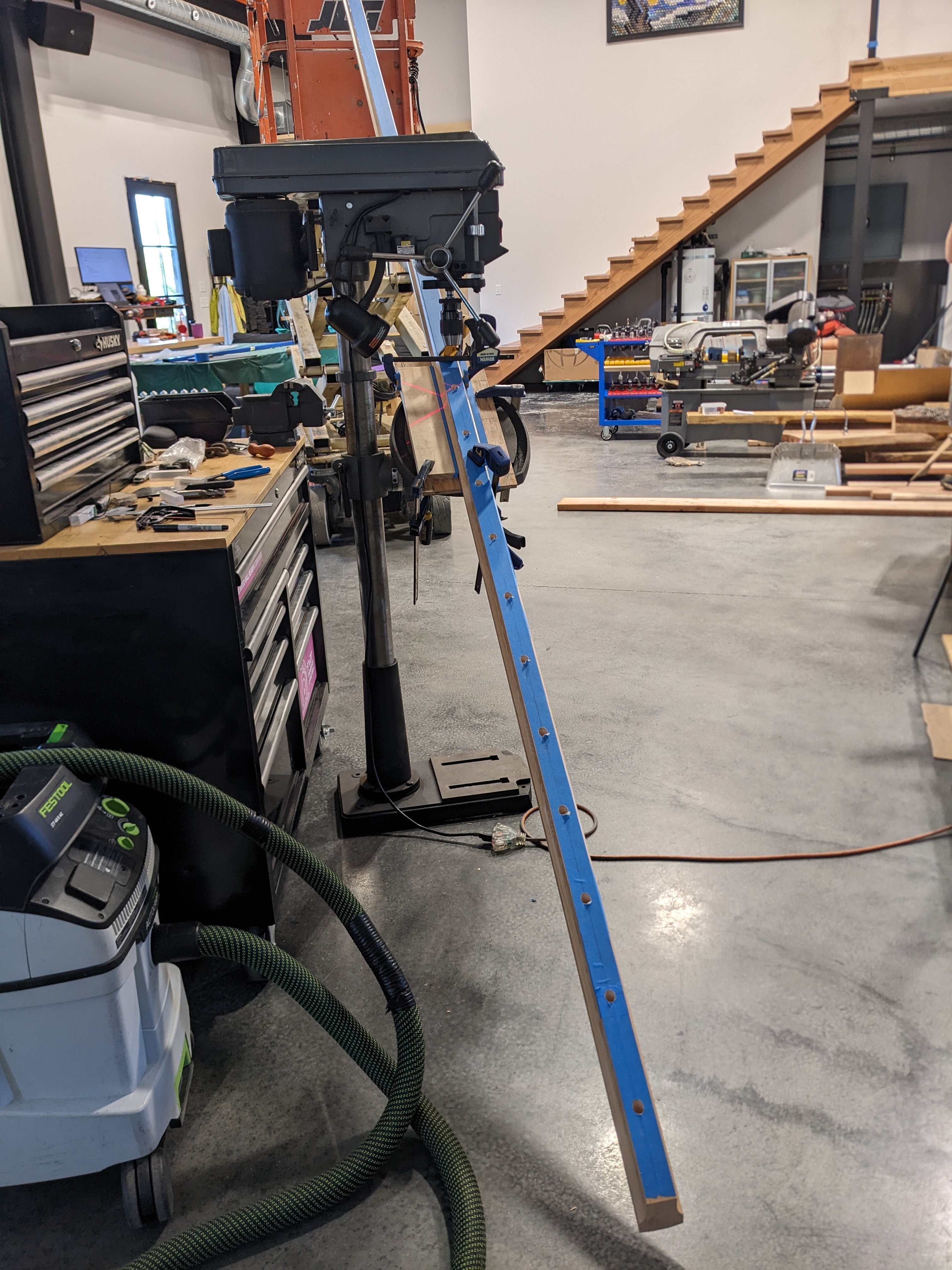 Now it was time to drill! The handrail for the landing was a piece of cake. The sloped section of rail, however, presented some challenges. First, we set the handrail on the drill press at an angle.