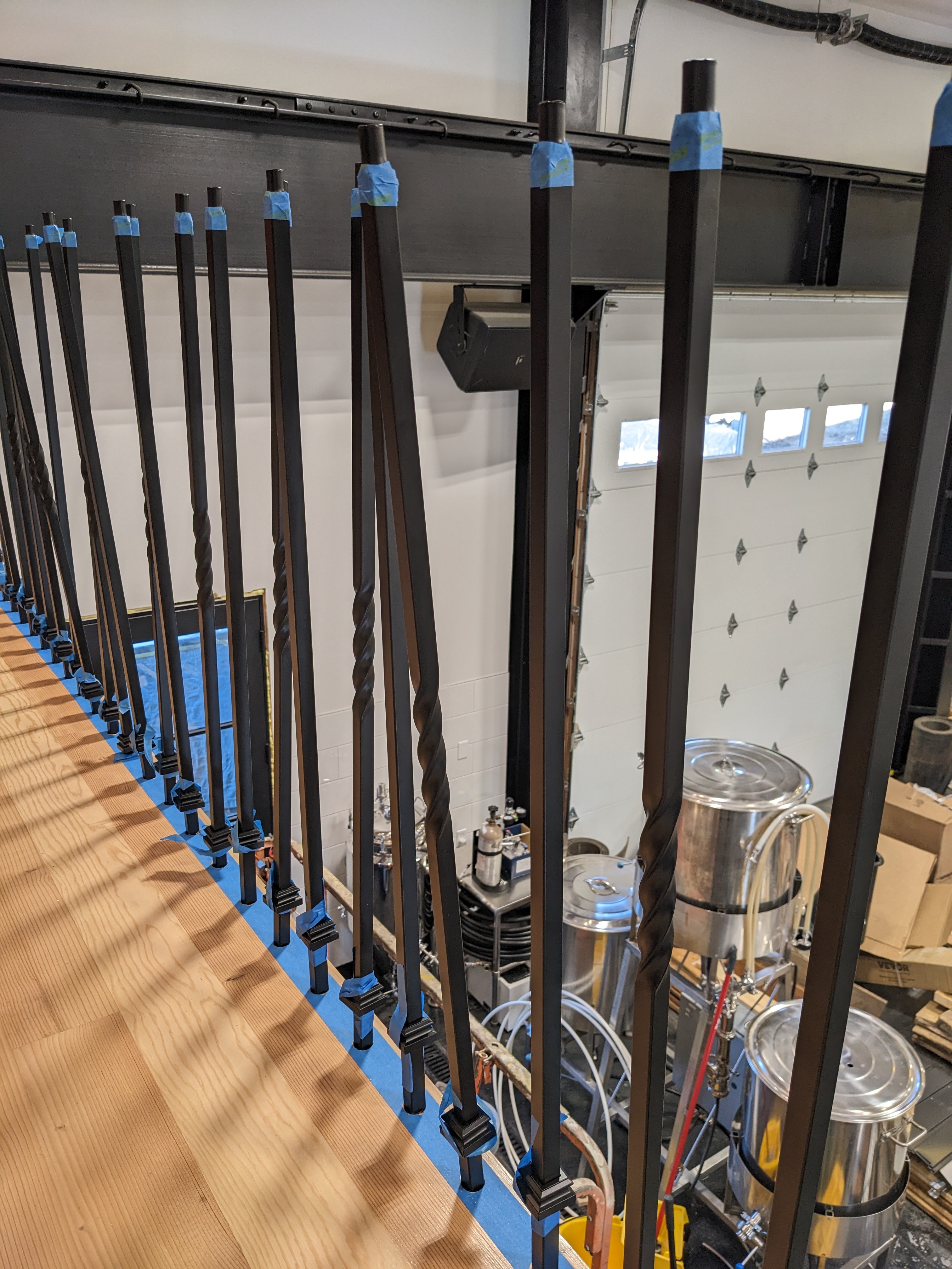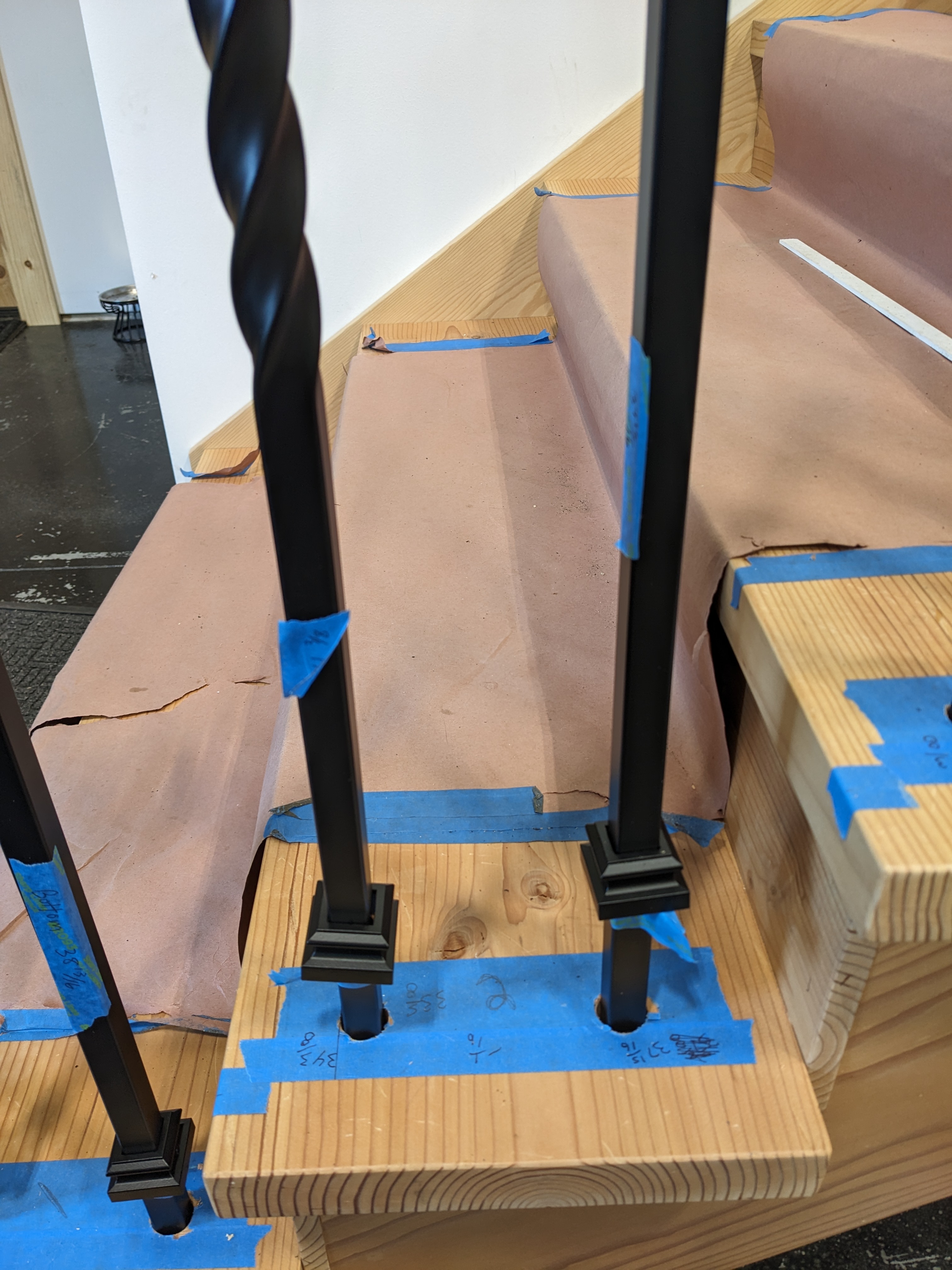 The glue dried quickly, as promised. We stripped the masking and secured the shoes in place. The shoes hide a lot of imperfections. I have a new appreciation of metal balusters that fit snug without shoes.