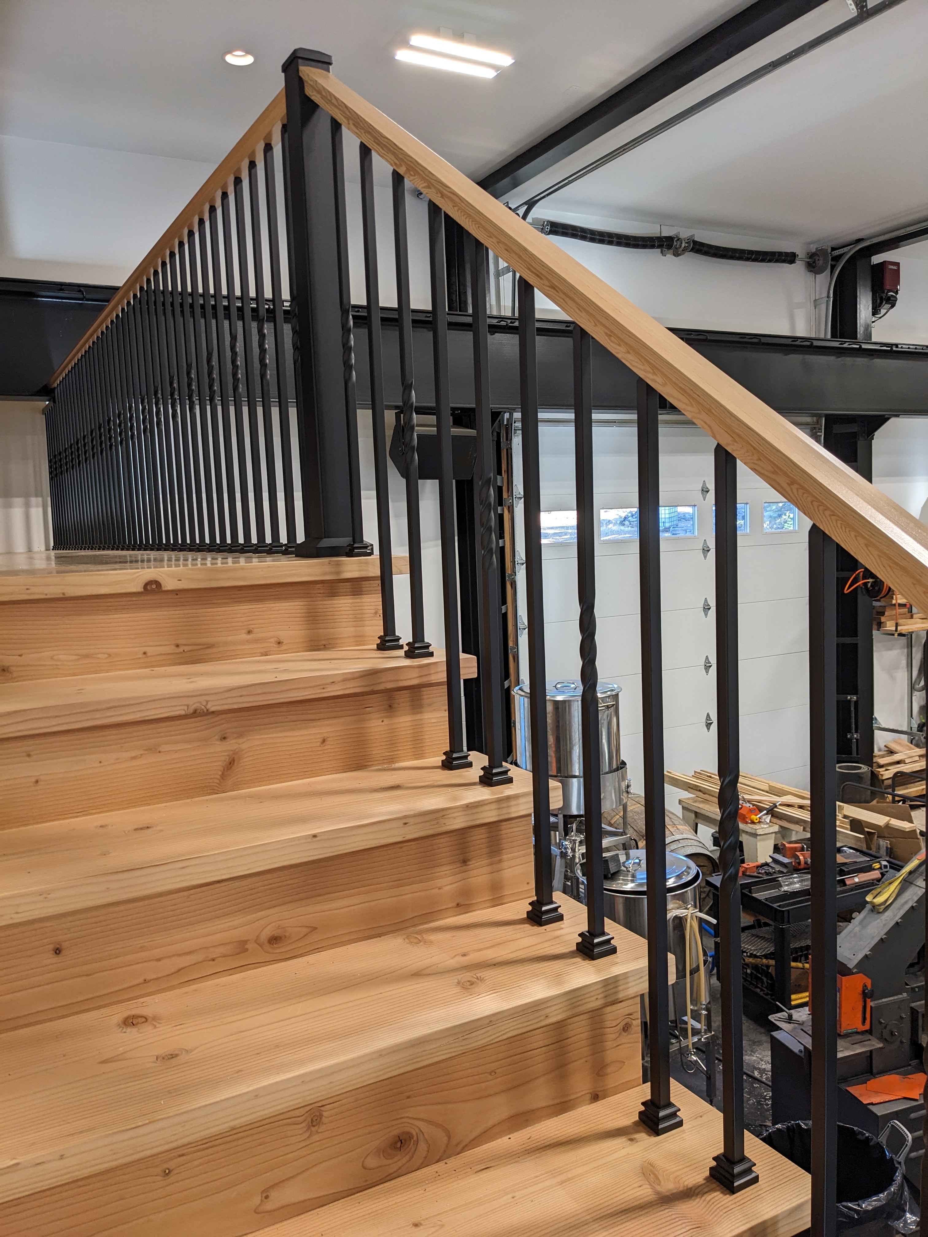 We picked up the last piece of the puzzle – the handrail itself – from a woodworking shop in Portland. Sam and I were excited to find they had a 20 ft long Doug fir option (not common) to match our stairs. Unfortunately the handrails were unfinished. We sprayed them with a clear coat after some light sanding.