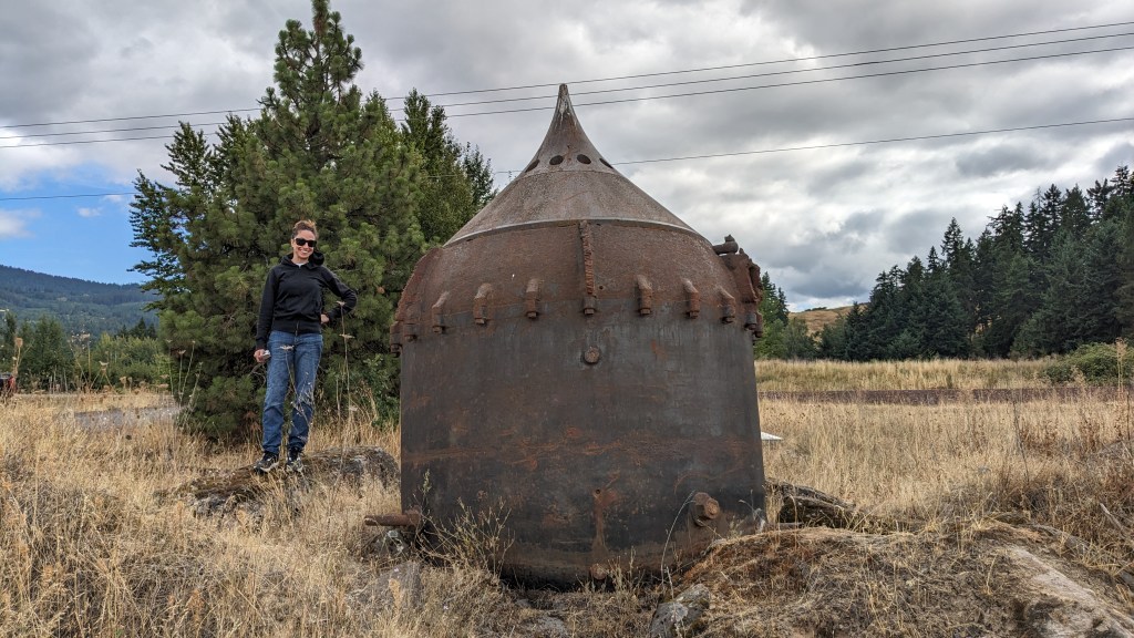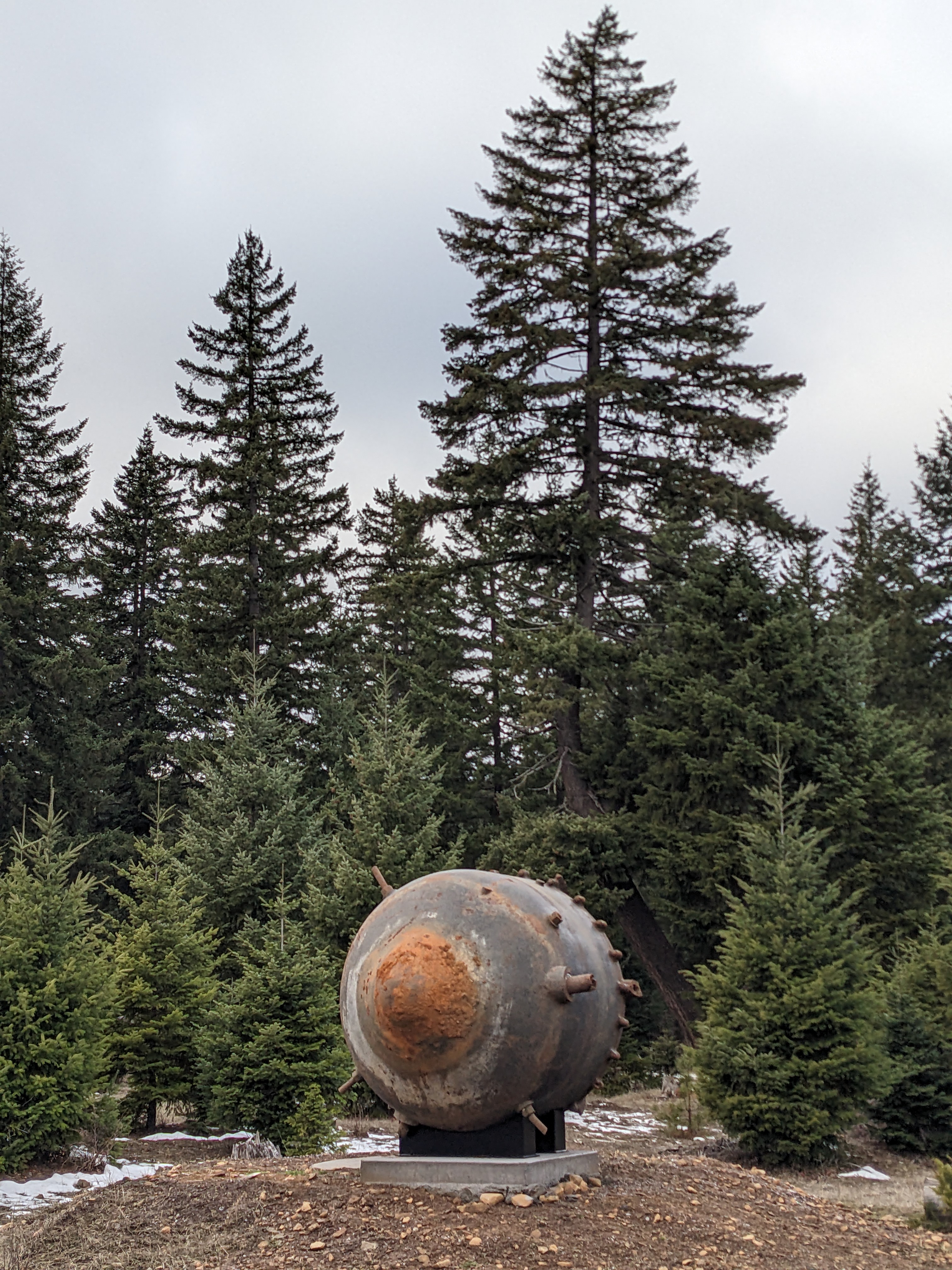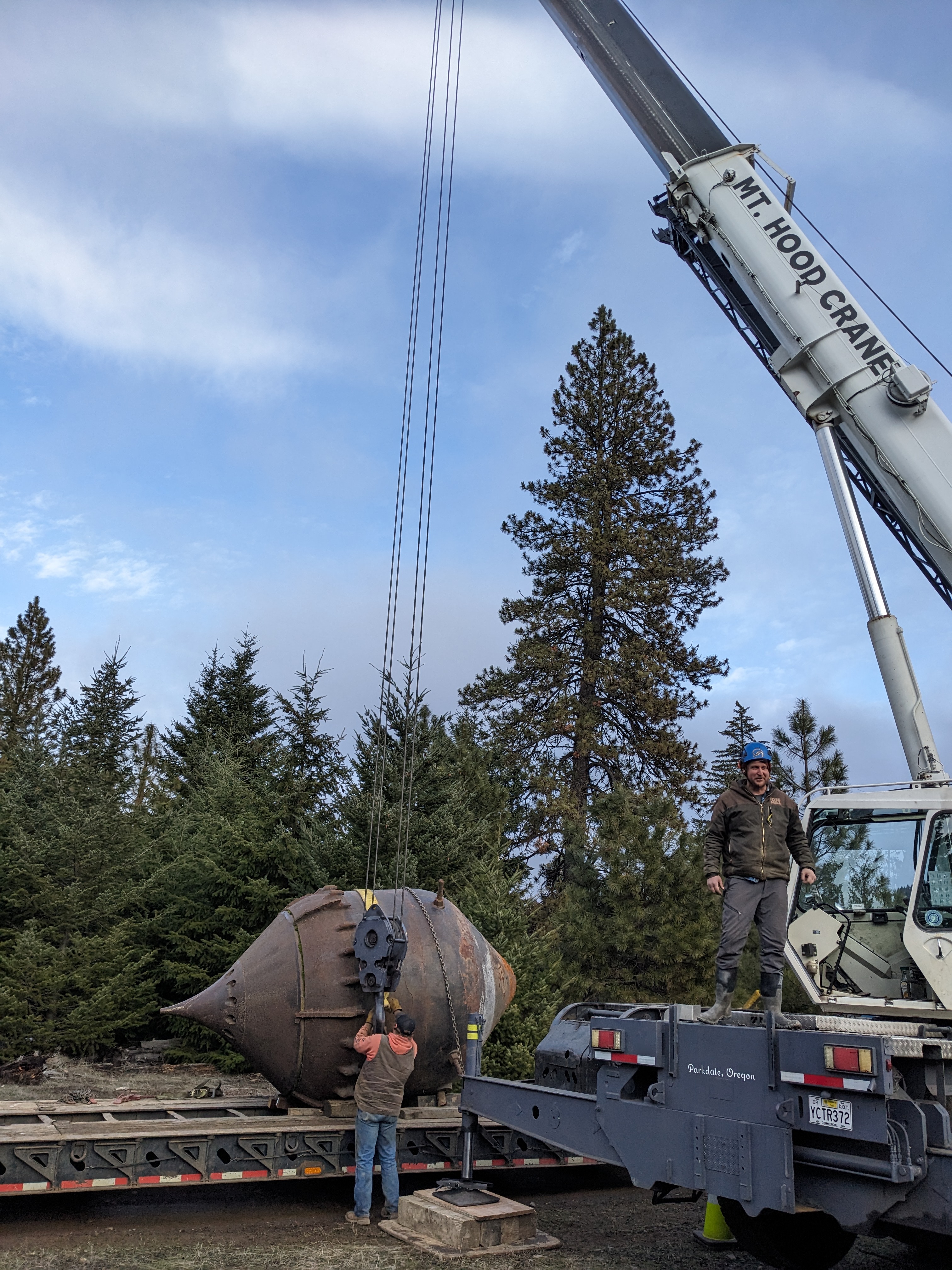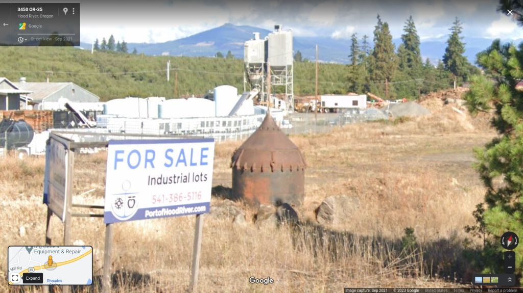 Pictured above is the google “street view” image- the same image we saw from Hwy 35 every time we went cross country skiing or apple picking. The thing was on property owned by the Port of Hood River. Sam was always driving and asked me to email the port about it. Eventually, I emailed the port. They thought it was part of a turbine with the blades cut off from a hydroelectric dam. (We later found that was incorrect.) They also mentioned that people occasionally ask about it and it is not for sale.
