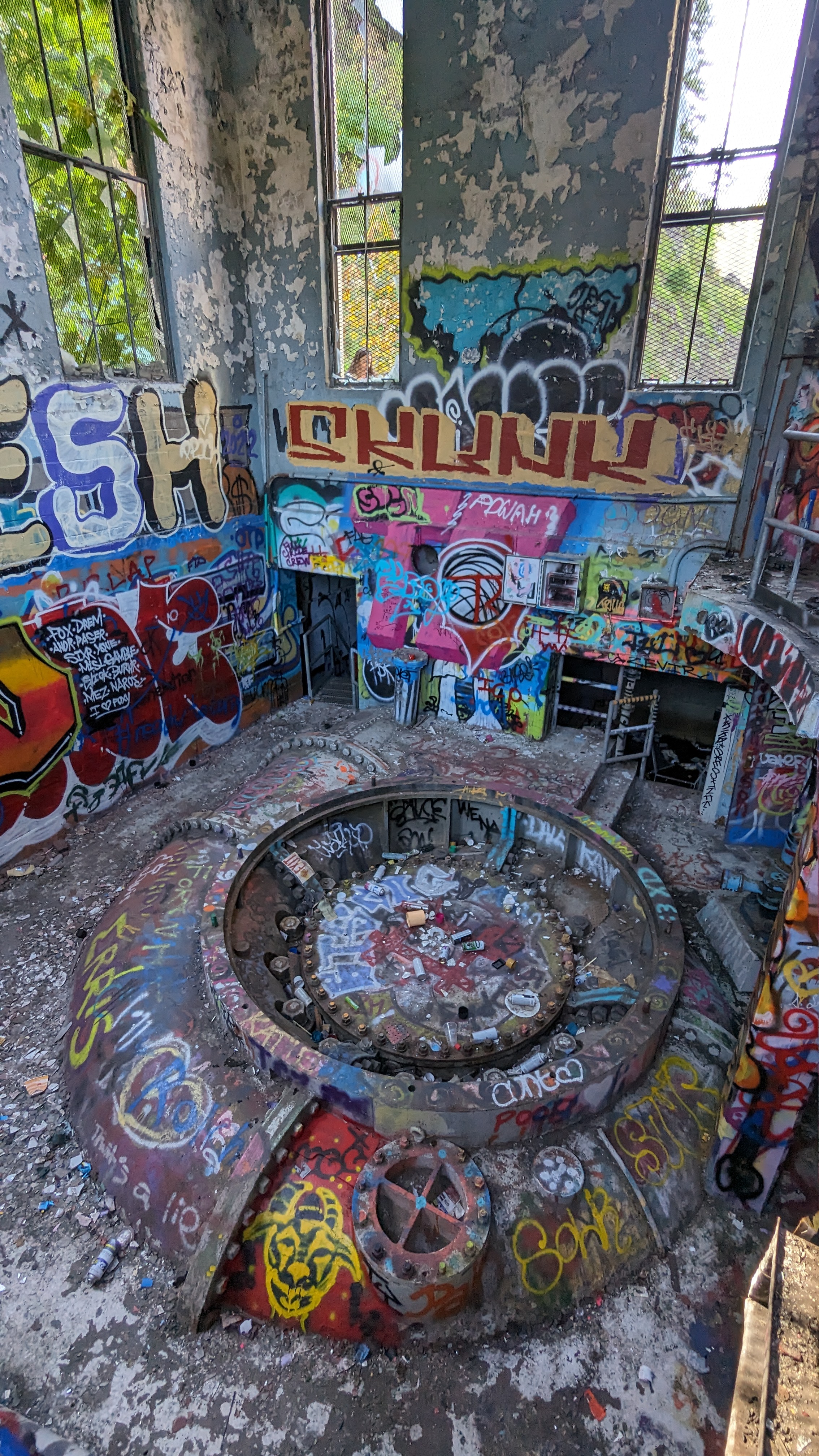 You can even go inside if you’re brave. Sam explored the building to see if he could place the needle valve. It might have been on the other side of the wall in the left picture below, but sections of the powerhouse had been filled with concrete. I was too afraid of finding other needles, so I waited outside.