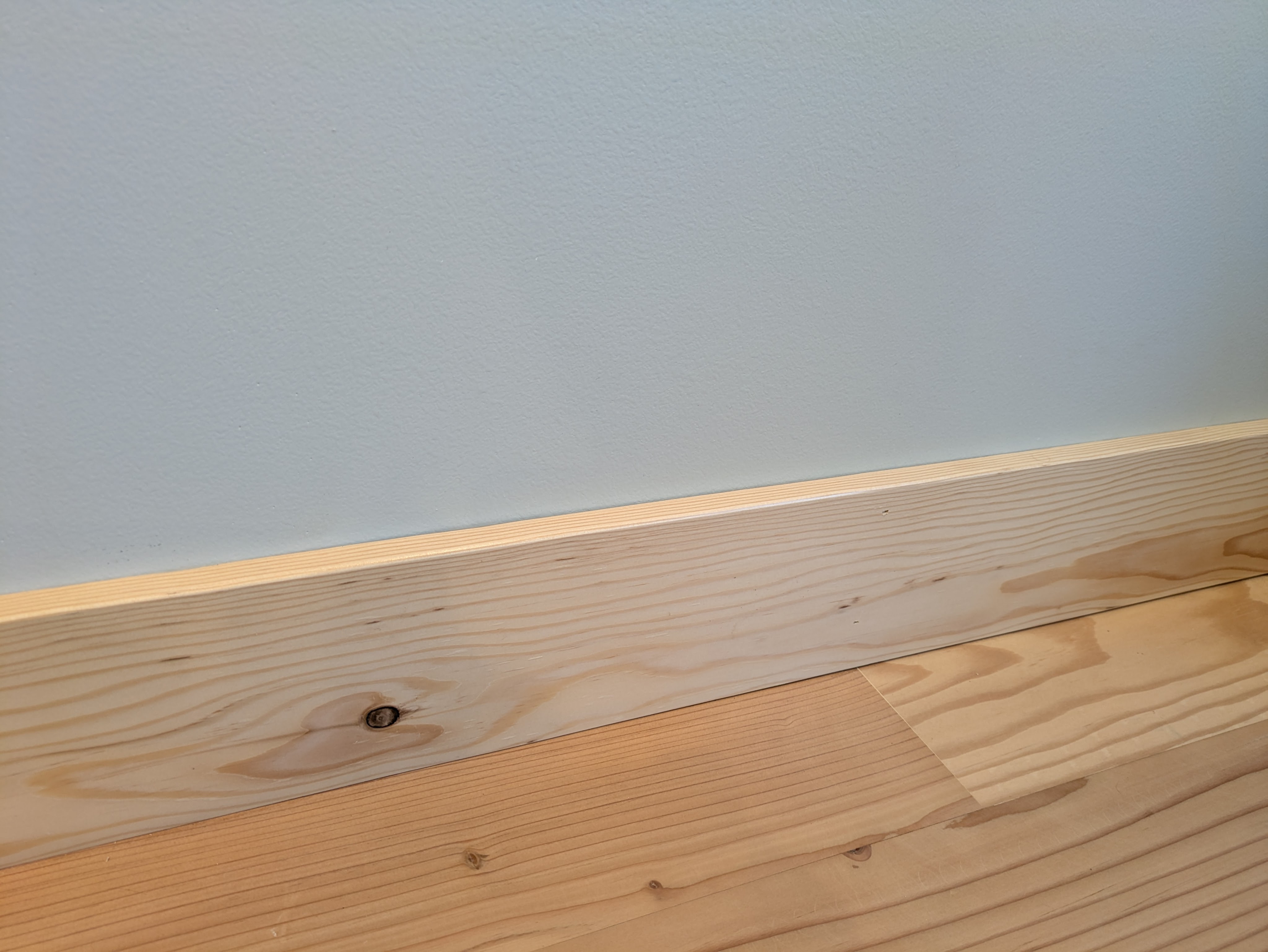 Similar to the pine window trim, Sam and I helped to process rough pine slabs into 5″ tall baseboards for our bedroom. Thankfully our bedroom is small, and we weren’t using pine in most of the other rooms.