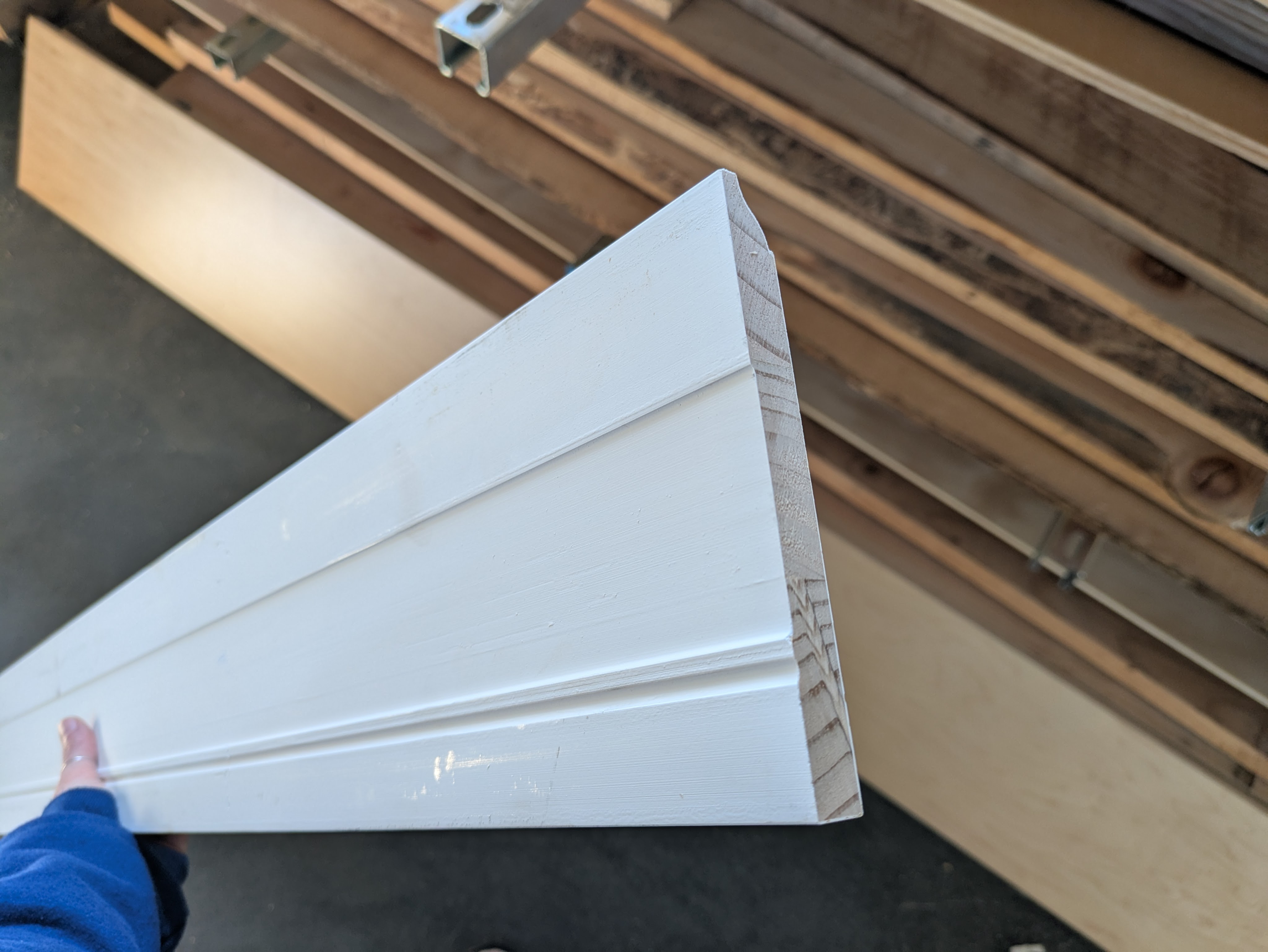 We made the landing and office baseboards out of doug fir to match the wood flooring. As mentioned before, doug fir is much easier to work with. We even made a straight 13 ft long board!