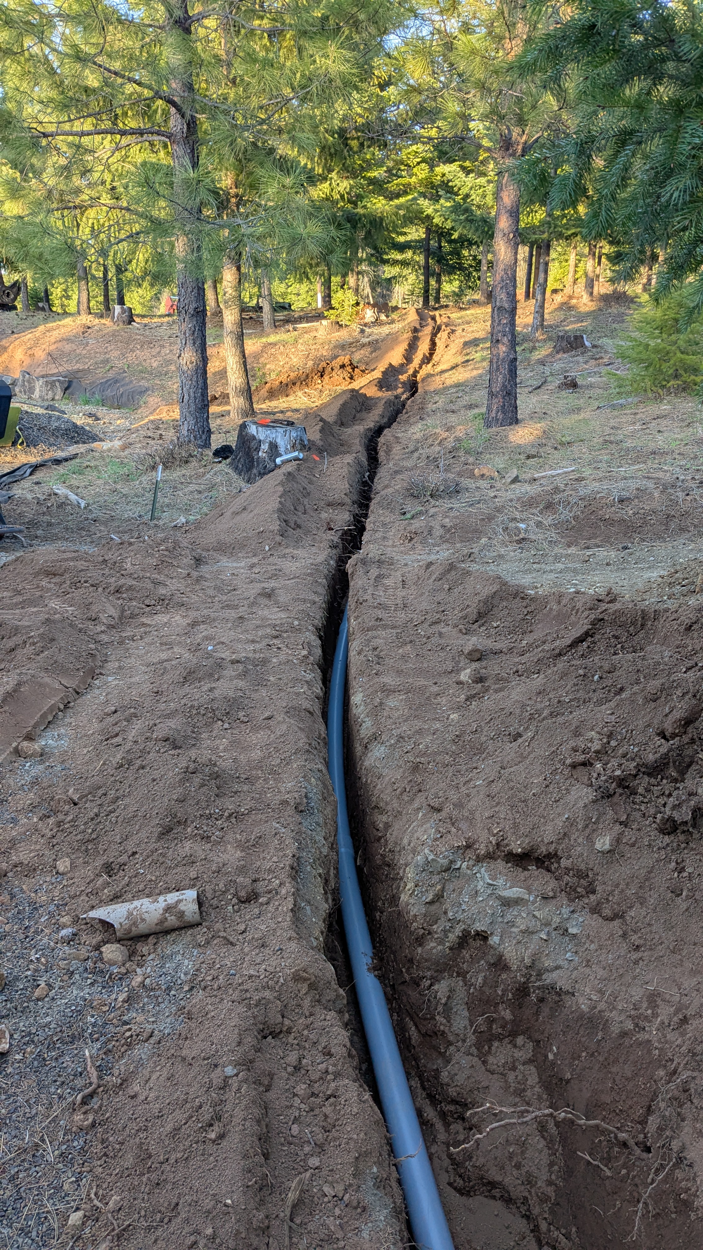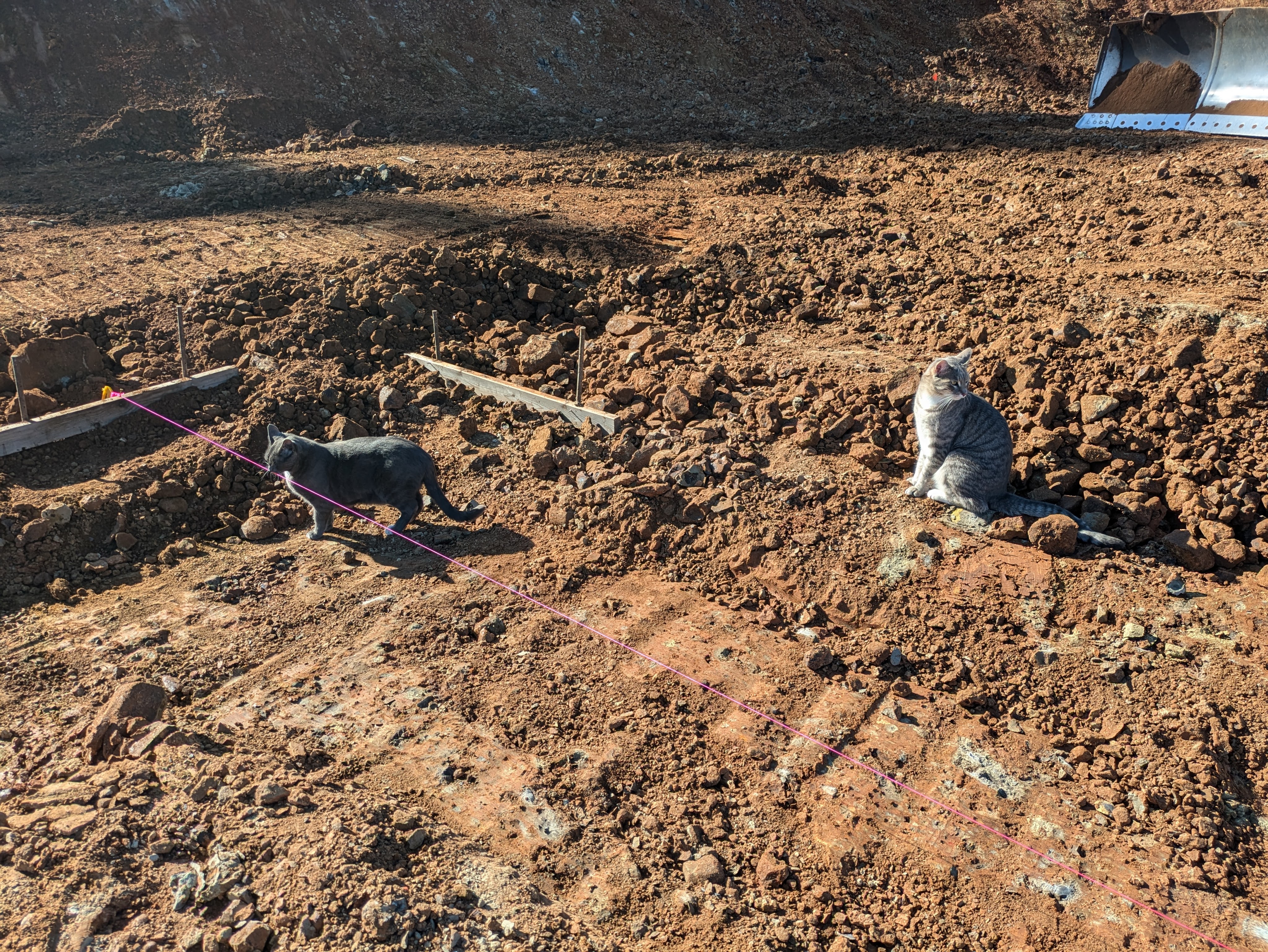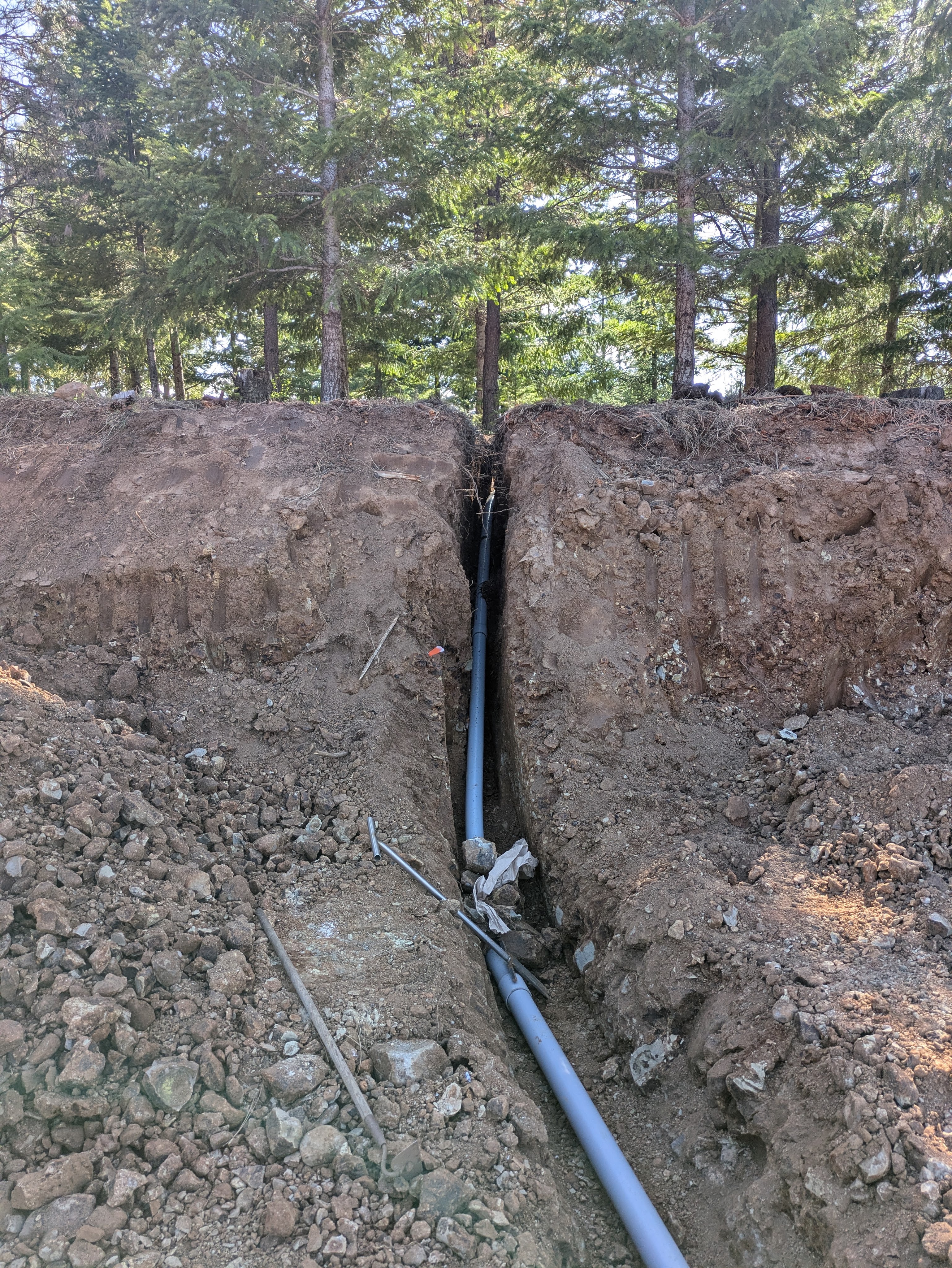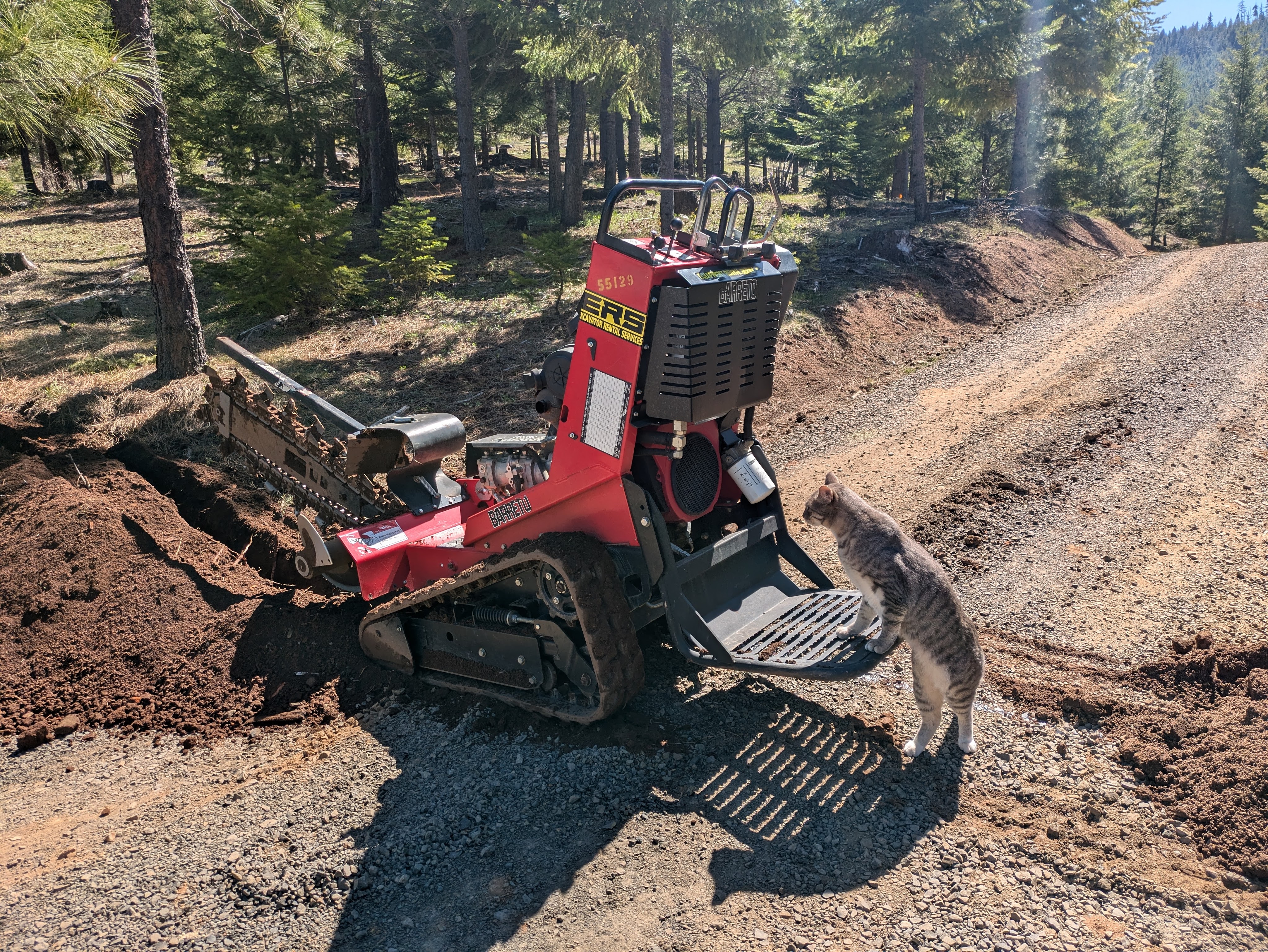 The cats love trenching, mostly because it creates soft mounds of dirt for them to dig in. Unfortunately, this meant we had to get the conduit in before the cats backfilled our trench. We returned the trencher and picked up 250 feet of 3″ conduit and some glue.