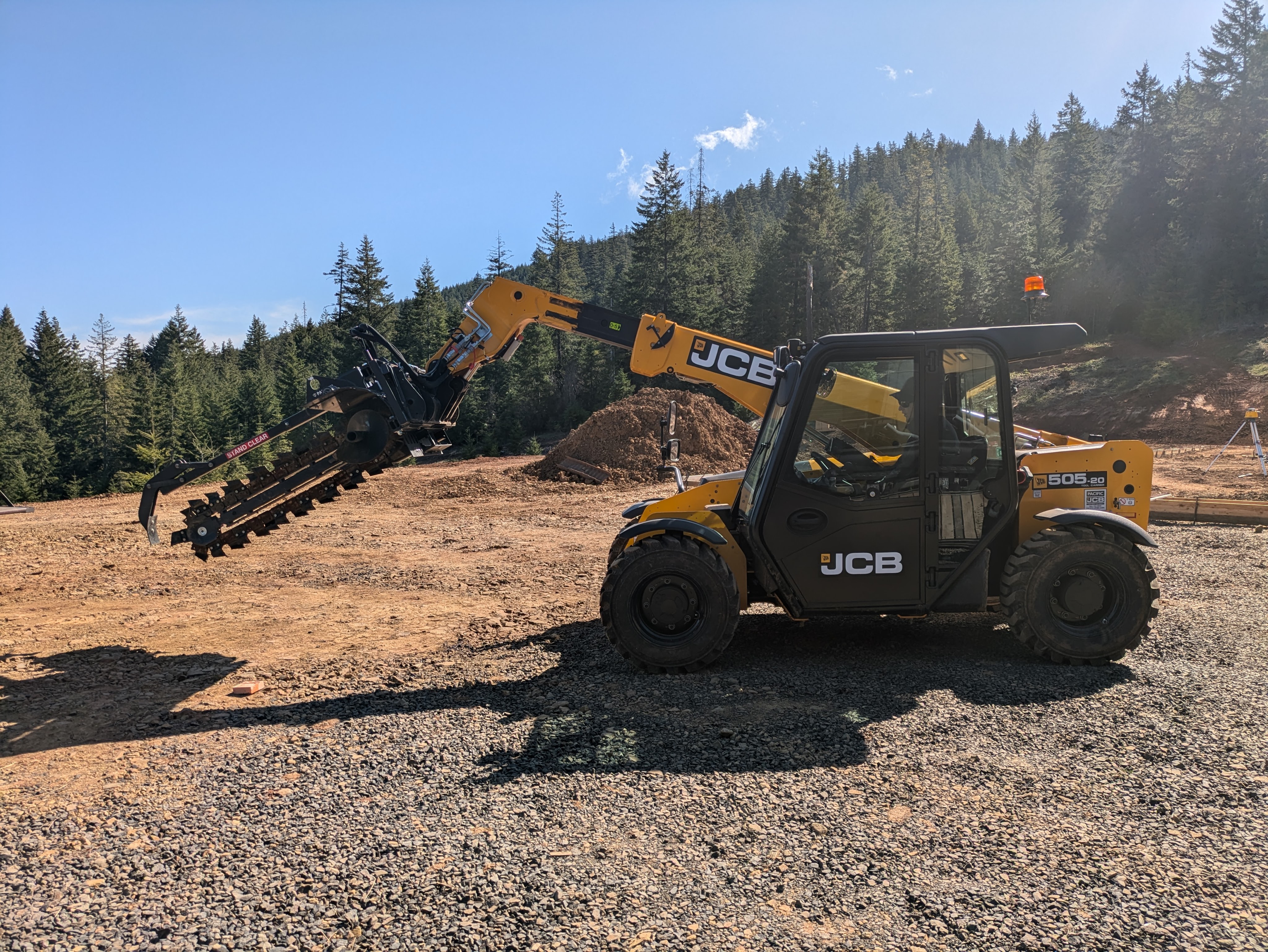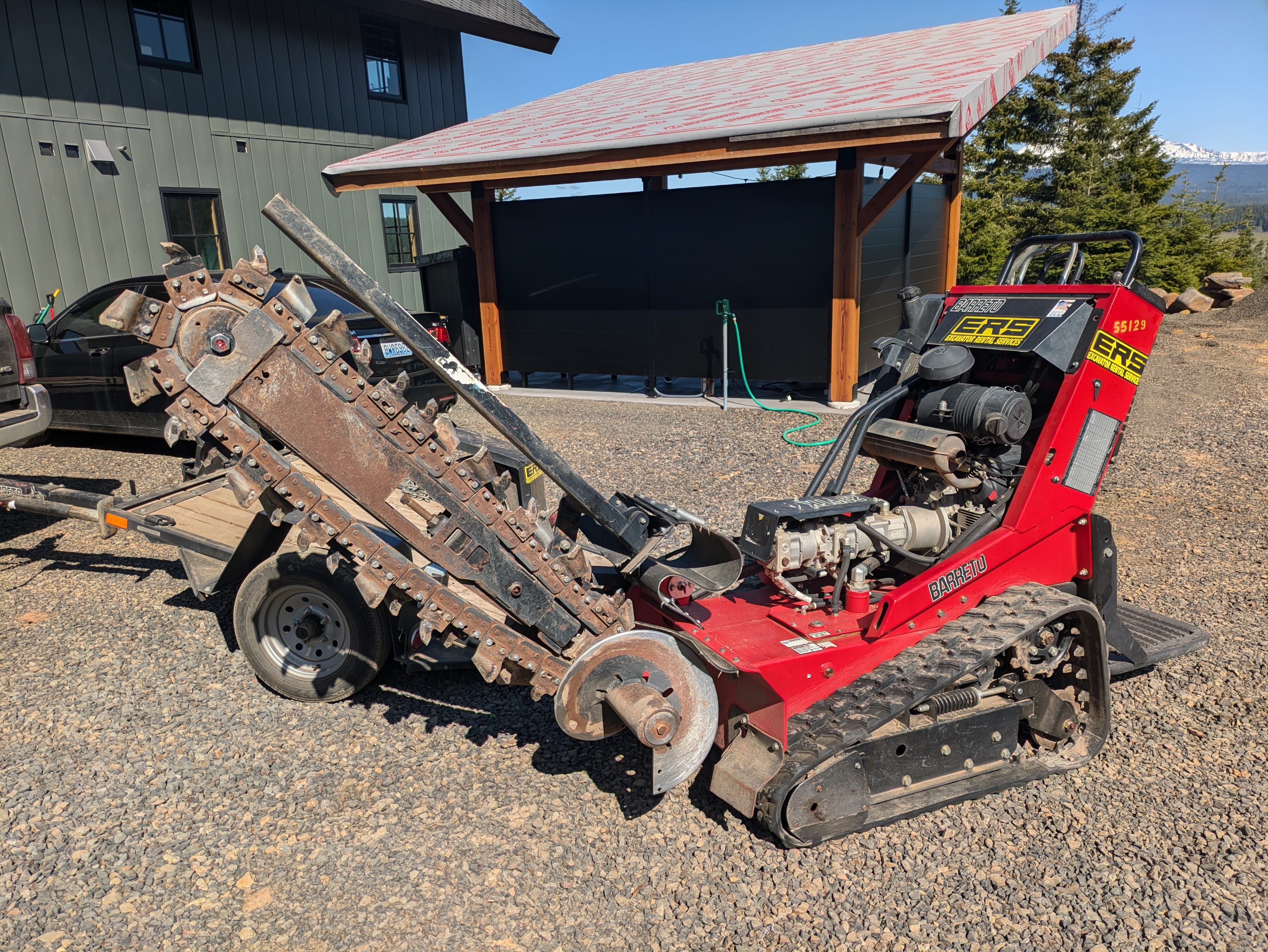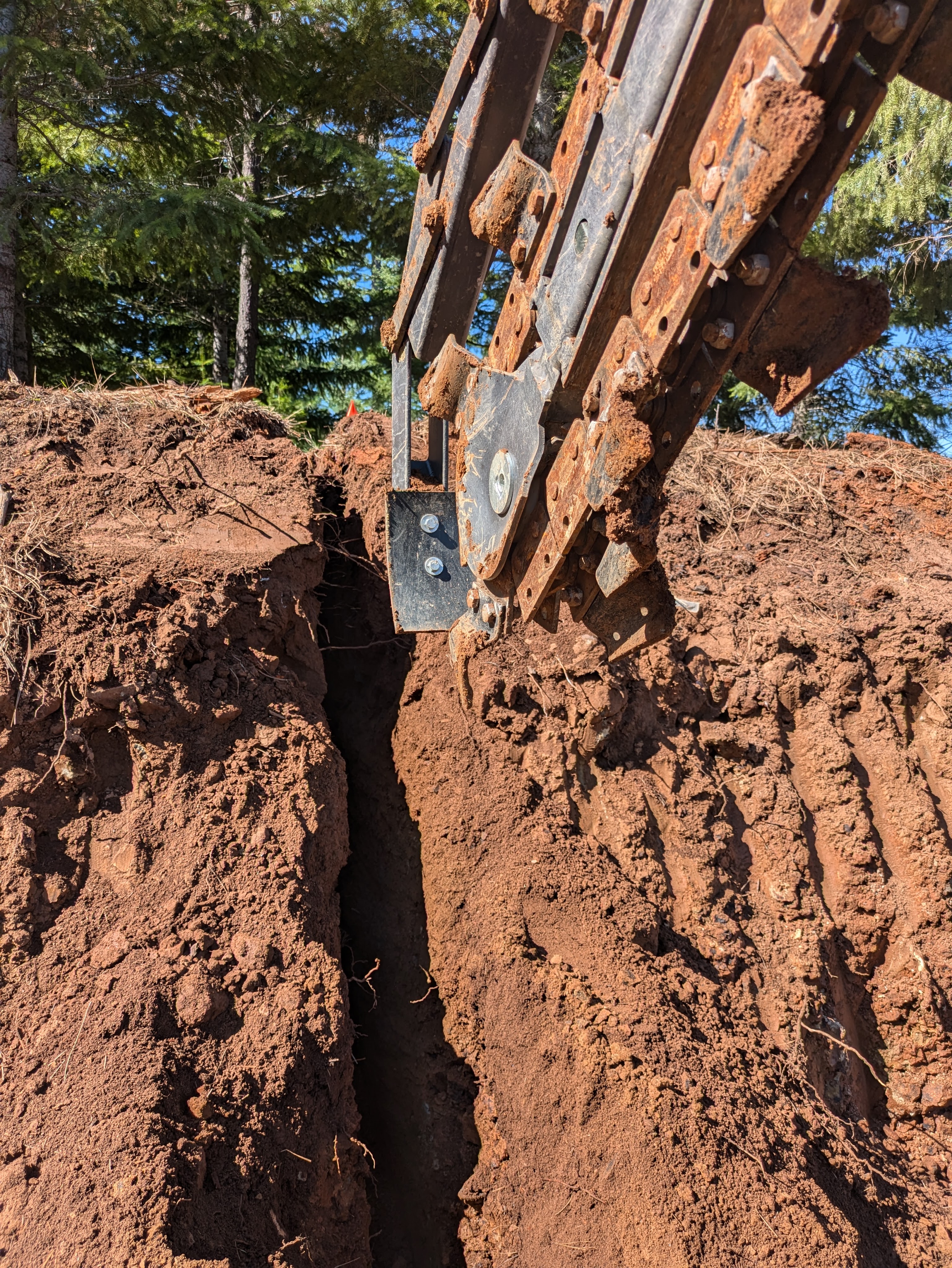 It was going well until we got to the bank behind the shed. The conduit had to come down the hill and end up 24″ underground. Good thing we have a friend with a trencher attachment that happened to fit our telehandler.