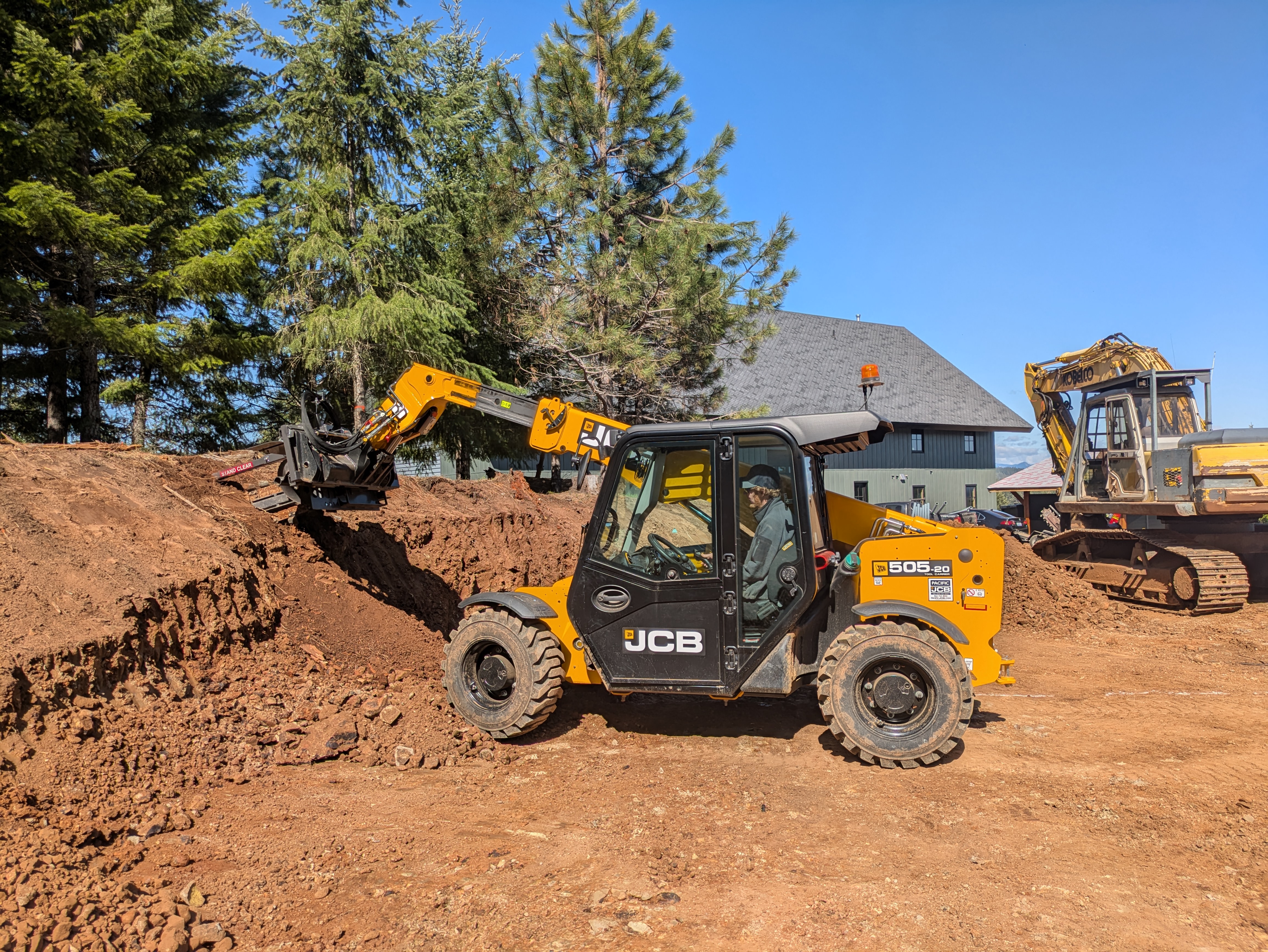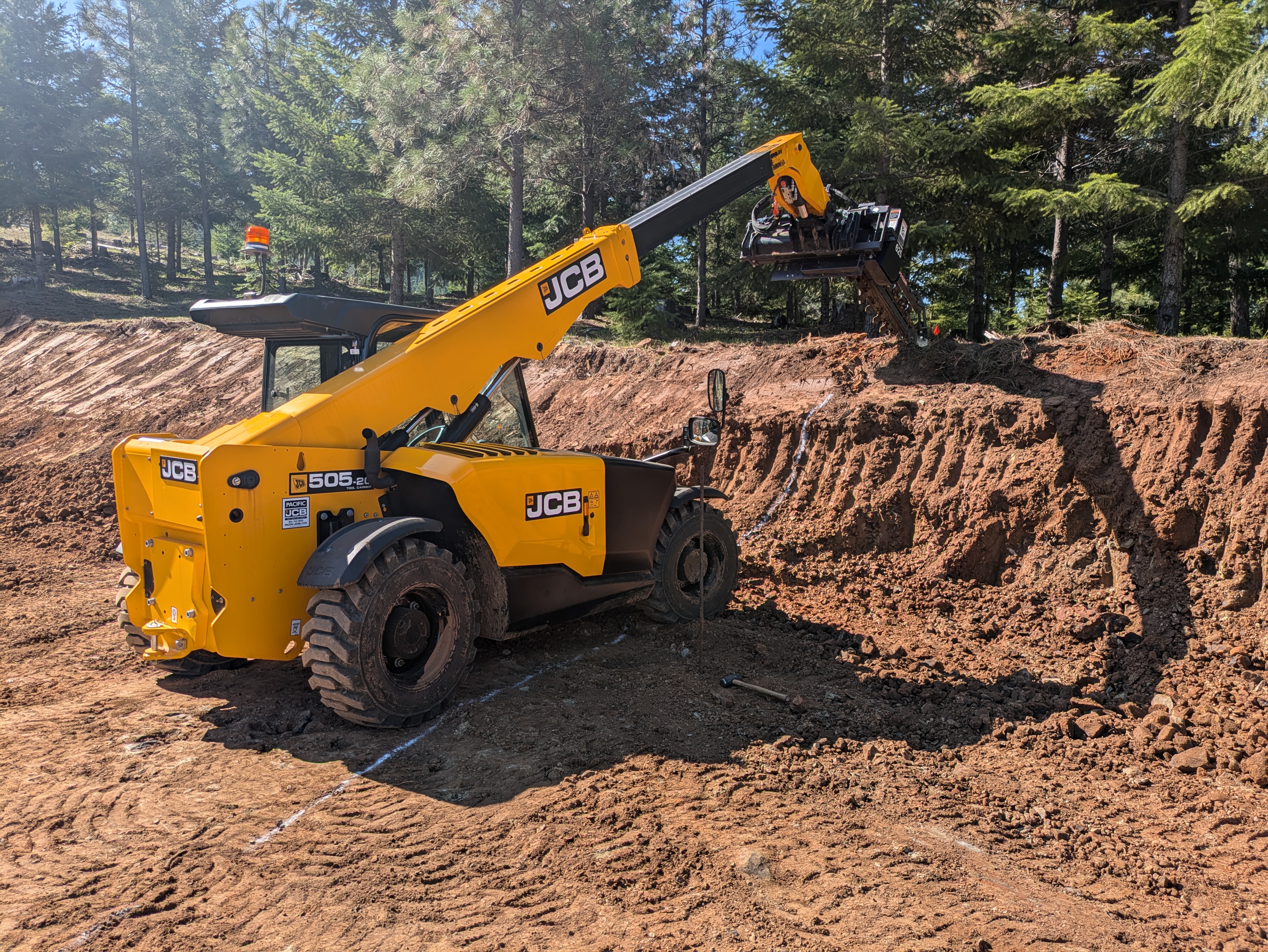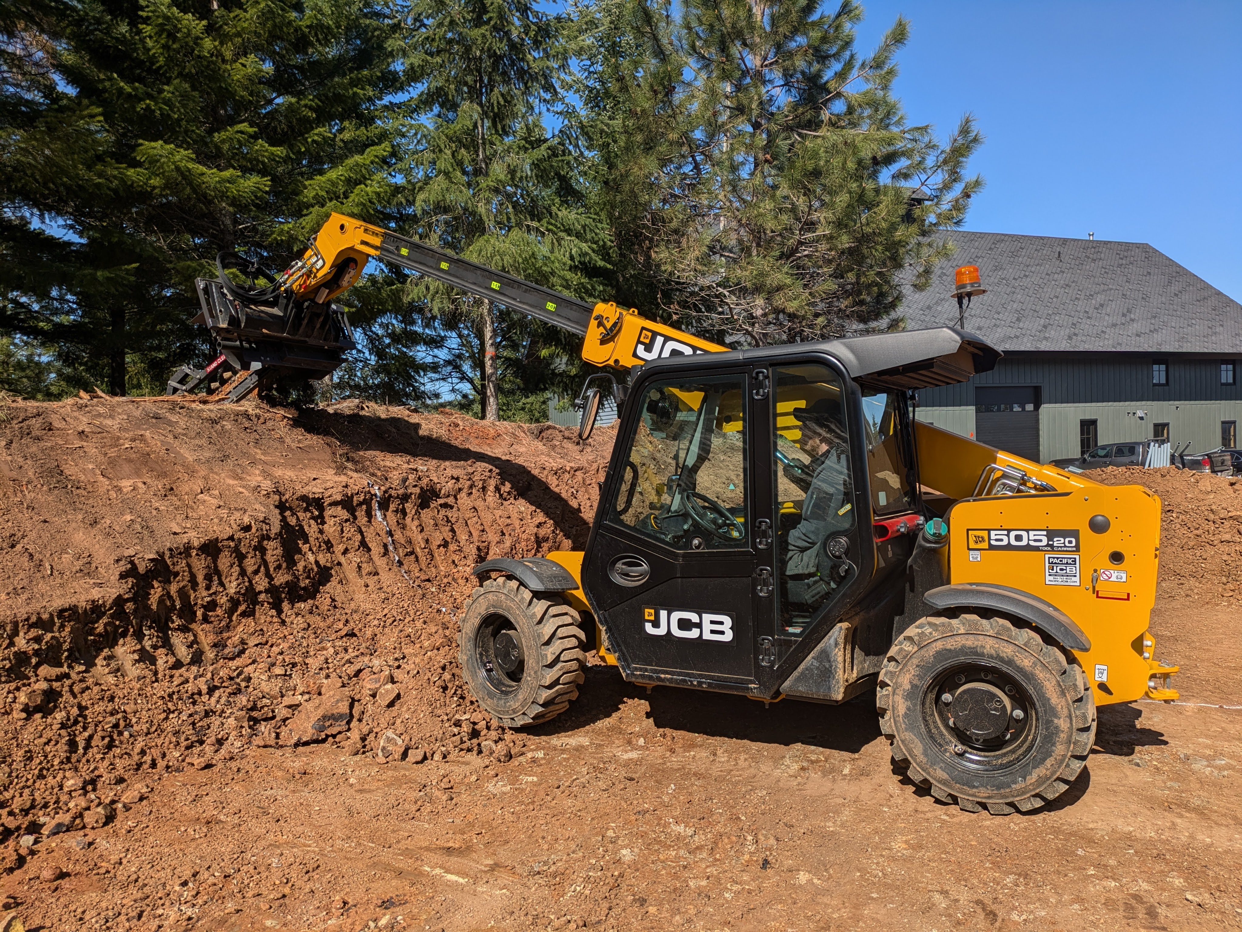 It was going well until we got to the bank behind the shed. The conduit had to come down the hill and end up 24″ underground. Good thing we have a friend with a trencher attachment that happened to fit our telehandler.