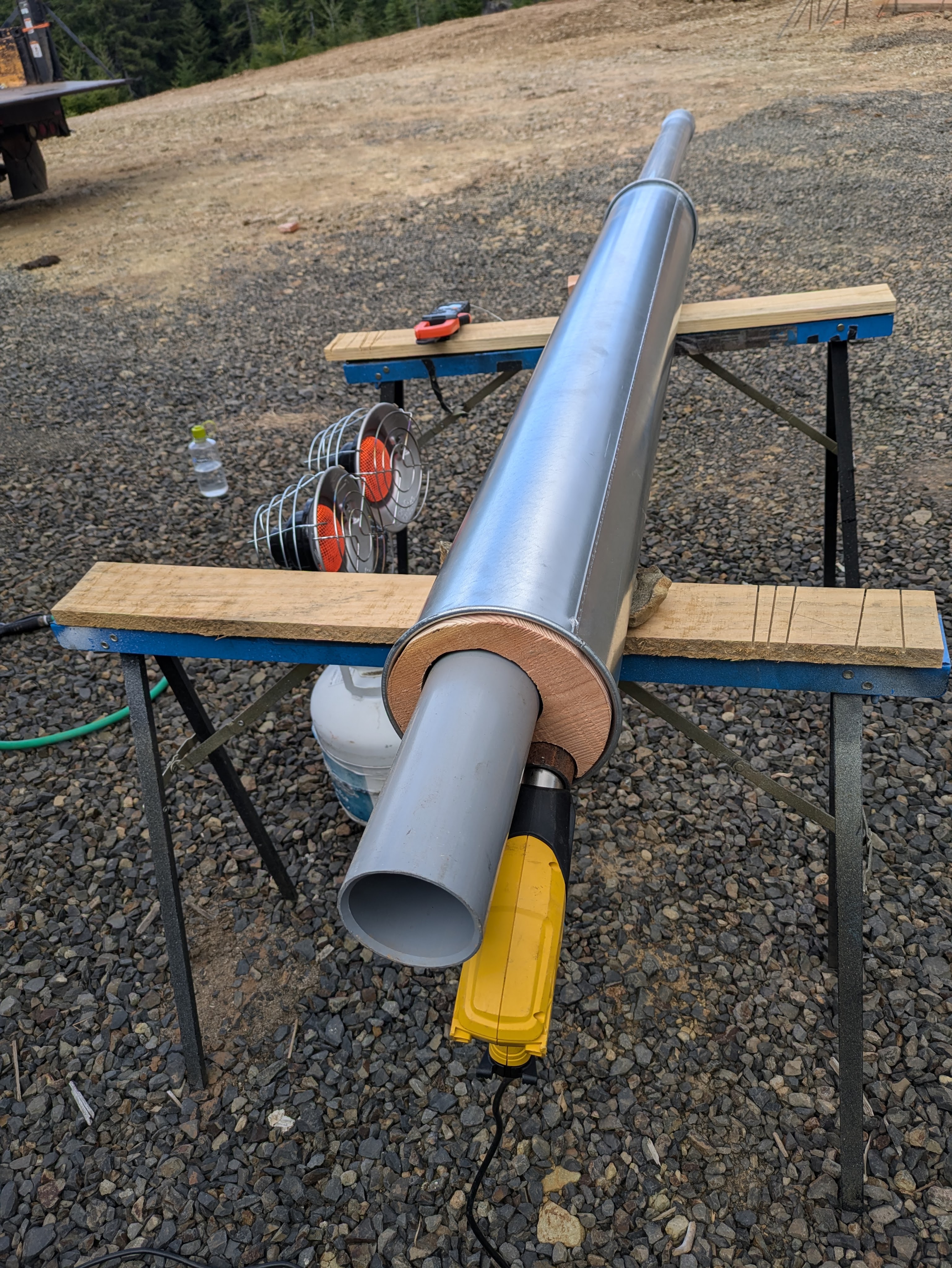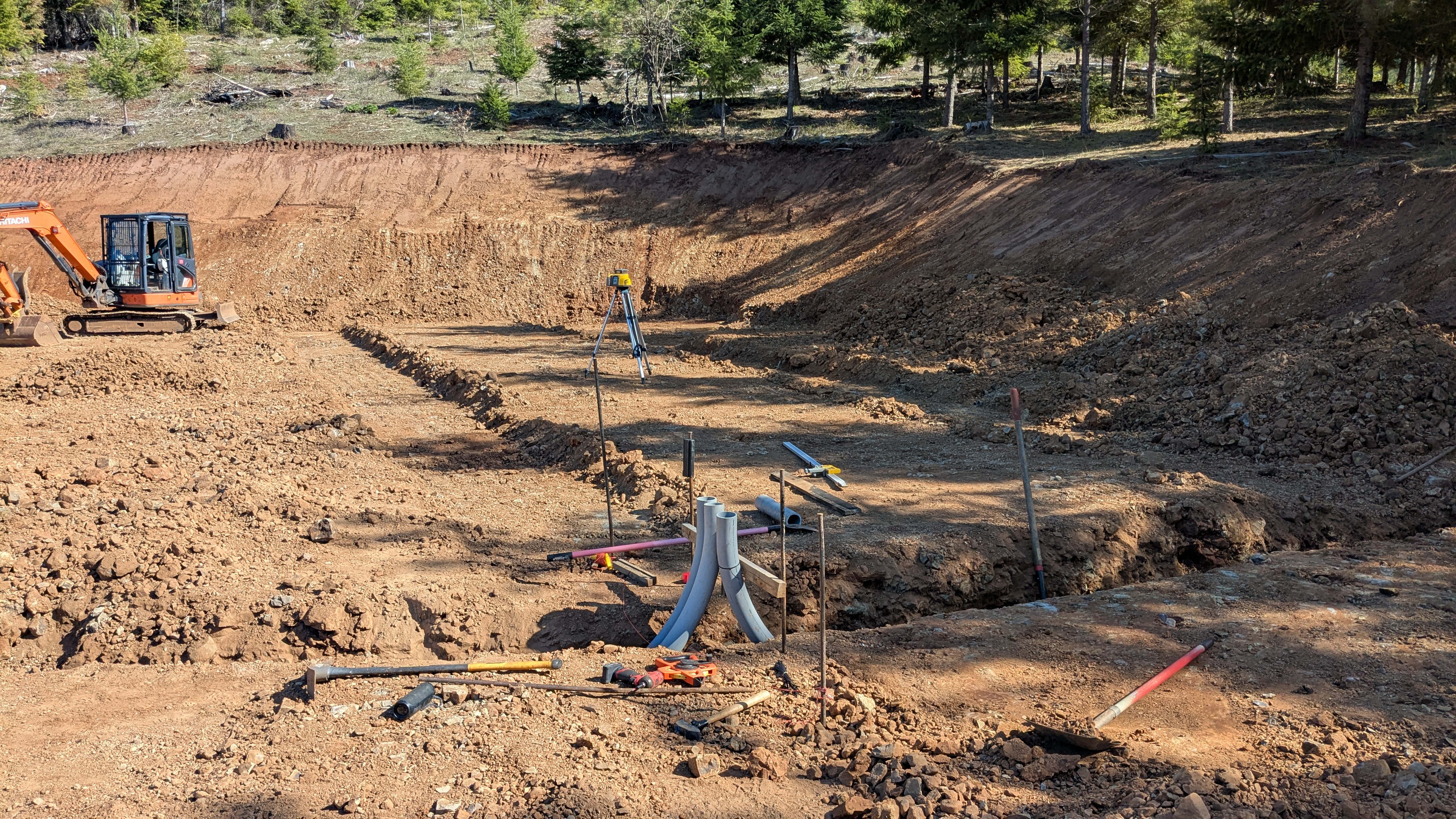 Laying the giant run of conduit went pretty well. We had to bend some pieces where it plunges down the hill. Sam concocted a tube heater with a chimney pipe, a heat gun, and a propane heater.