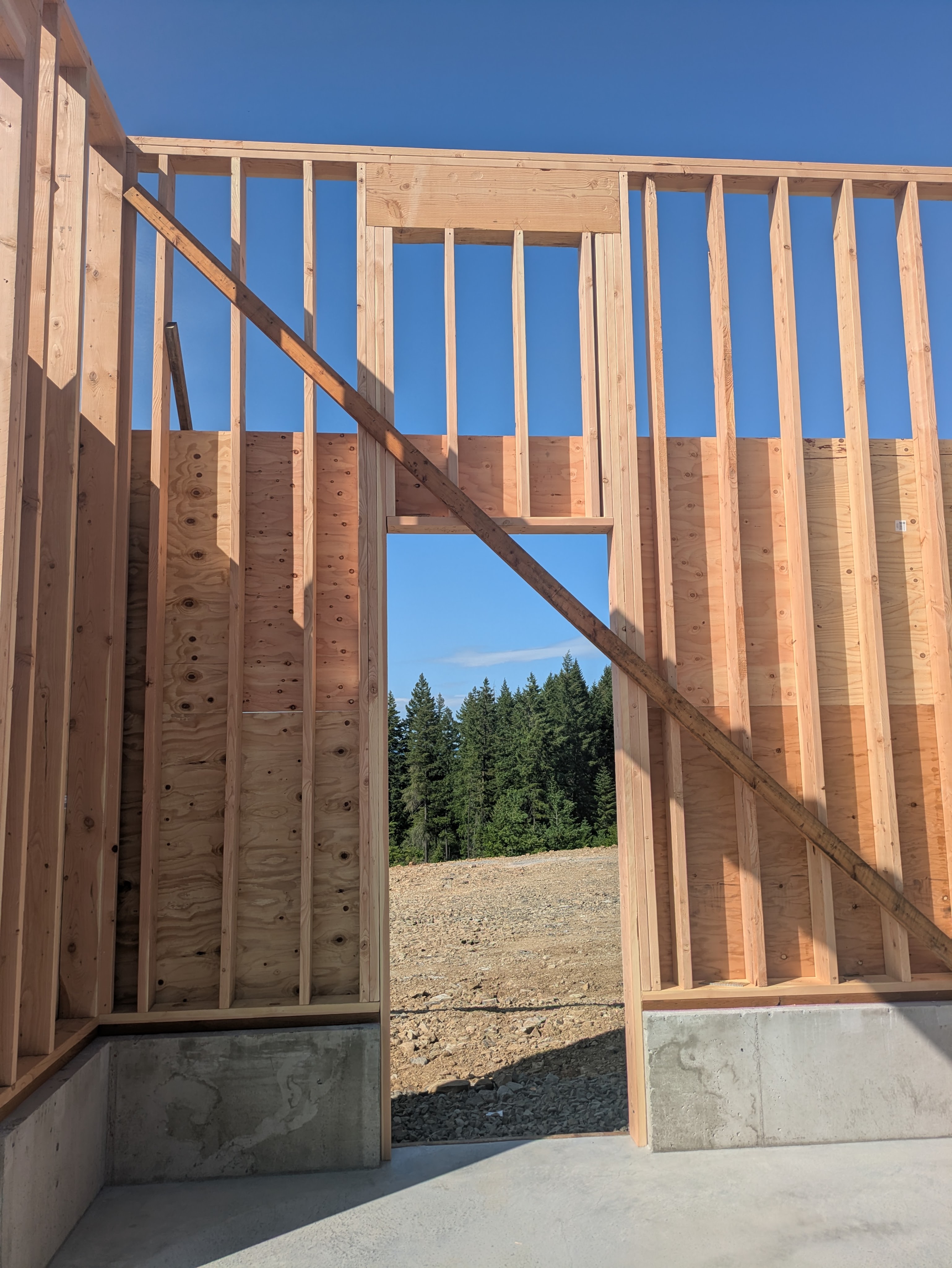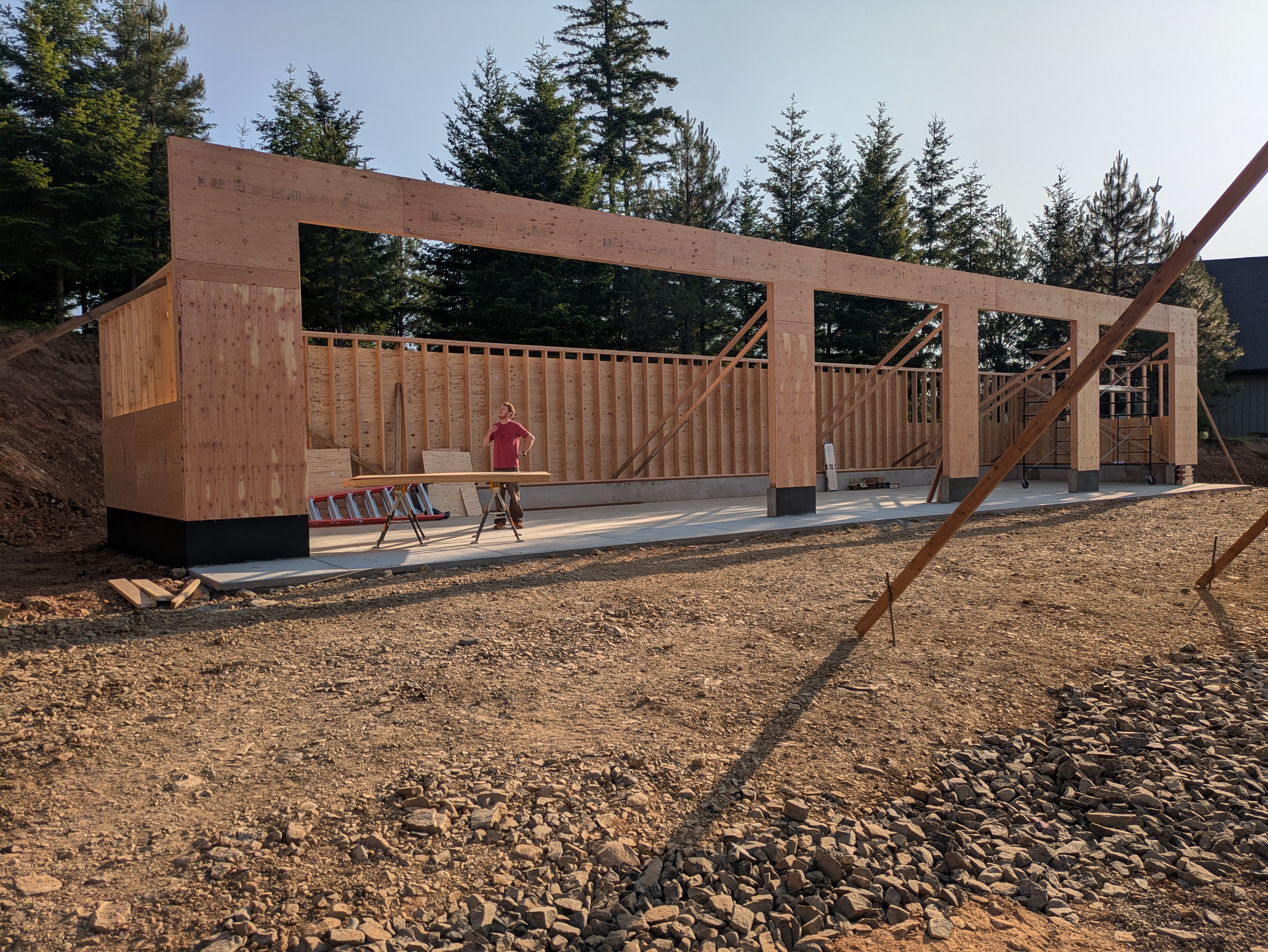 The garage has one shear wall in the middle of it. The wall also divides the space into two halves – a climate-controlled side for the nicer vehicles, and a non-temperature controlled side for the construction equipment. At the last minute, Matt convinced us it would be cool to put a garage door in the wall.