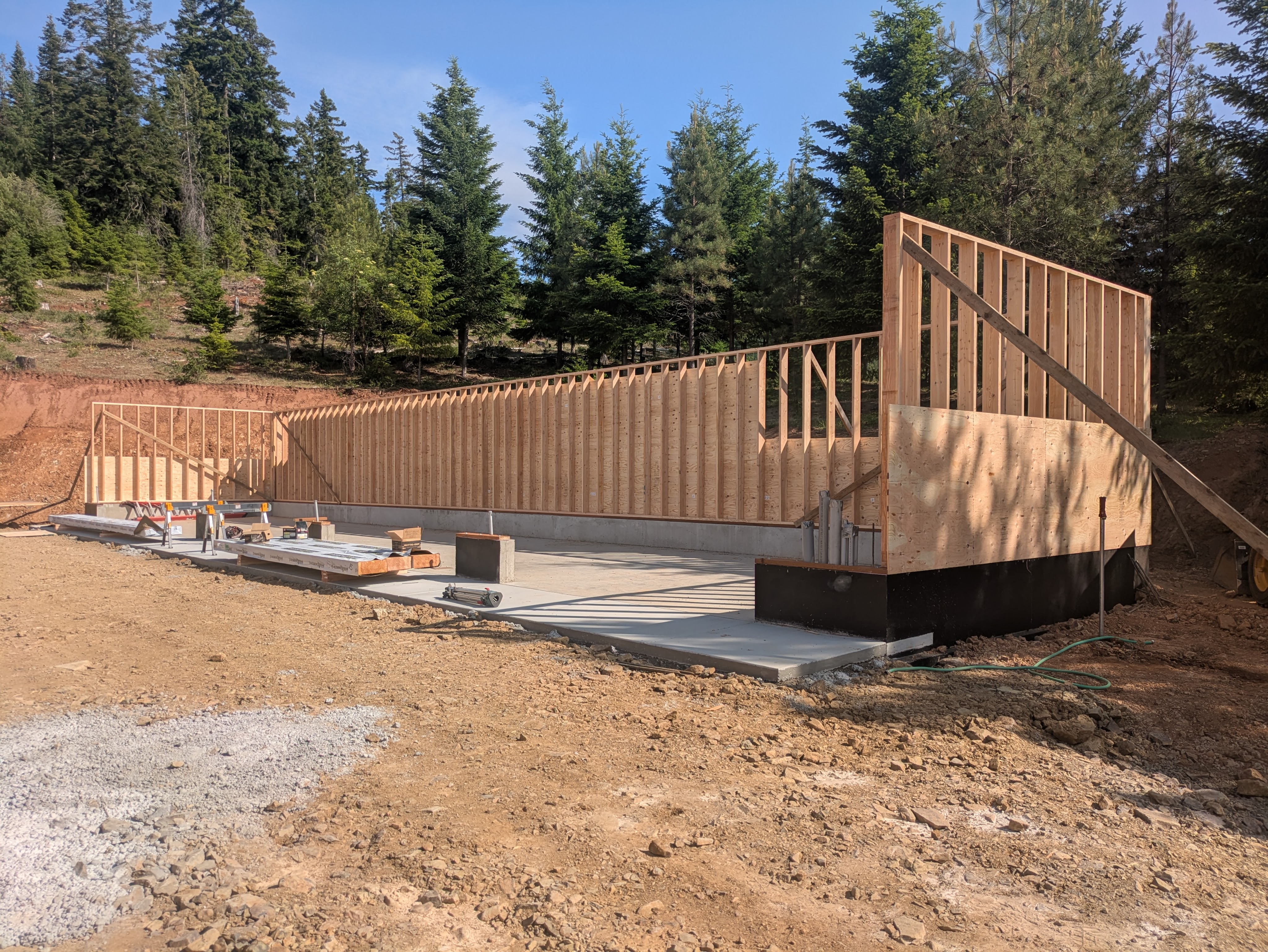 In one day, the crew constructed all of the stud walls for the garage. They assembled them on the flat concrete floor.
