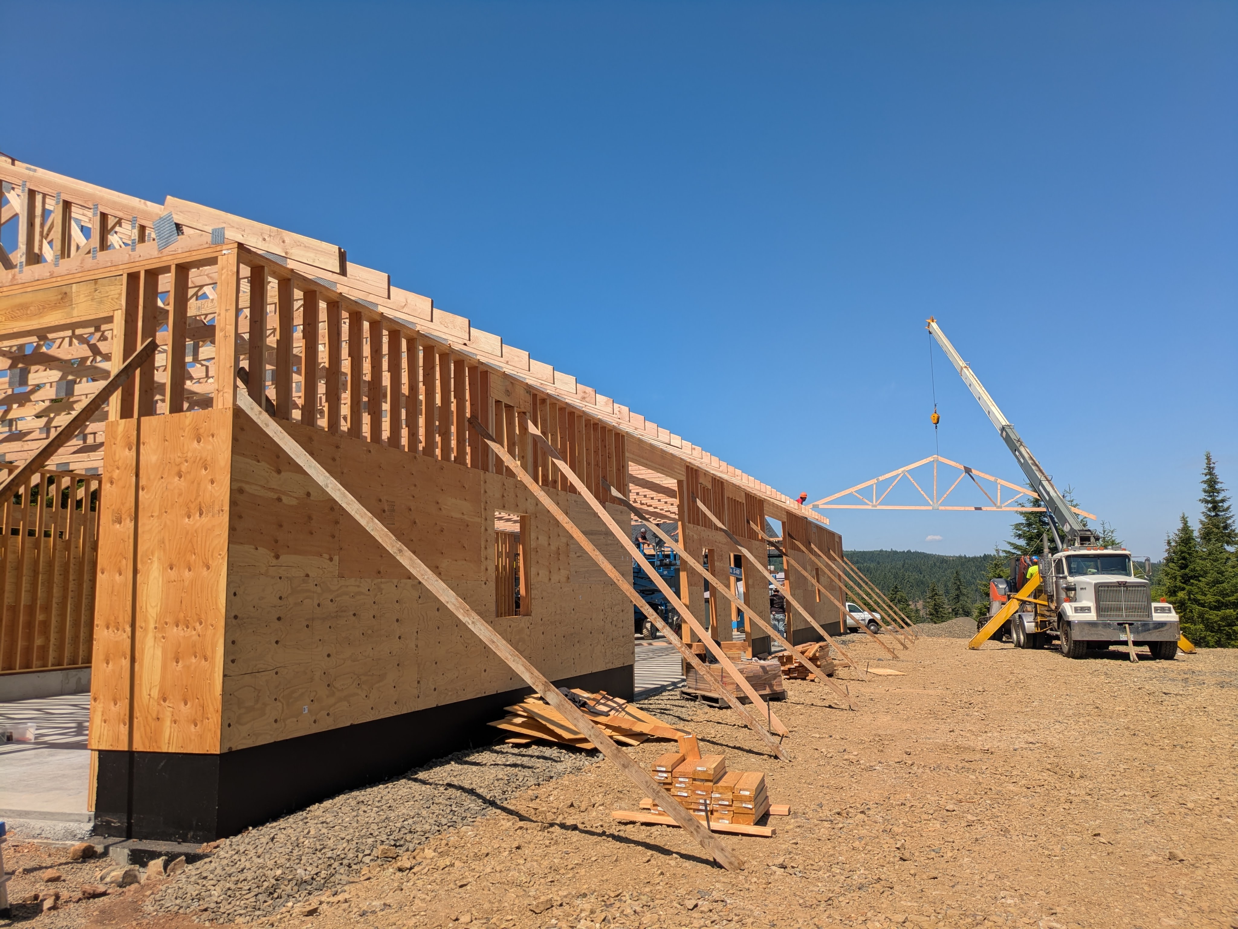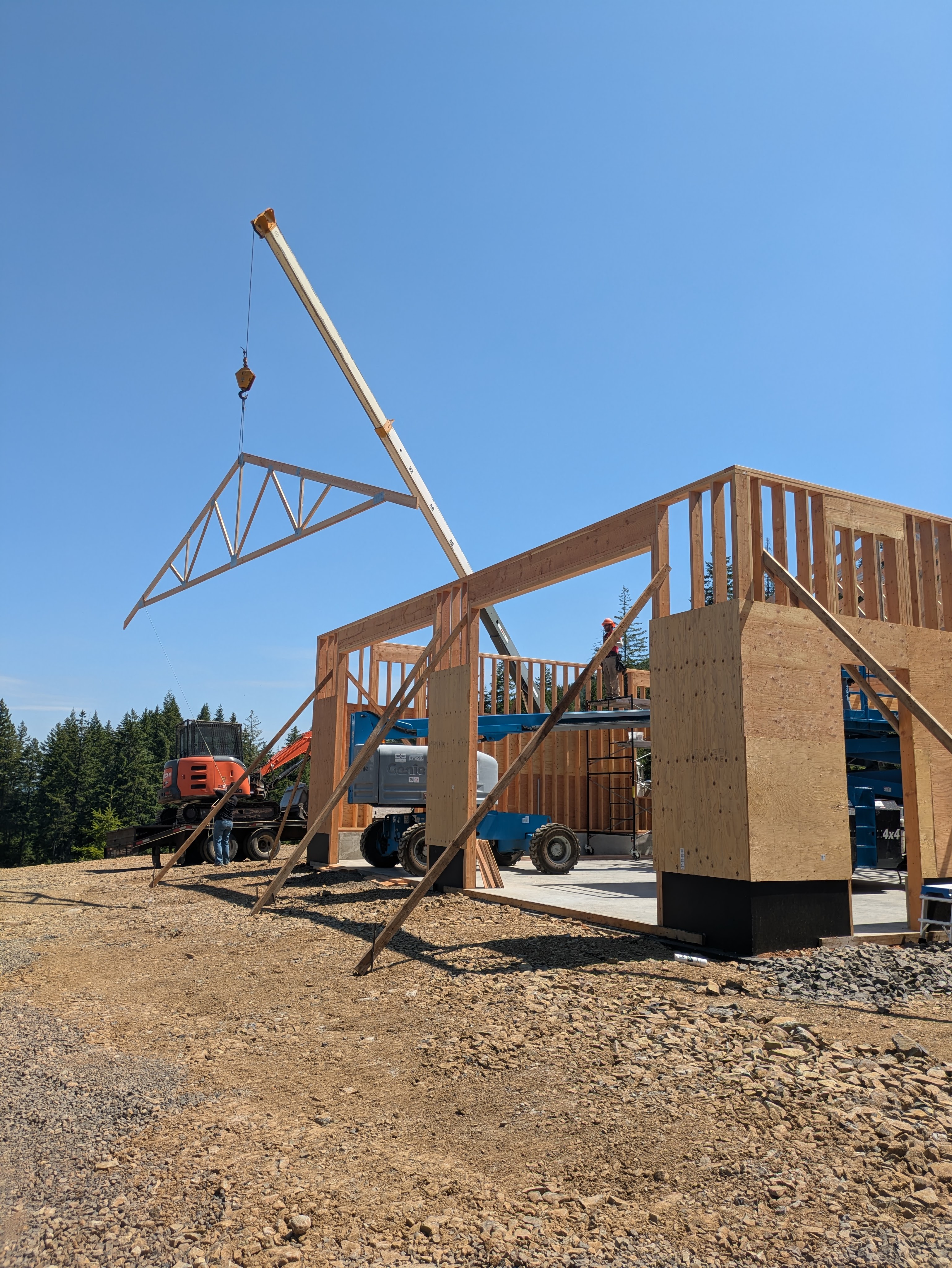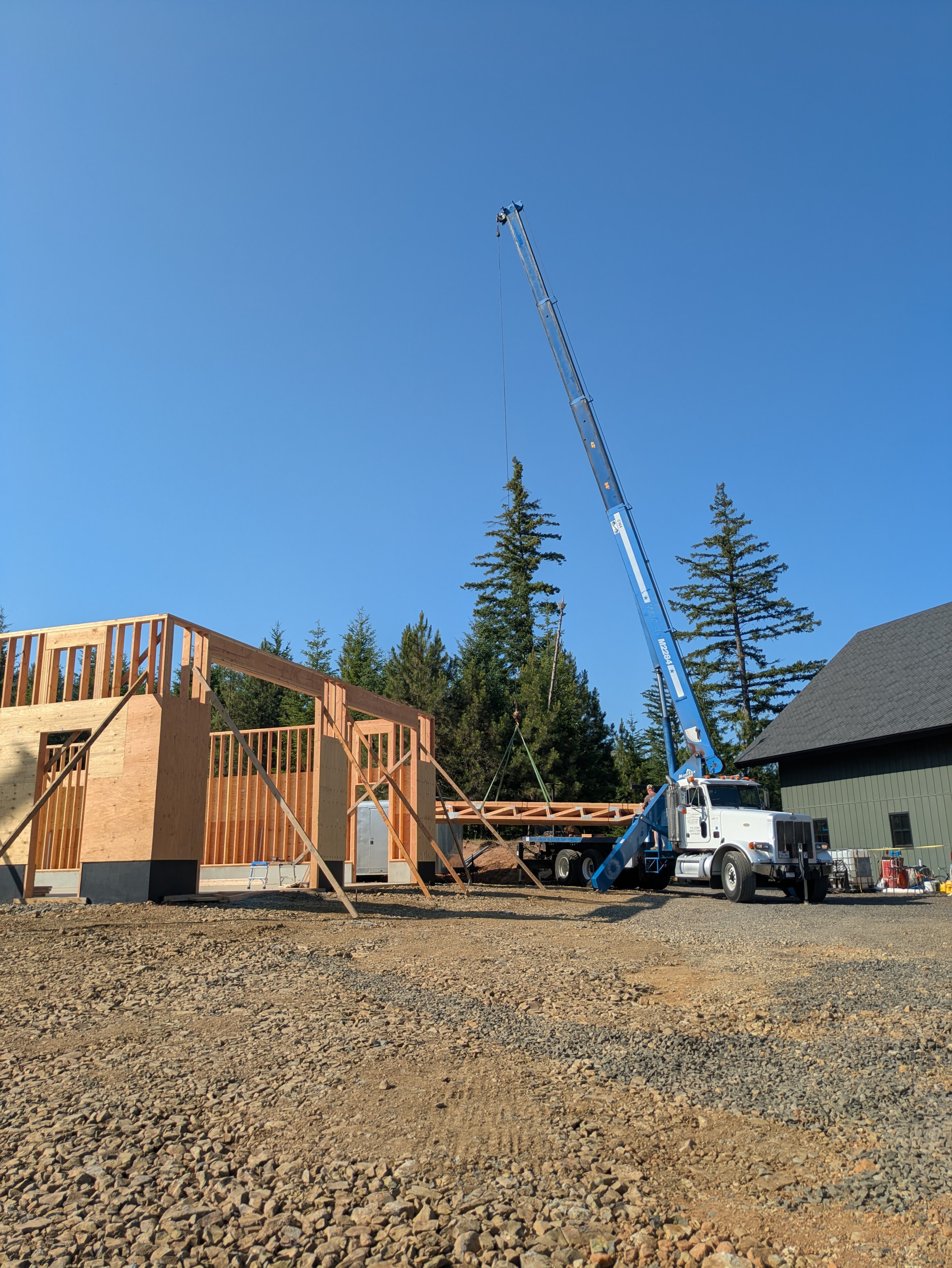 We kicked off the next week with the truss delivery! The truck was carrying more wood than a extra large log truck. I’m still baffled as to how the truck got here from the Portland area. It would either have to cross a narrow bridge and/or go through some low clearance tunnels. Teleportation seems more plausible.