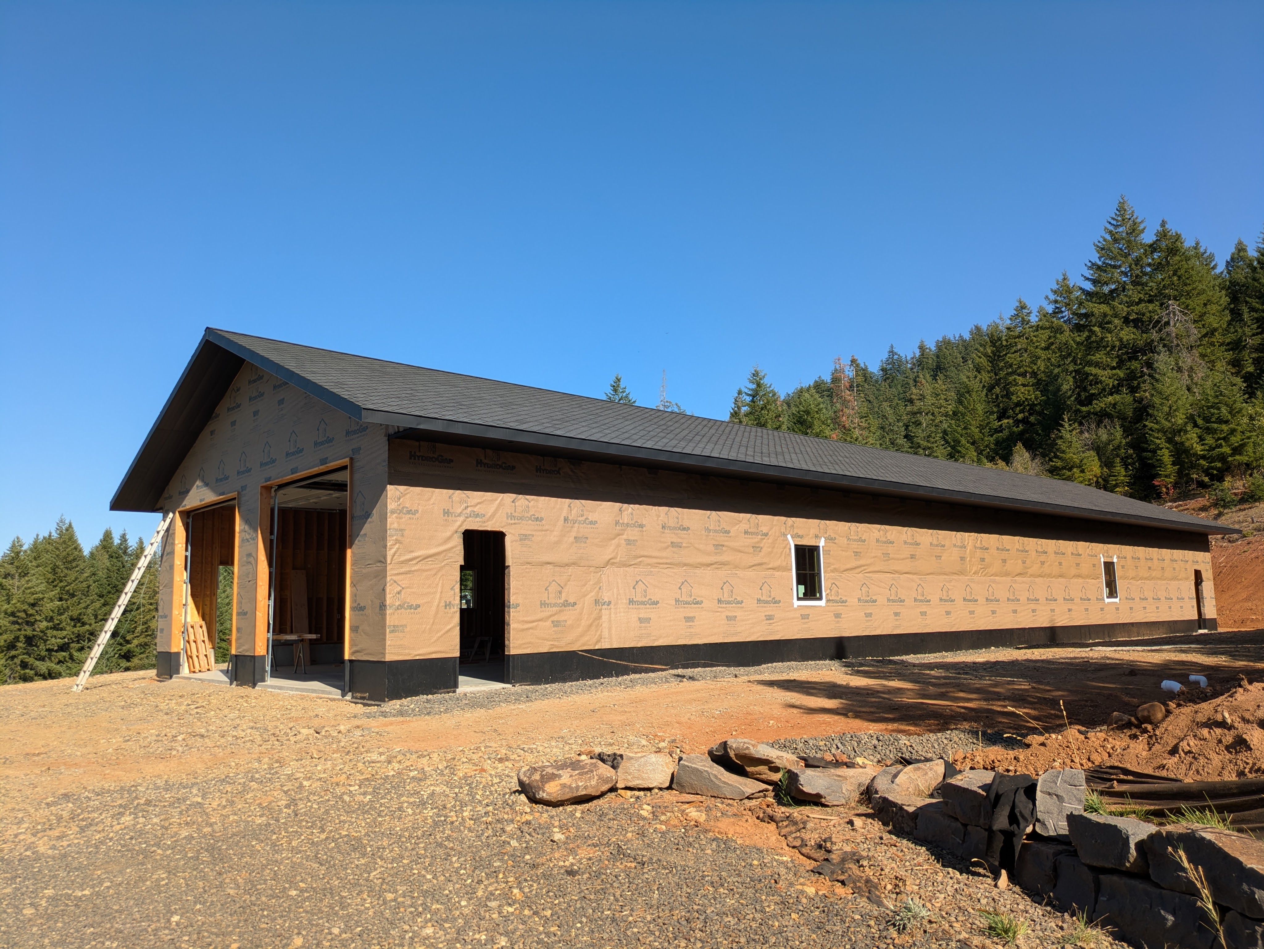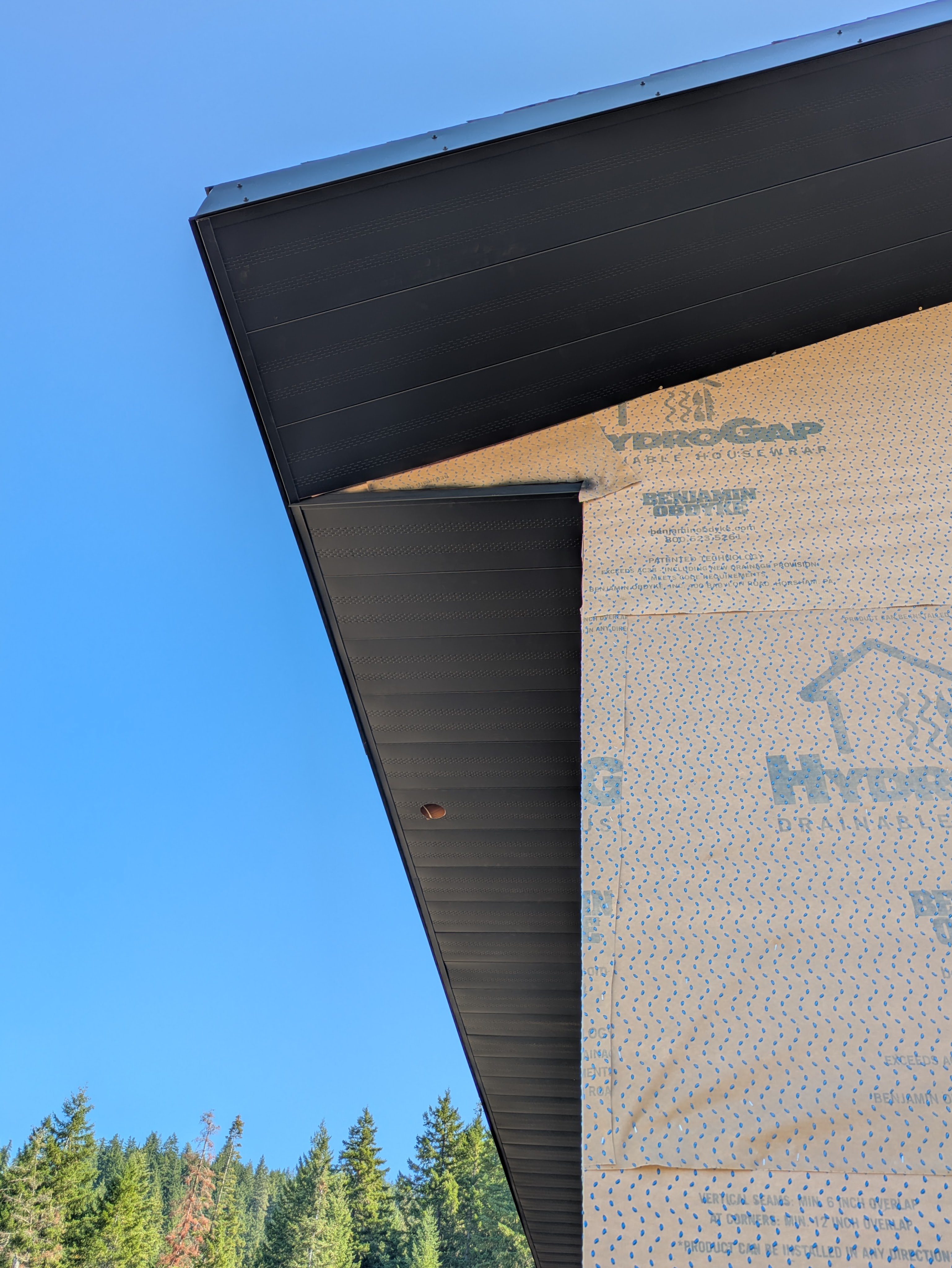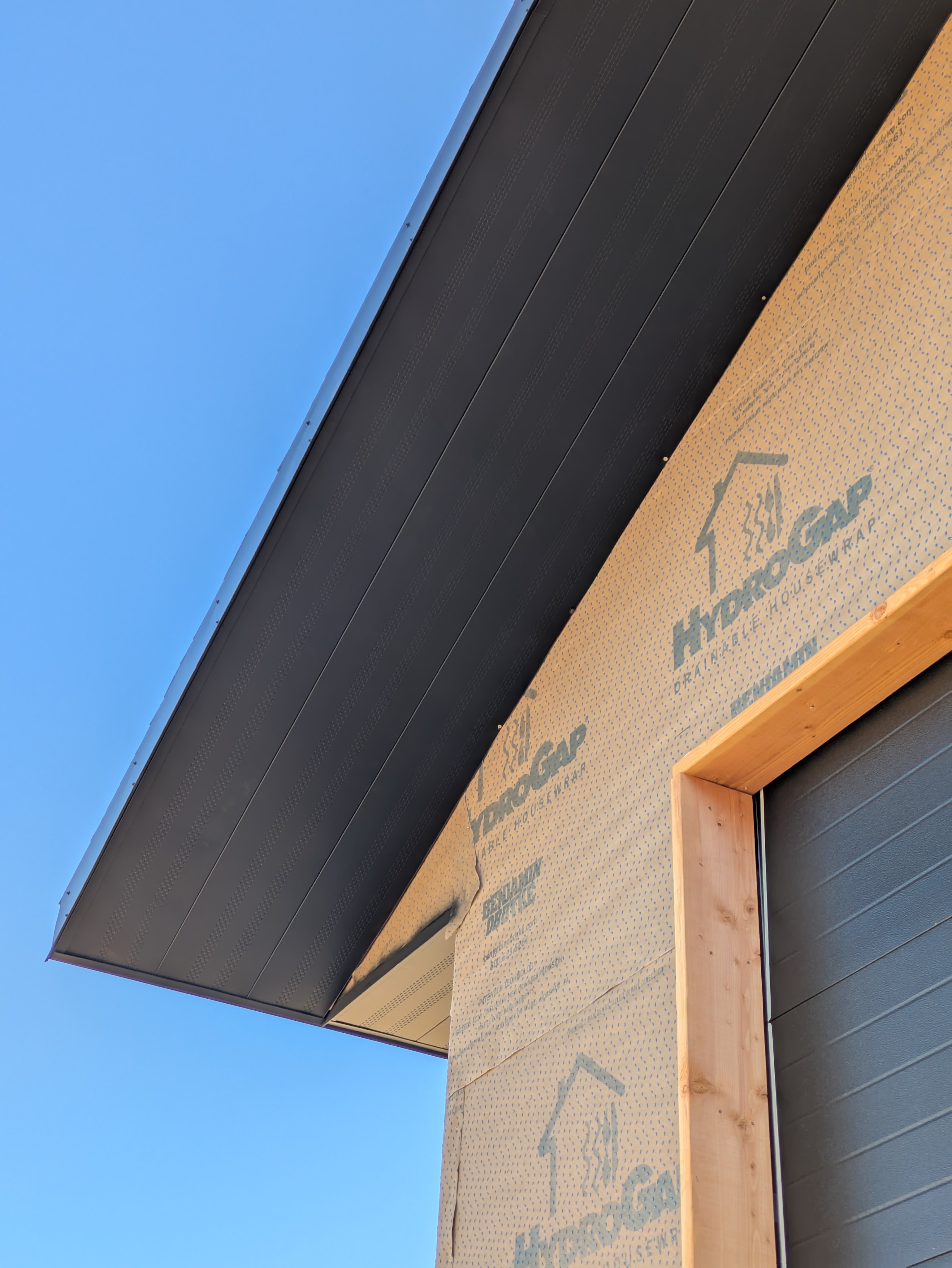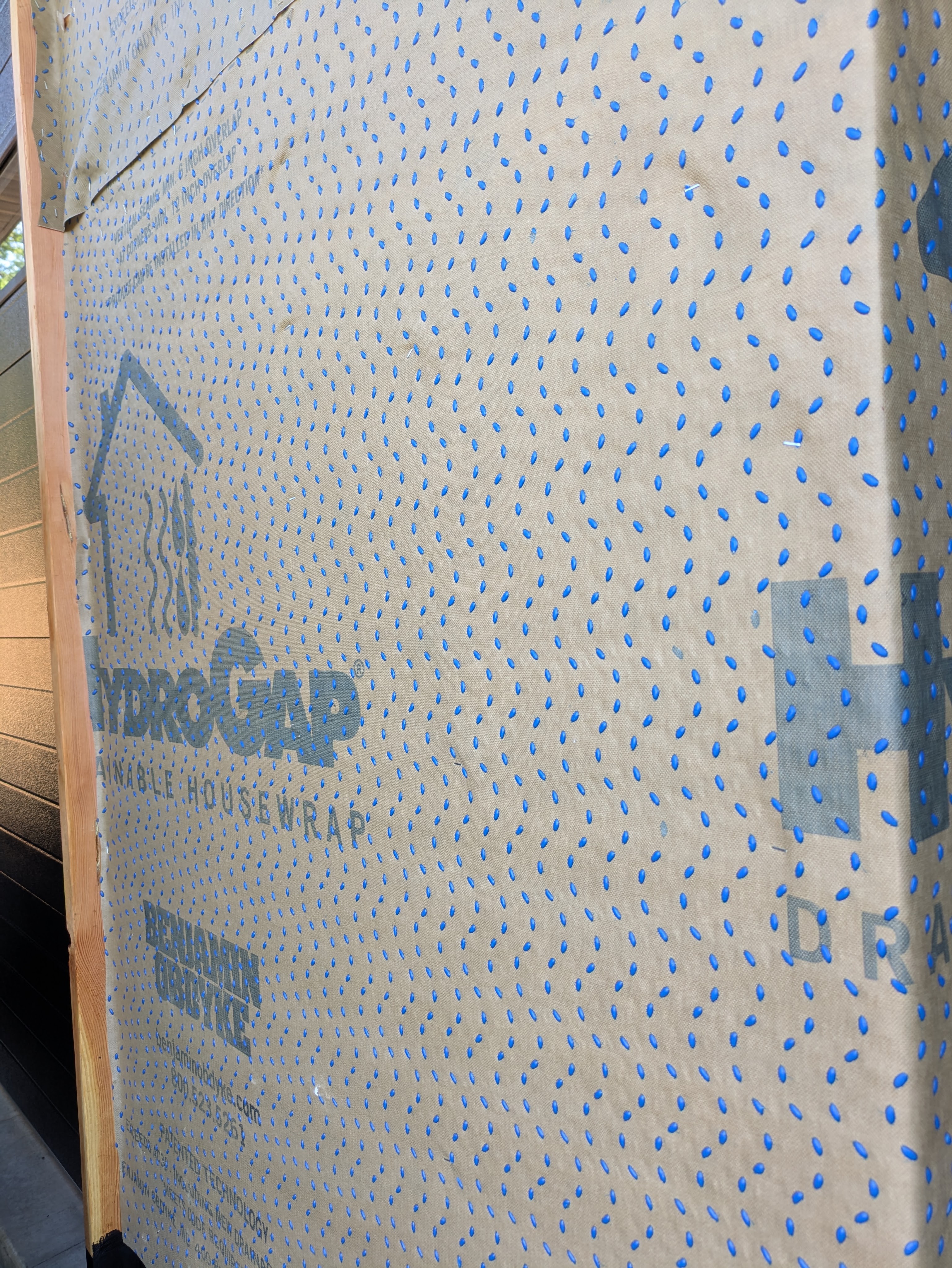 The plywood is currently covered in HydroGap housewrap, so it will be protected if the Fall rain arrives before the metal siding. It’s like Tyvek, but it has little bumps that create a gap between the surface and the back of the siding.