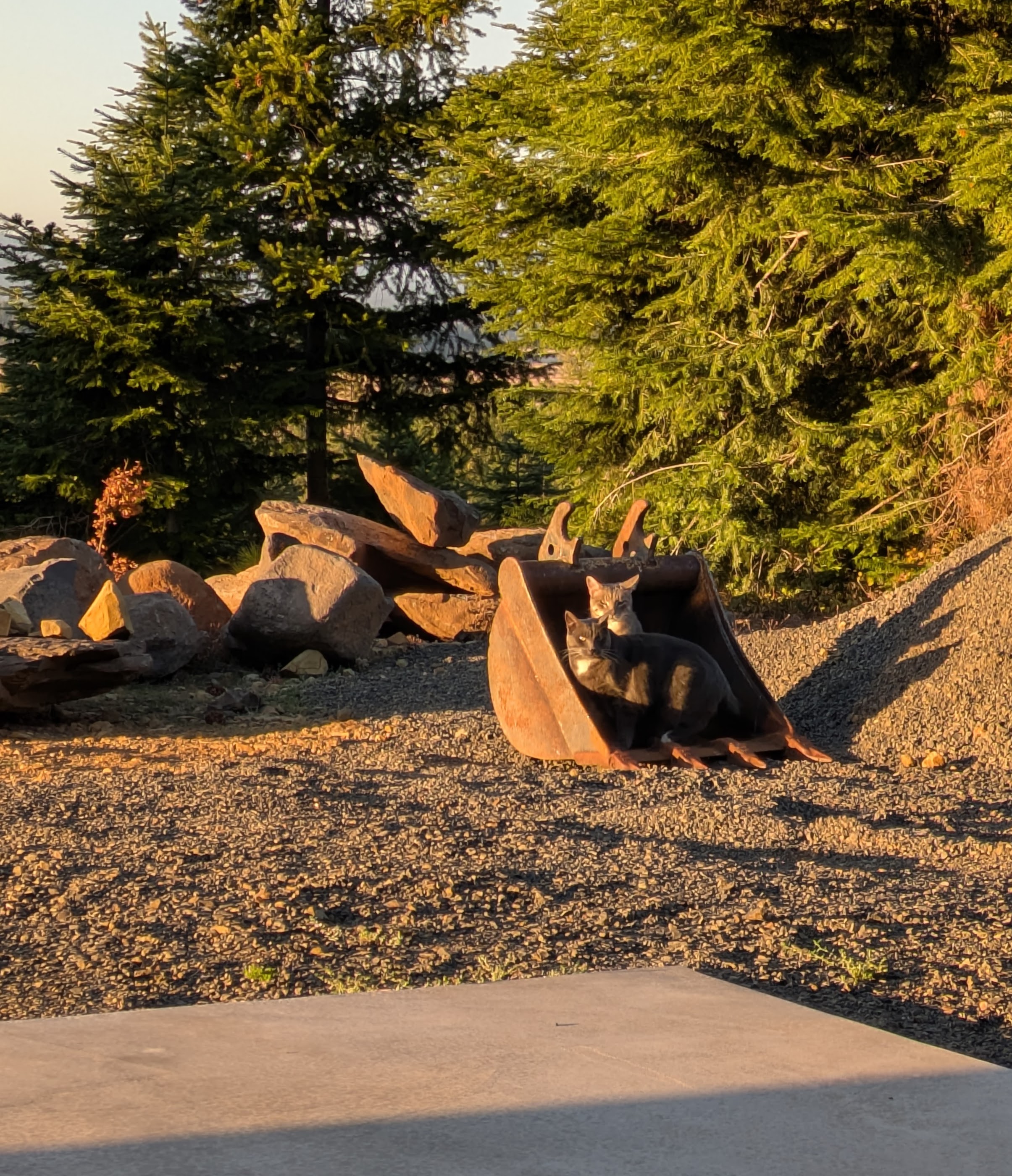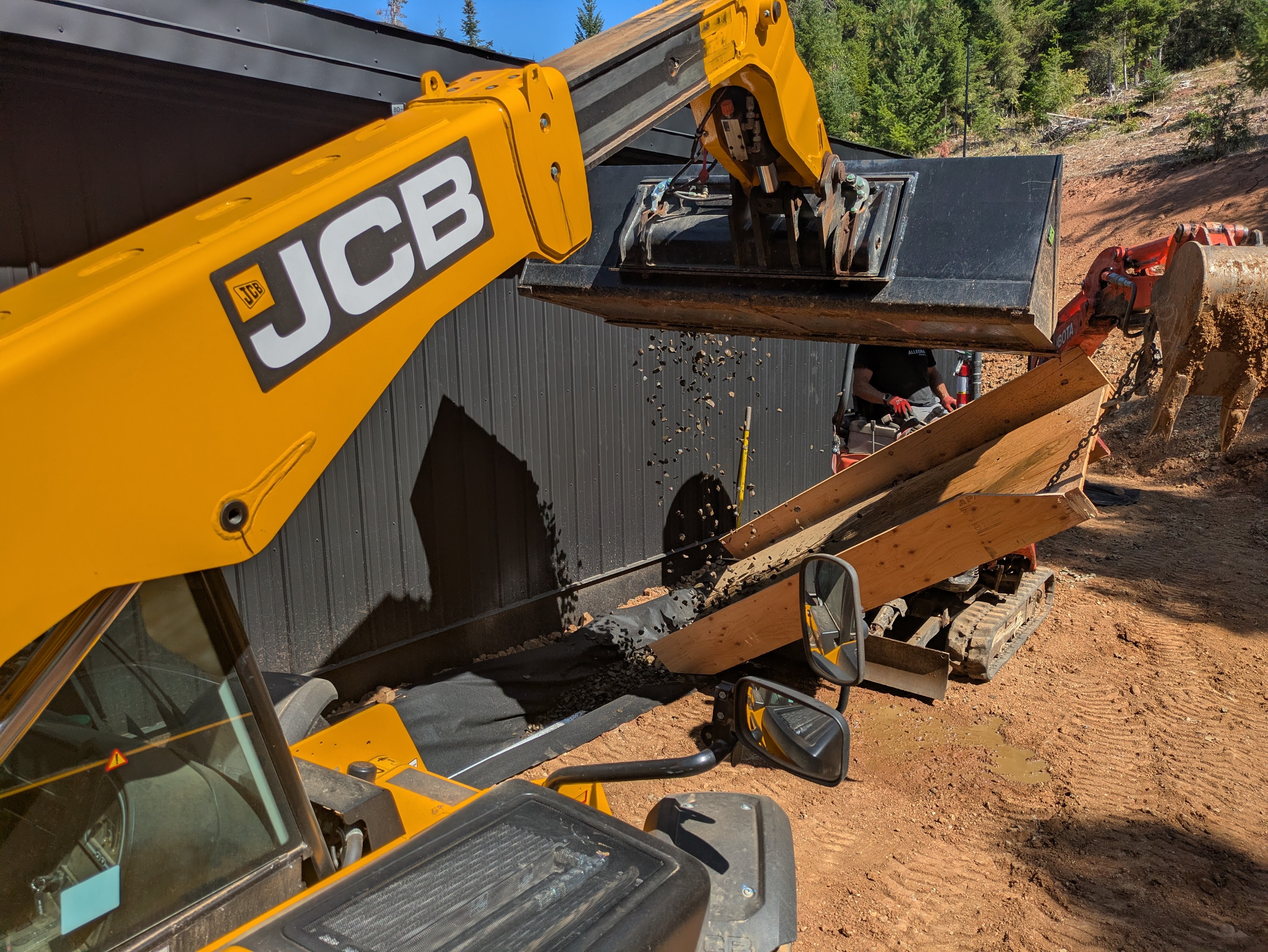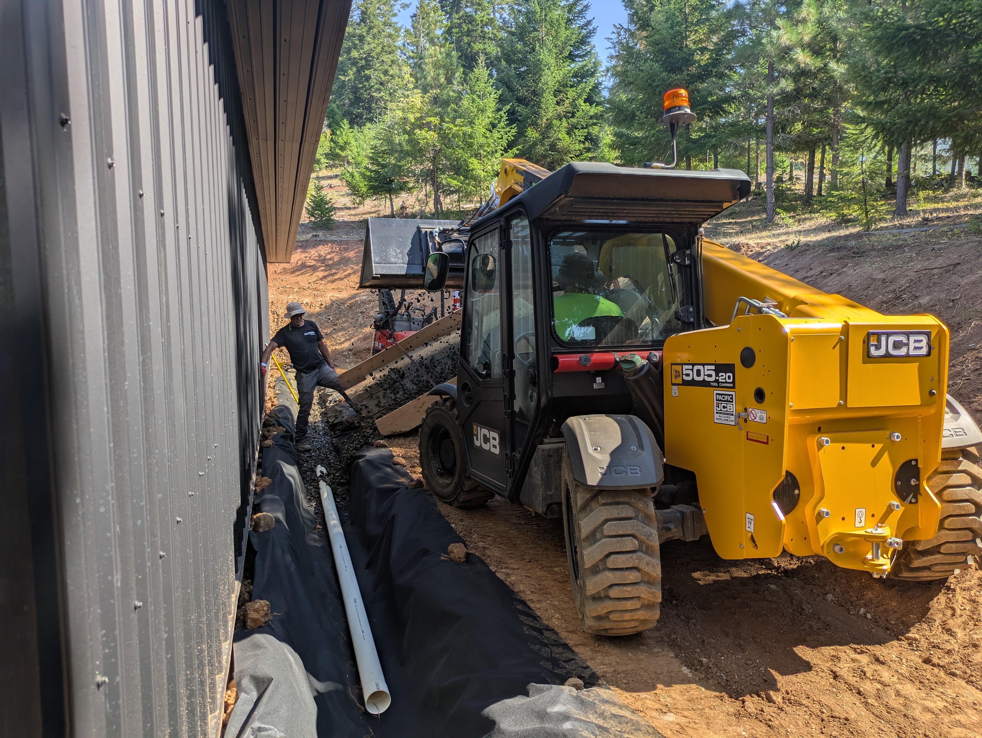 Sam also buried the remaining sections of drain pipe! There wasn’t enough room behind the shed to get a machine in sideways, so Sam got creative.