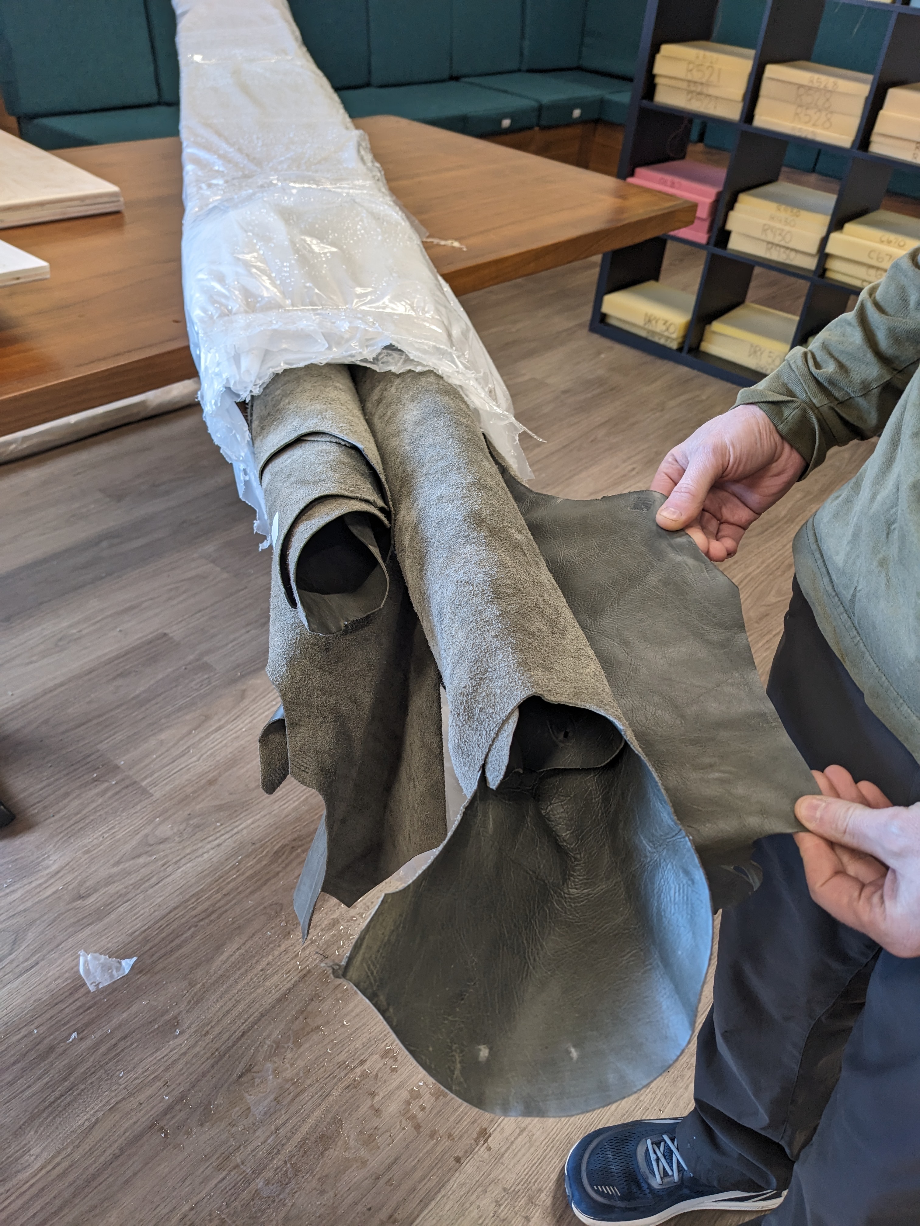 I immediately called the upholsterer to see how many hides I needed to order. I had no idea leather is sold by the hide rather than the yard. I got 4 beautiful hides. (This was back in February 2024.) Then we squirreled away the hides for over year.