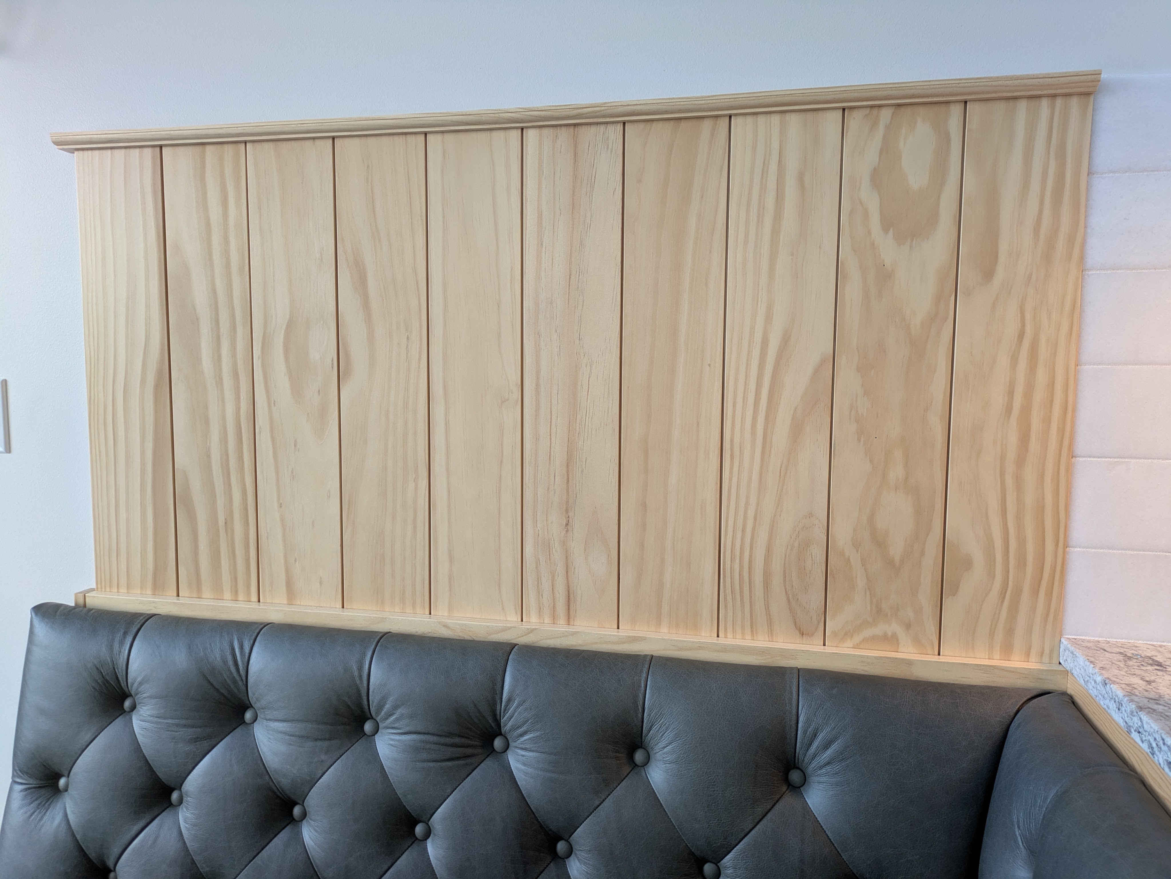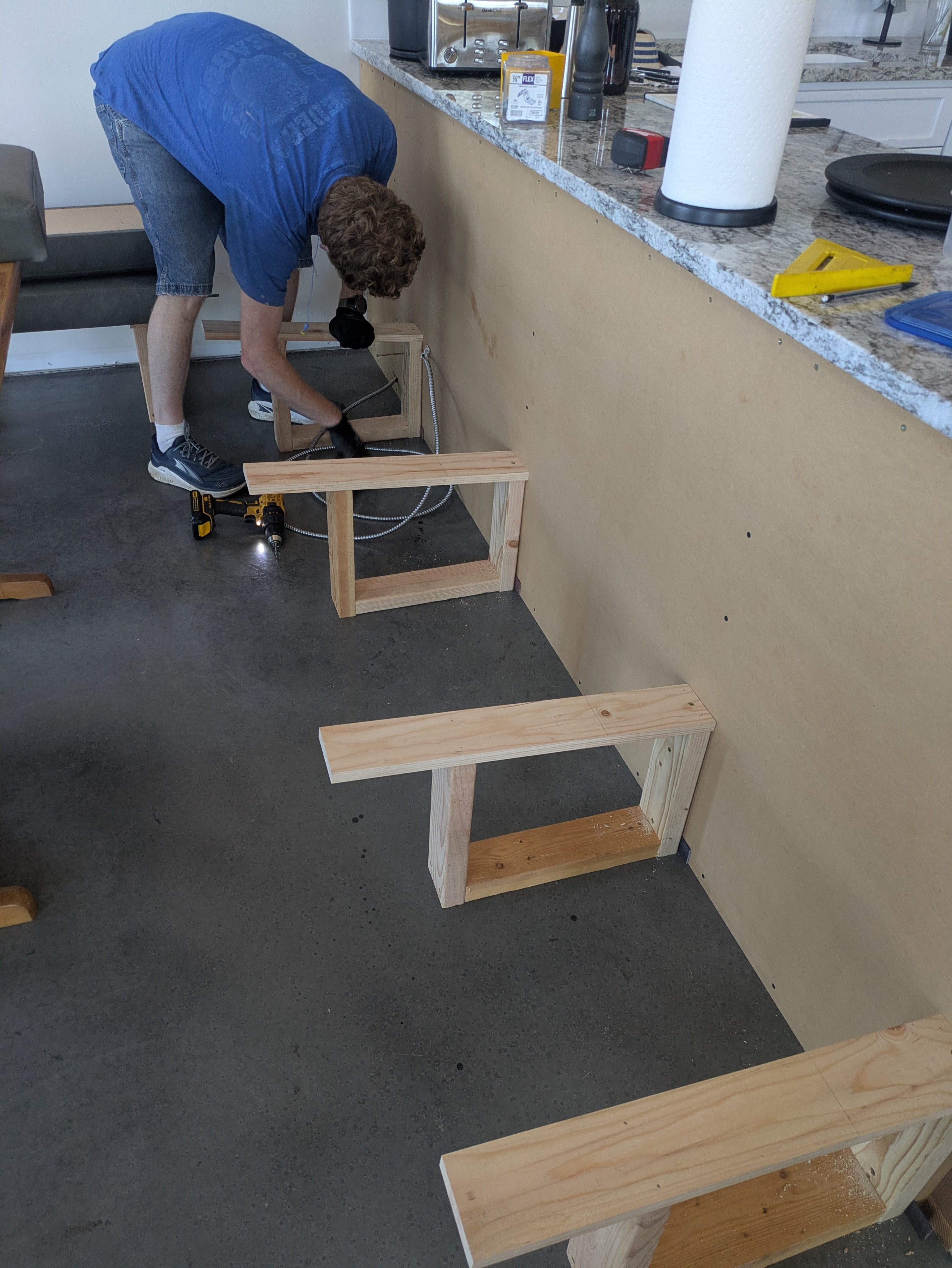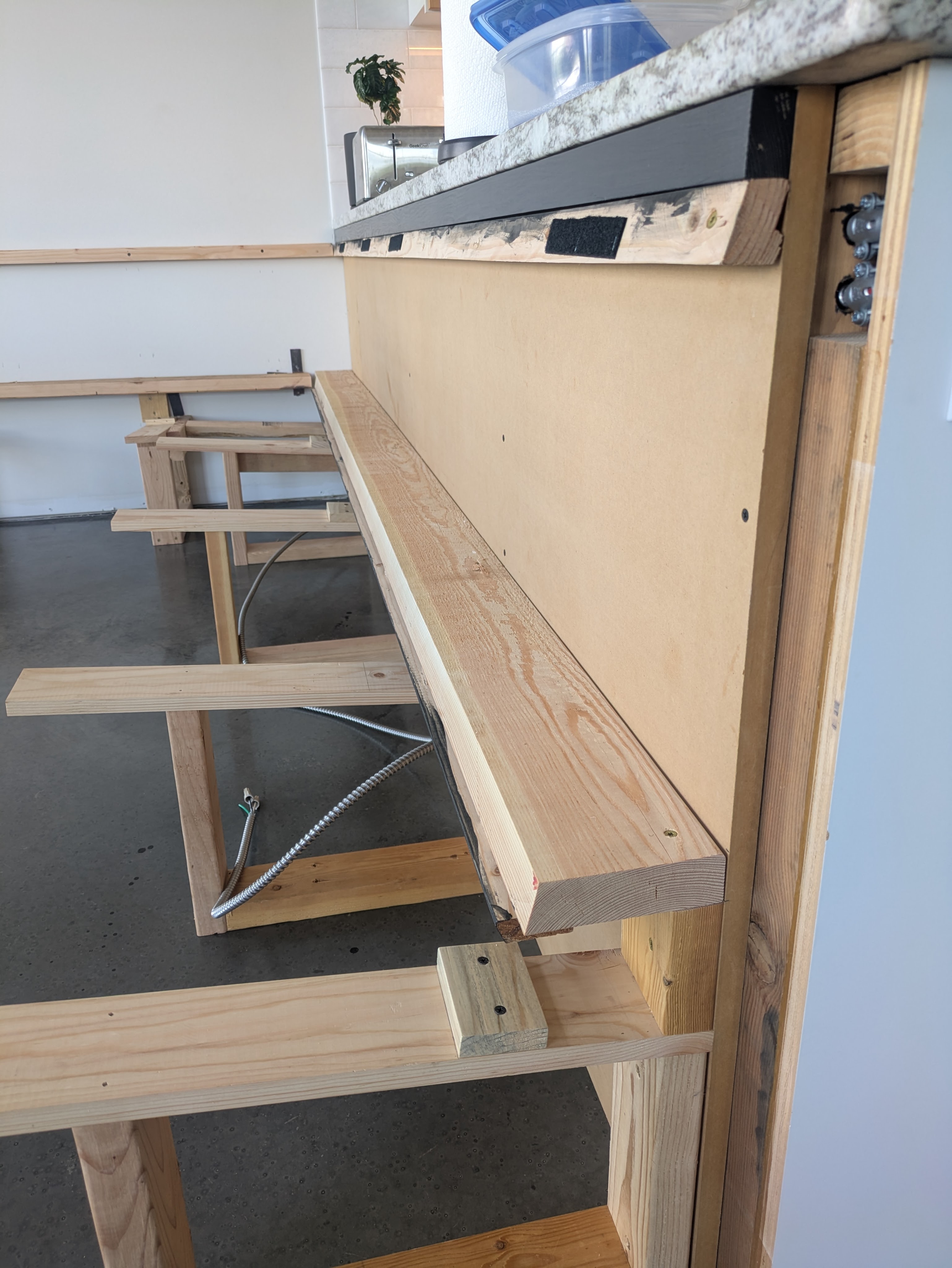We didn’t bother to model the framing, nor did we build the frame ahead of time. This allowed us to make adjustments to accommodate the upholstered pieces. However, we didn’t have much wiggle room due to the counter height and other constraints. Everything worked out!