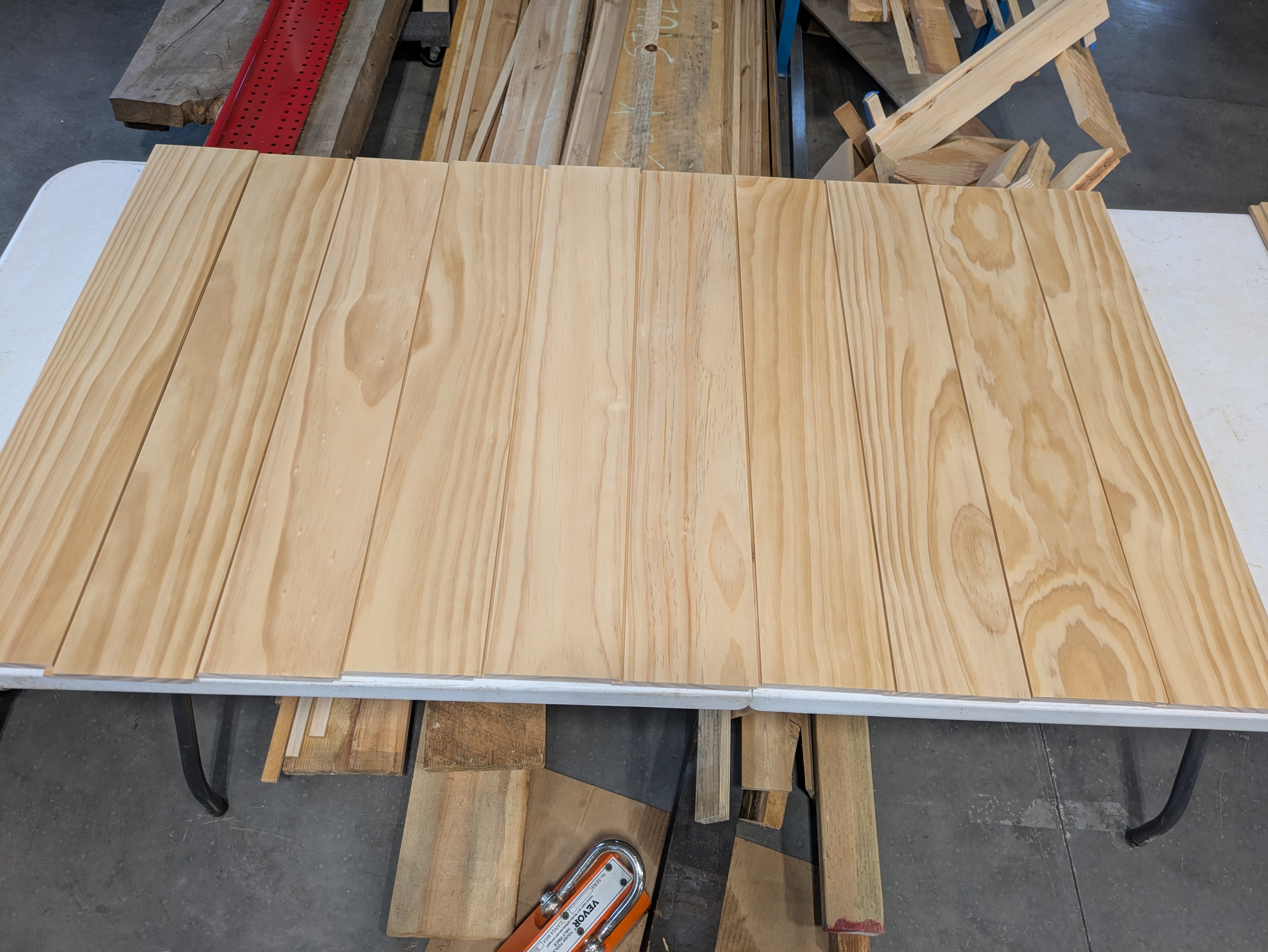 We decided to change the look to natural pine and ordered a bunch of 6″ pine boards from Lowes. They arrived the next day before I could change my mind again. We used the shaper to cut a shiplap profile on all the boards. Sam sanded all the faces while I sanded a small radius along the edges. Then Sam sprayed them all with our trusted clear coat.
