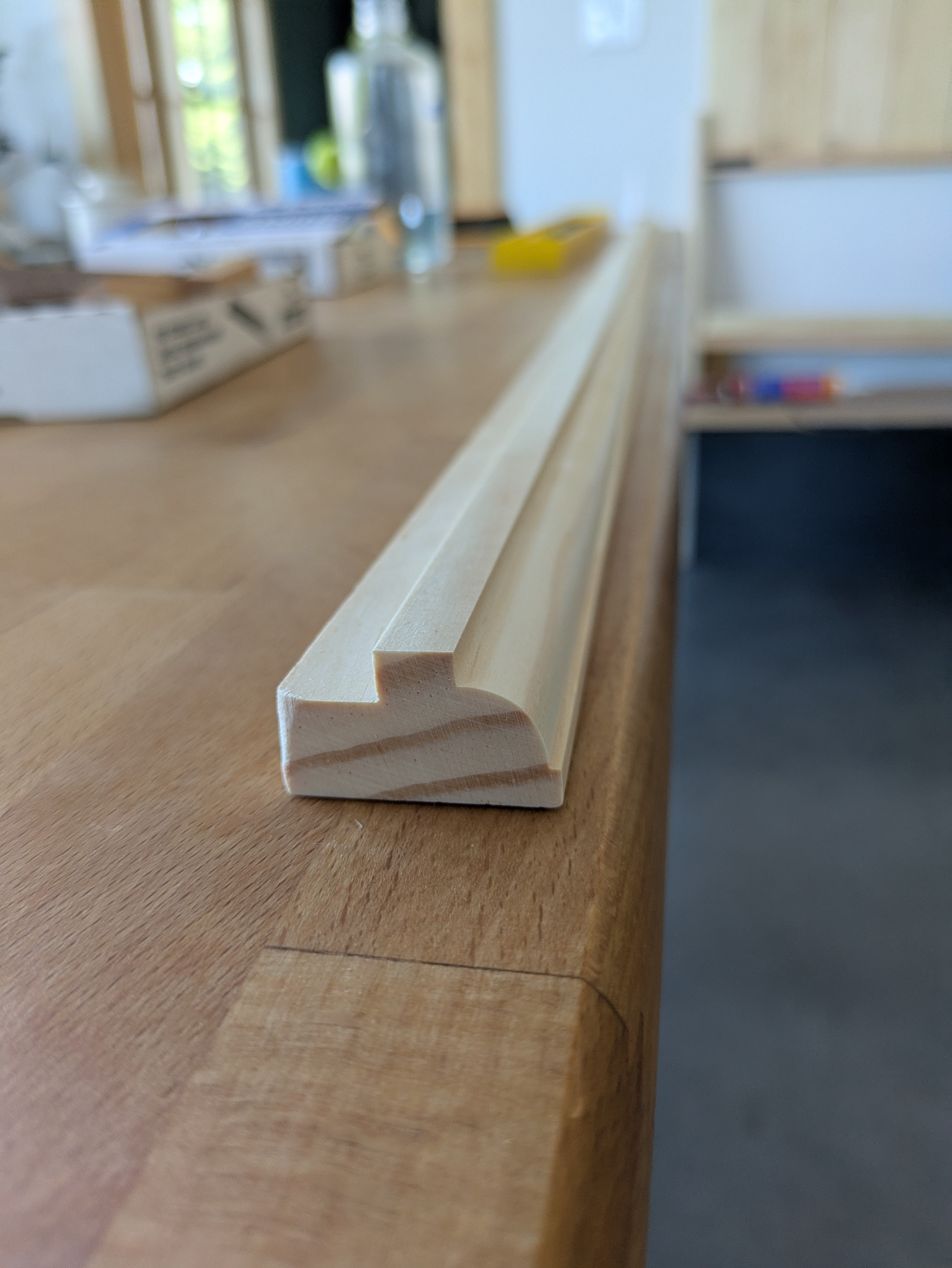 Sam happened to have a router bit with a similar profile. The trim board was small and narrow, so Sam made a jig for the router and we fed the board through it. I think it turned out well.