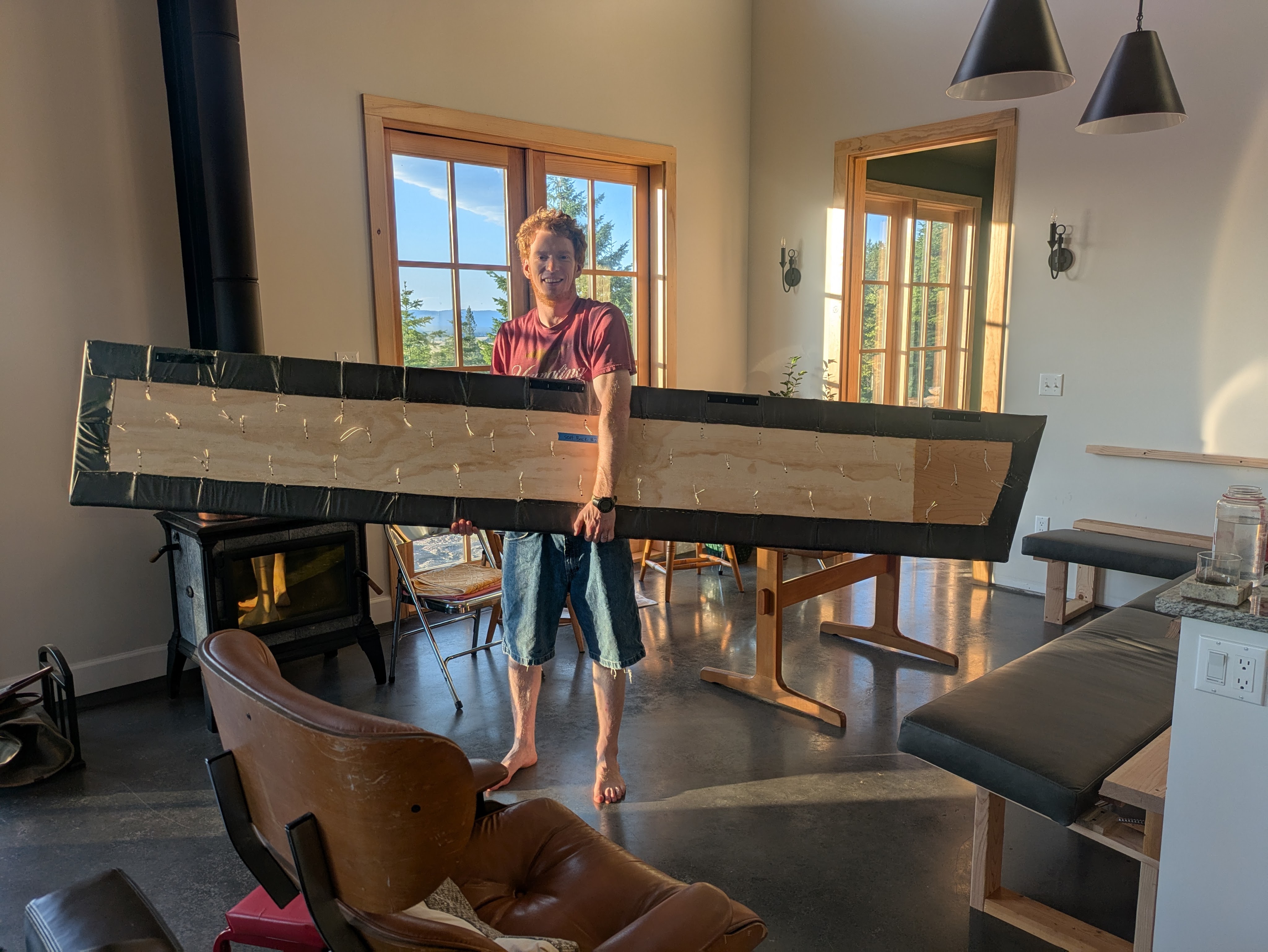 We brought all the wood and leather to the upholsterer. It was a sunny day when we departed for the big city, but we wrapped everything up in plastic to keep the materials clean of dust and debris. Luckily we did that because it started pouring down rain and hailing as soon as we entered Portland. The upholster immediately recognized us when we entered – “I remember you guys…” He was smiling, but I doubt he was smiling on the inside as he recalled the picky lady who wouldn’t leave his shop. Sam and I tested the foam cushion choices again and settled on a stiffness in under an hour.