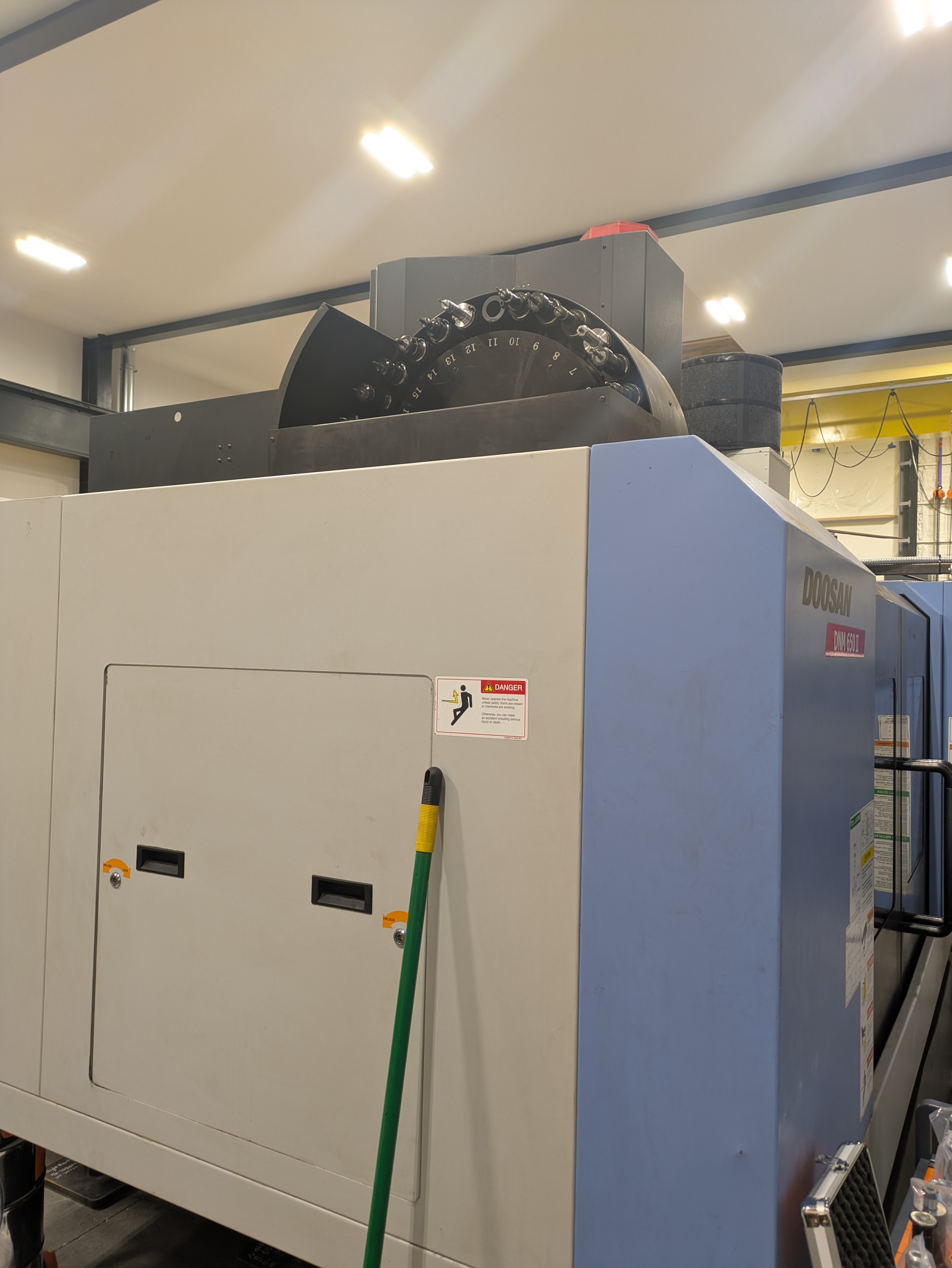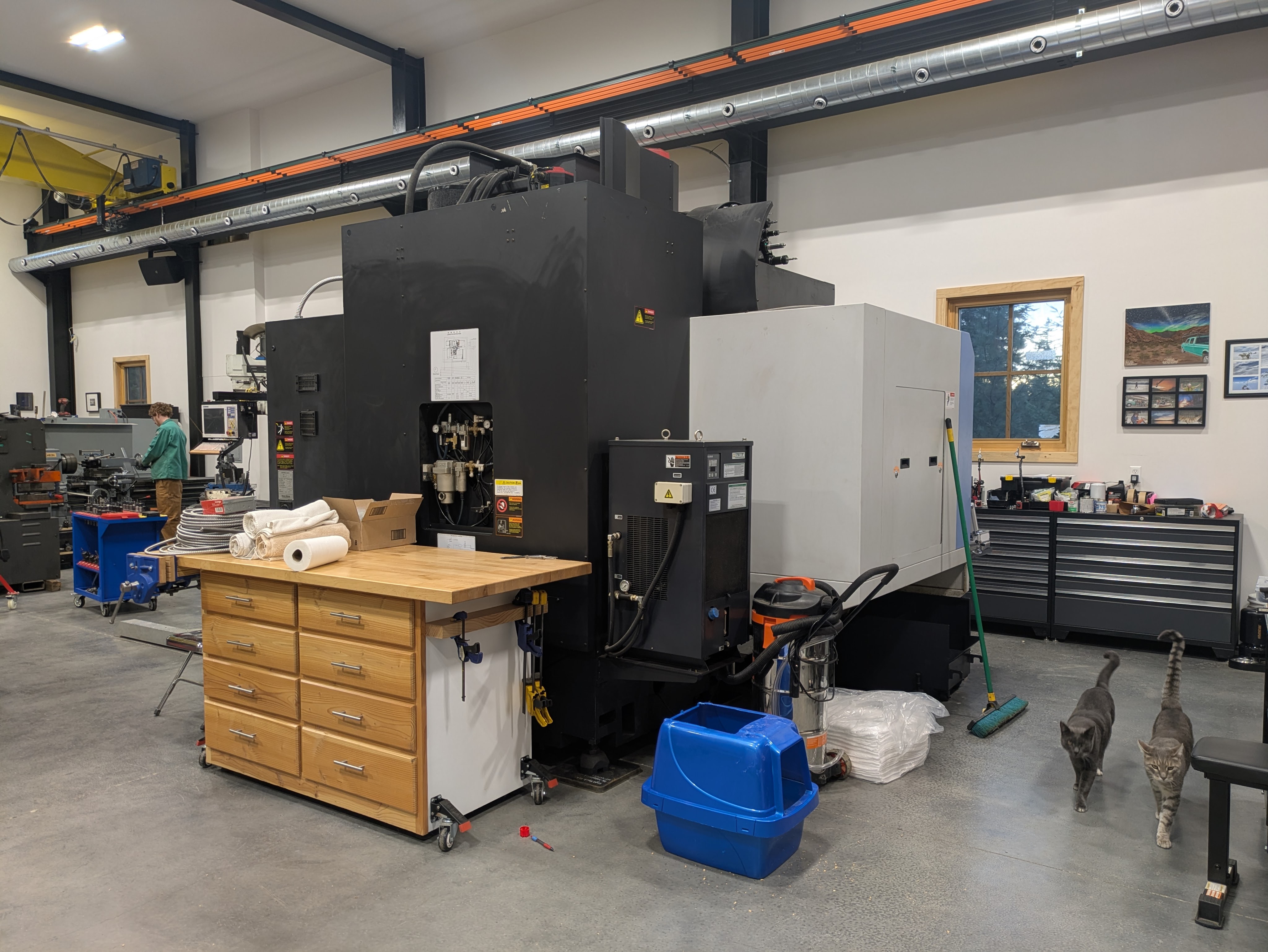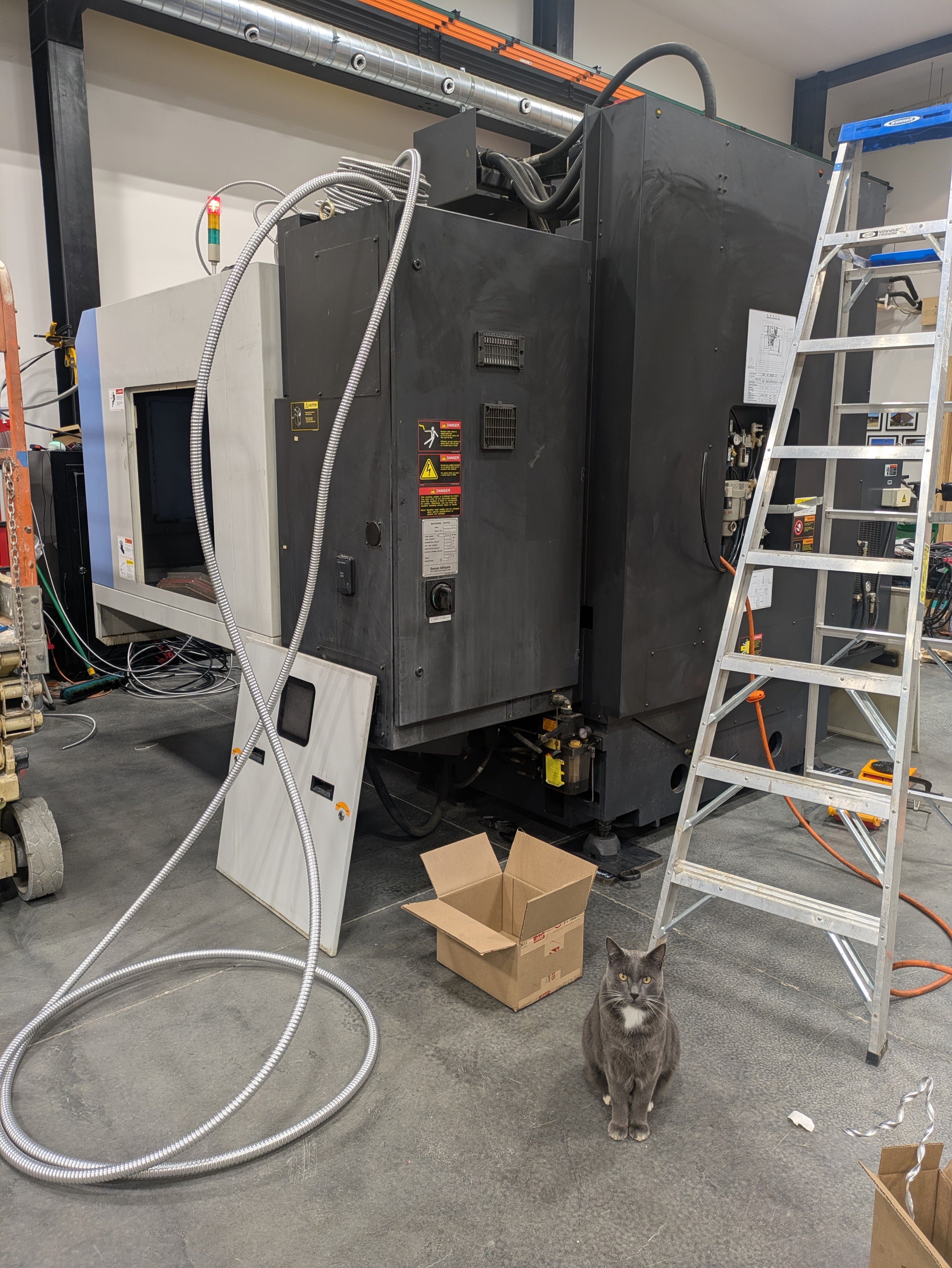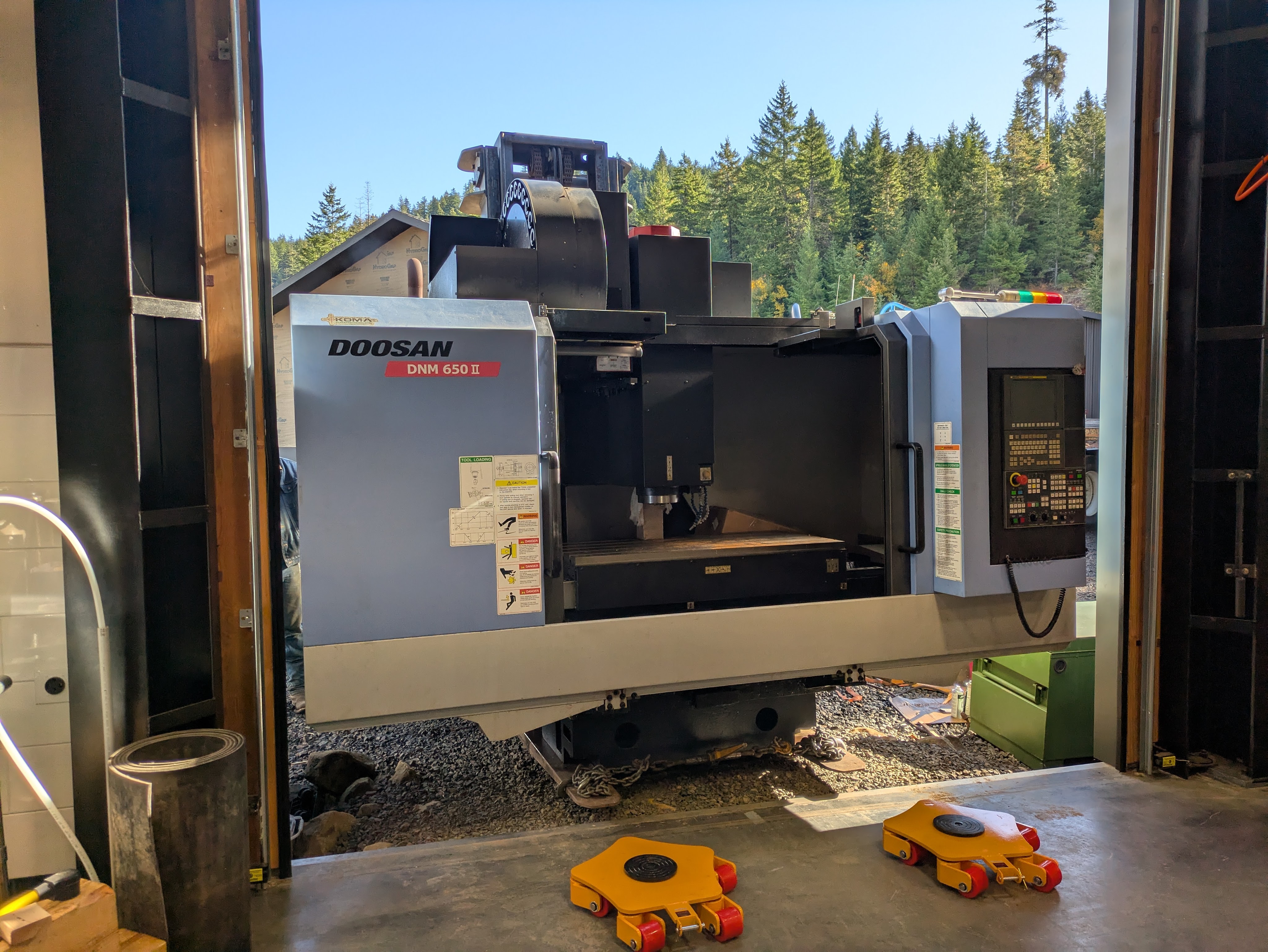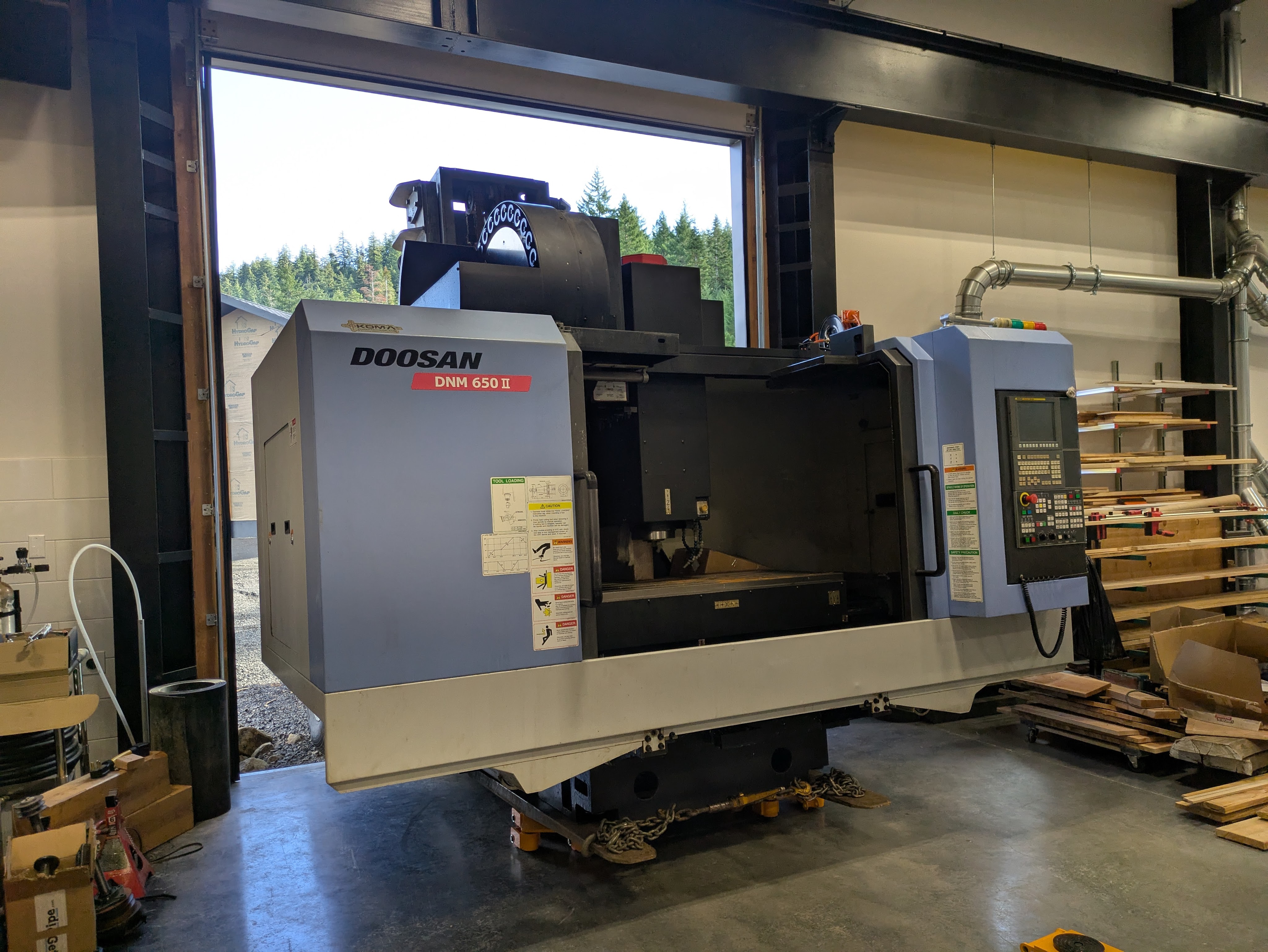 Sam got a “new” CNC mill! It’s a Doosan DNM 650 II. It has a 24 hp spindle that can run at 12,000 rpm vs. 5000 rpm on our old mill. The rapid speed on the table is 1200 inches per minute vs. 200. It’s quite an upgrade!