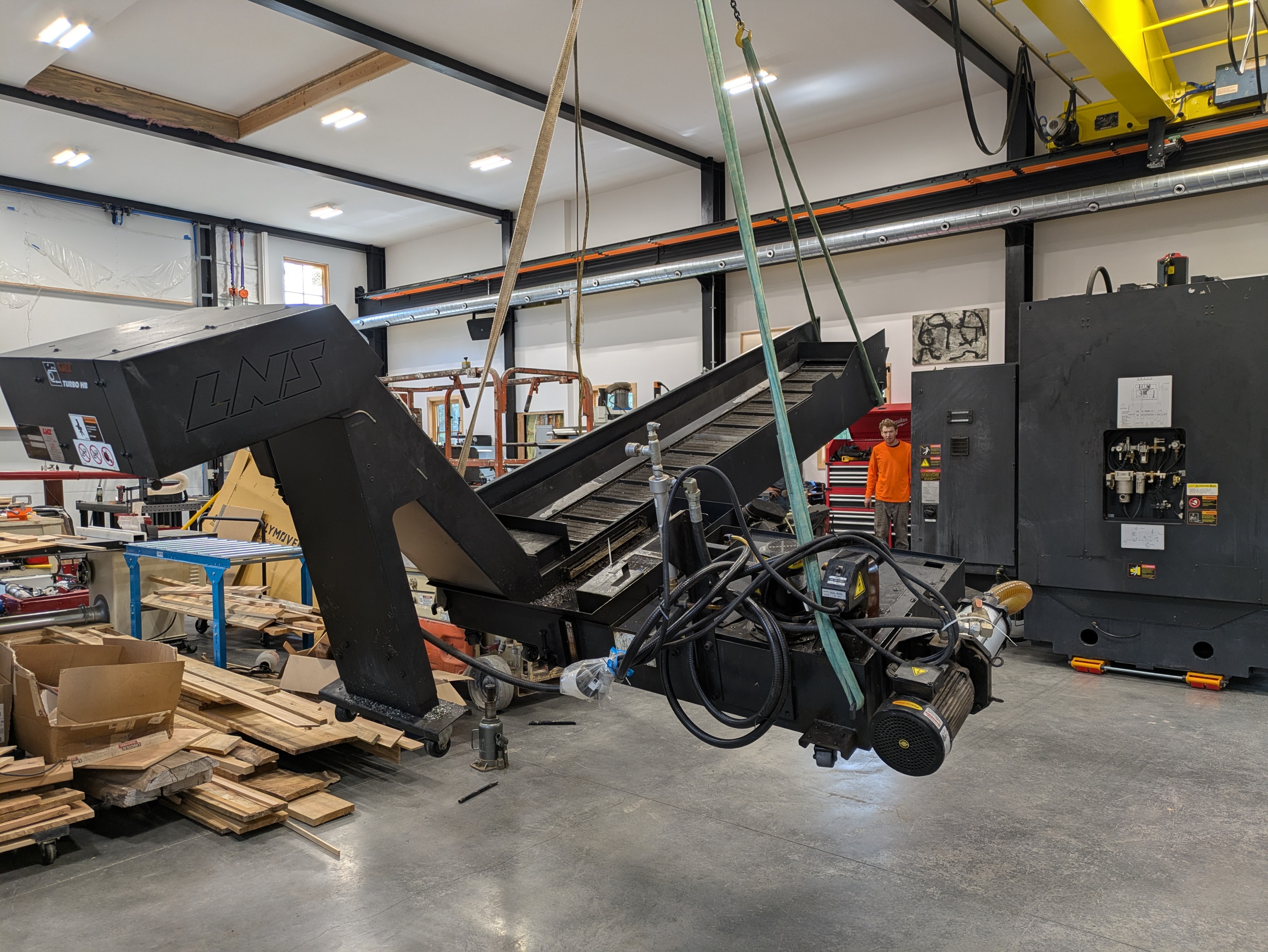 The mill came with a conveyor that carries the chips out and deposits them into a trash can. After cleaning out years worth of stinky sludge, Sam and Kevin got the conveyor in place.