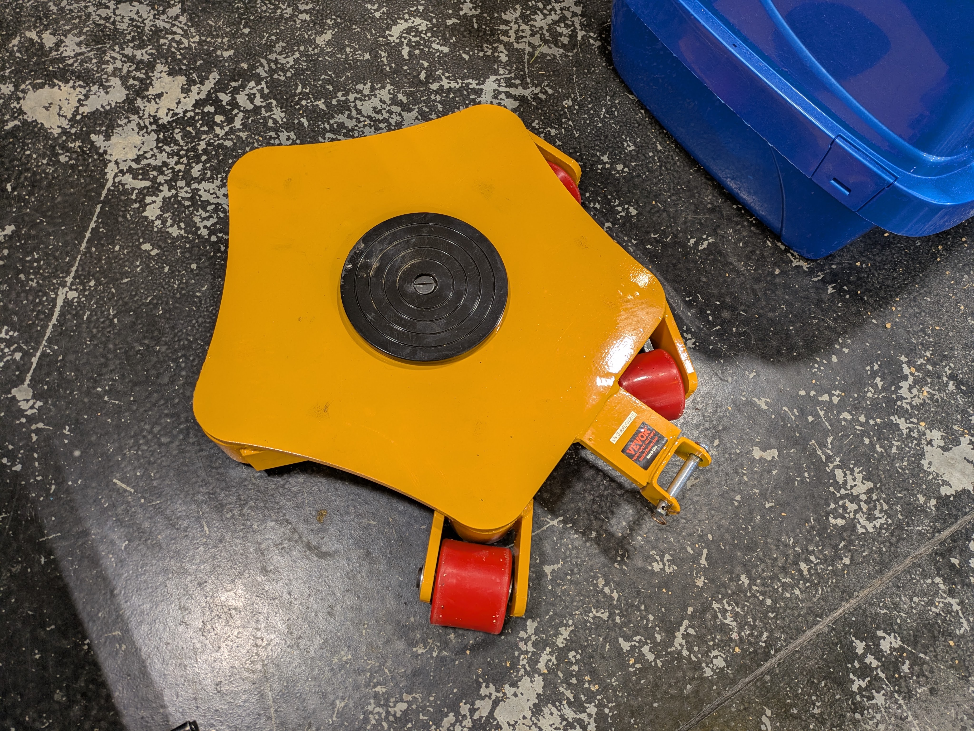 It was in! The forklift was too heavy to drive into the garage, so we set the mill on dollies. One of the big star-shaped dollies immediately bent! Luckily Sam had extra rollers. The guys pushed the mill the final distance across the floor.