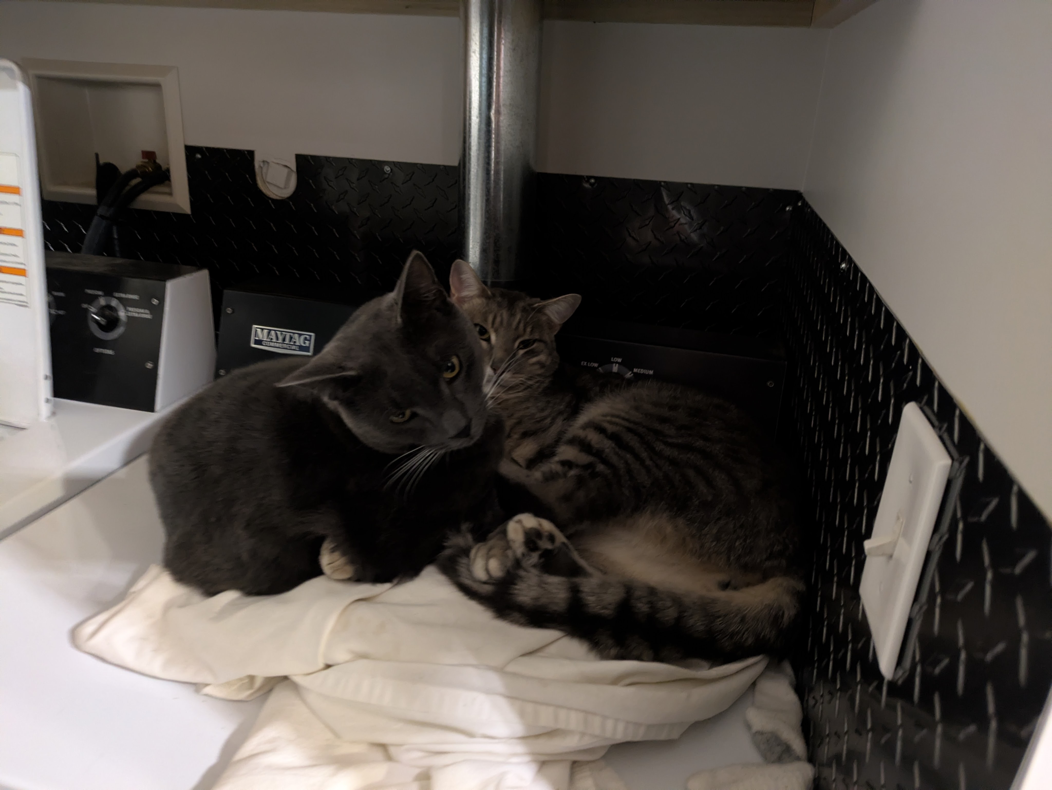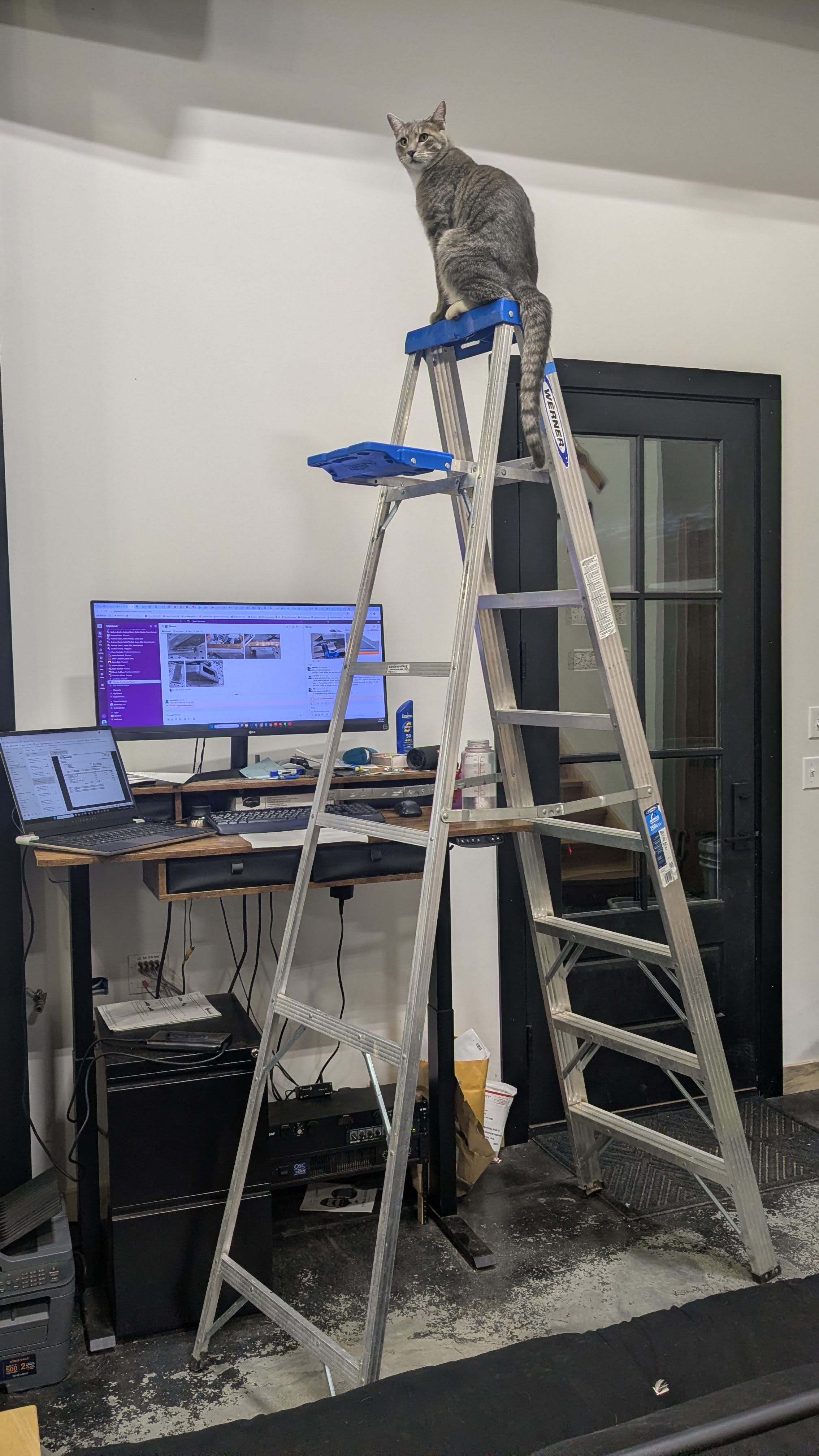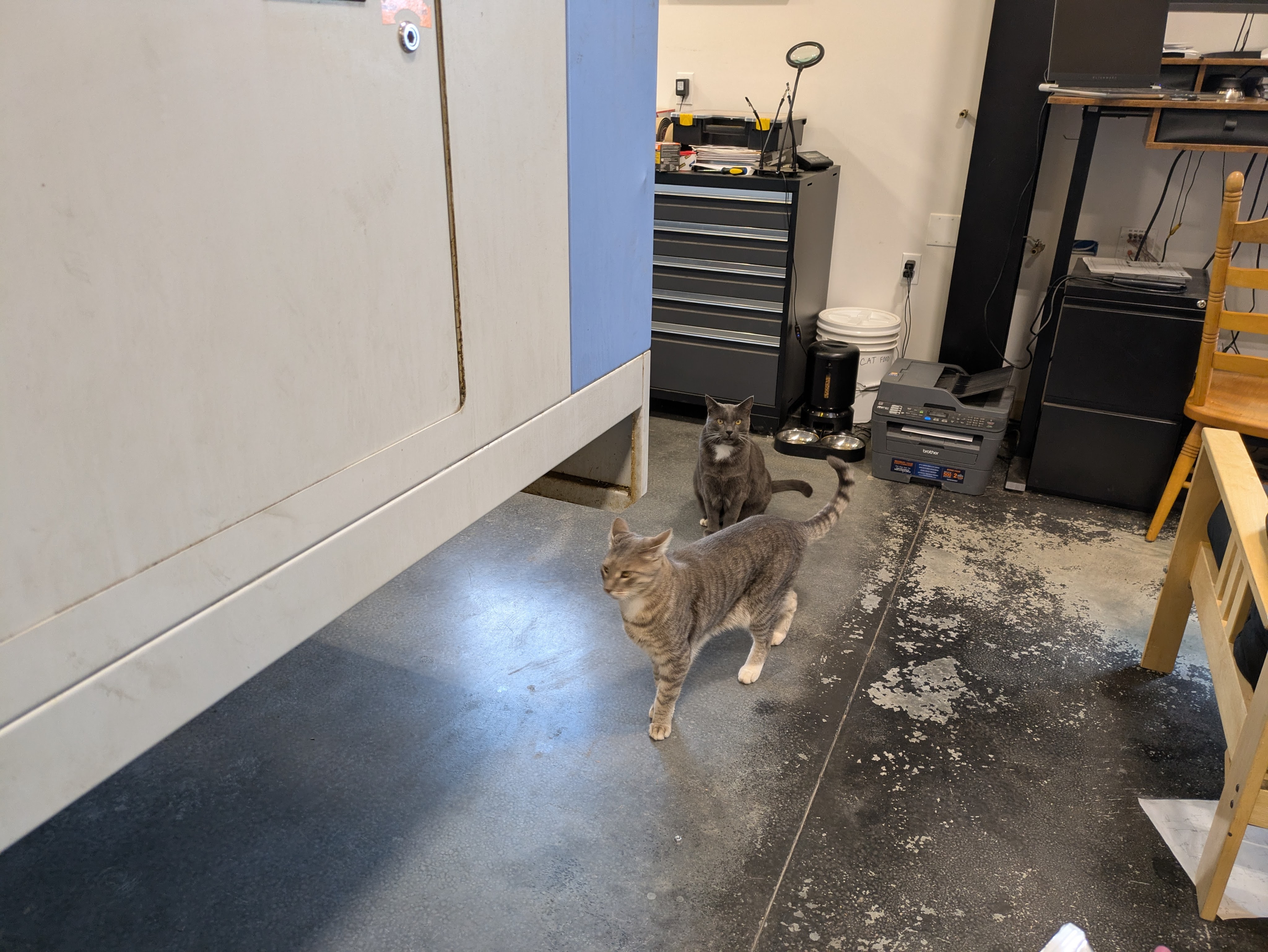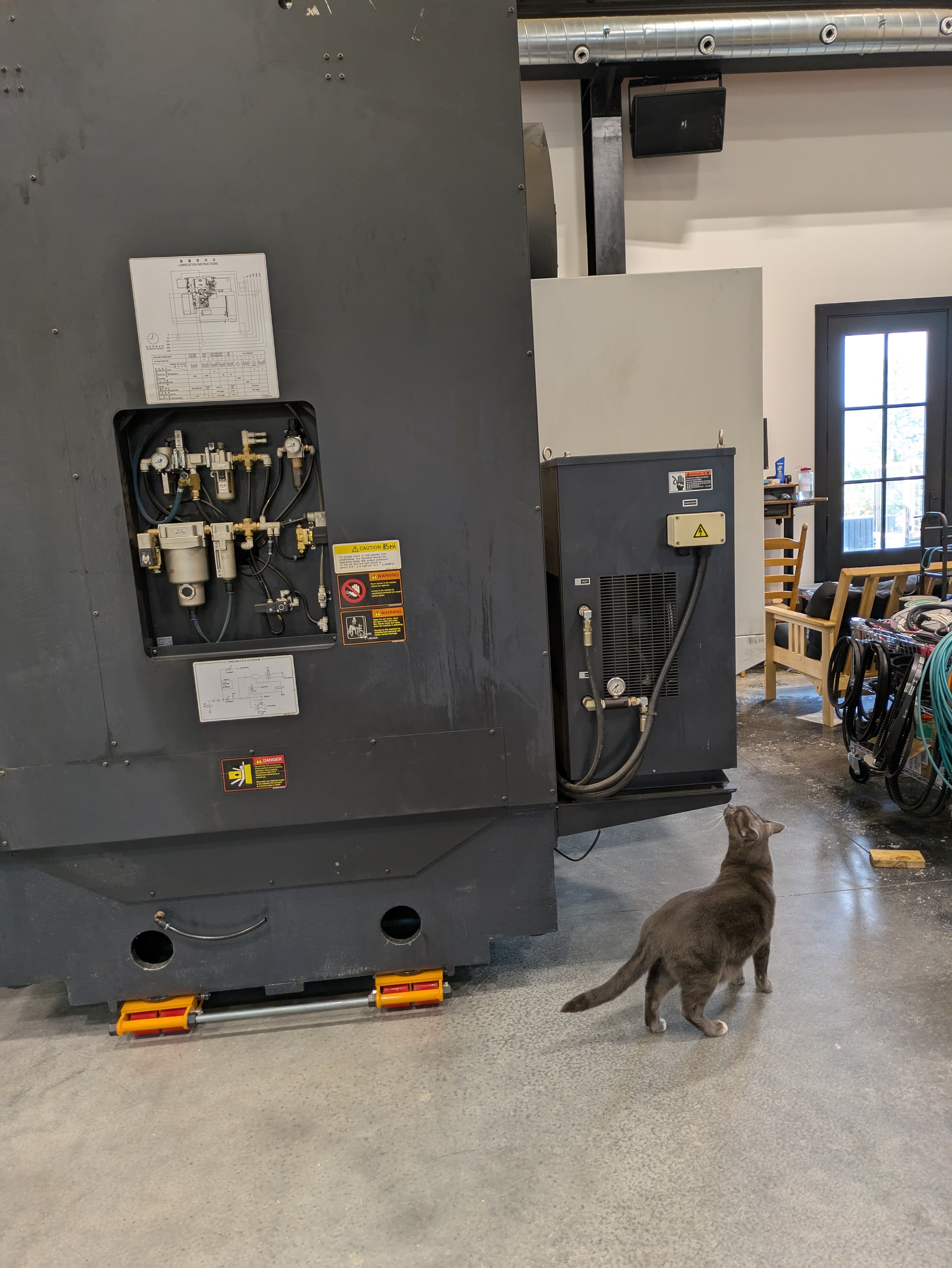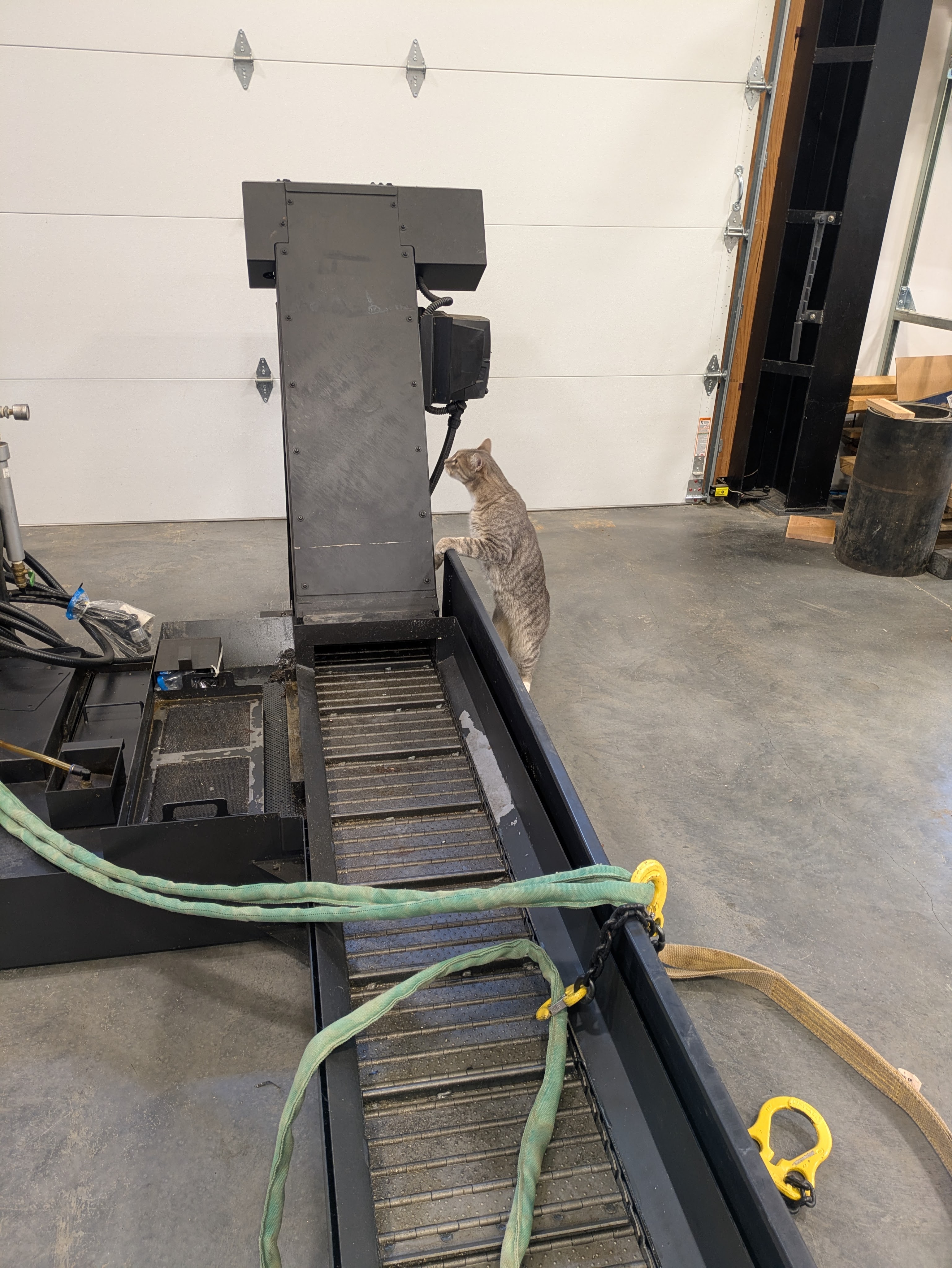 The mill placement did not pass the cat inspection. It was a little too close to their feeder and lounge area. Unfortunately the rollers were perpendicular to the direction Buster wanted to move it. Hours later, Sam and Kevin moved it a couple feet down. They set it on big plates to distribute the load. Buster approved of its new location. Smokey wishes the machine was gone.