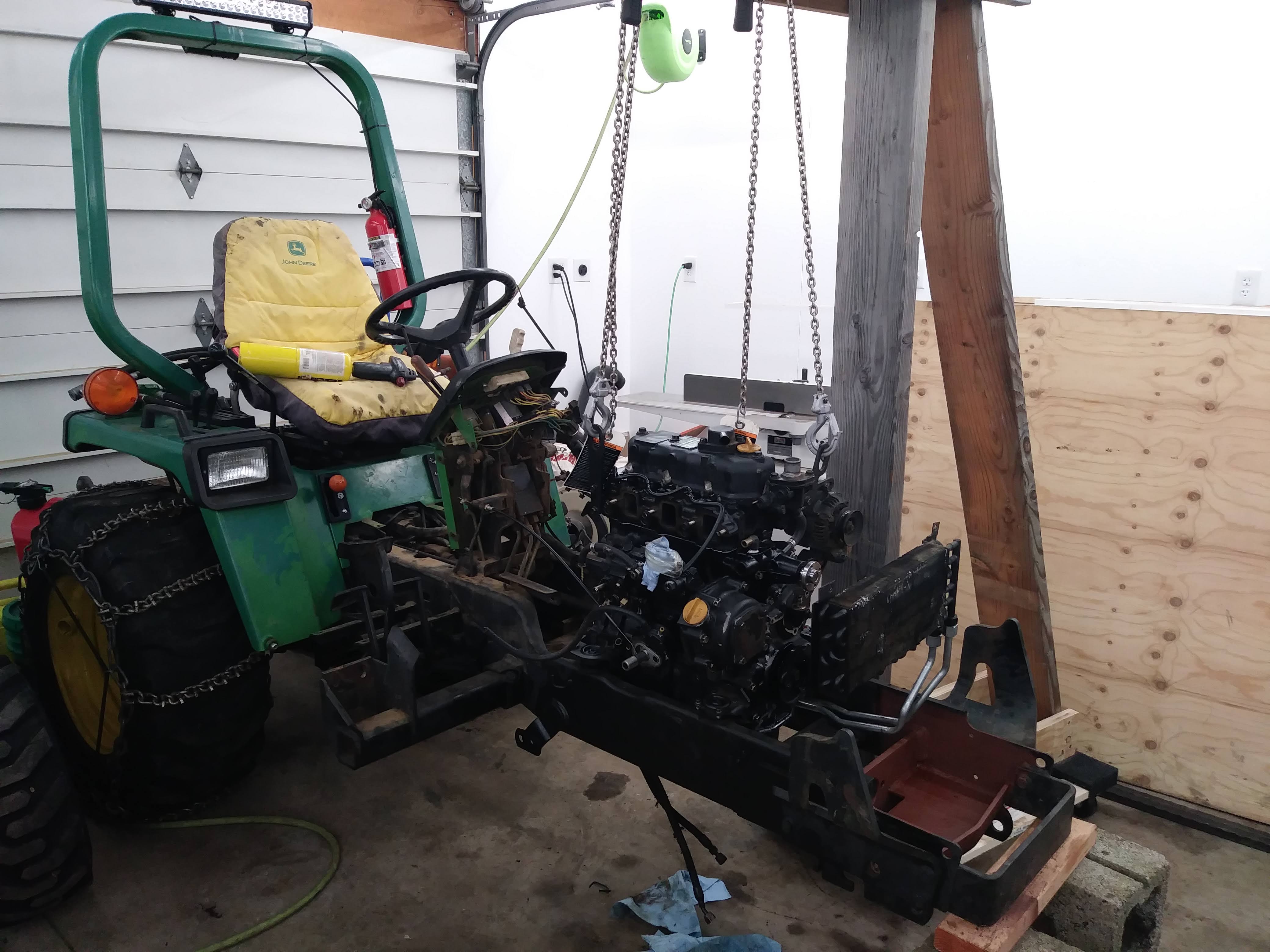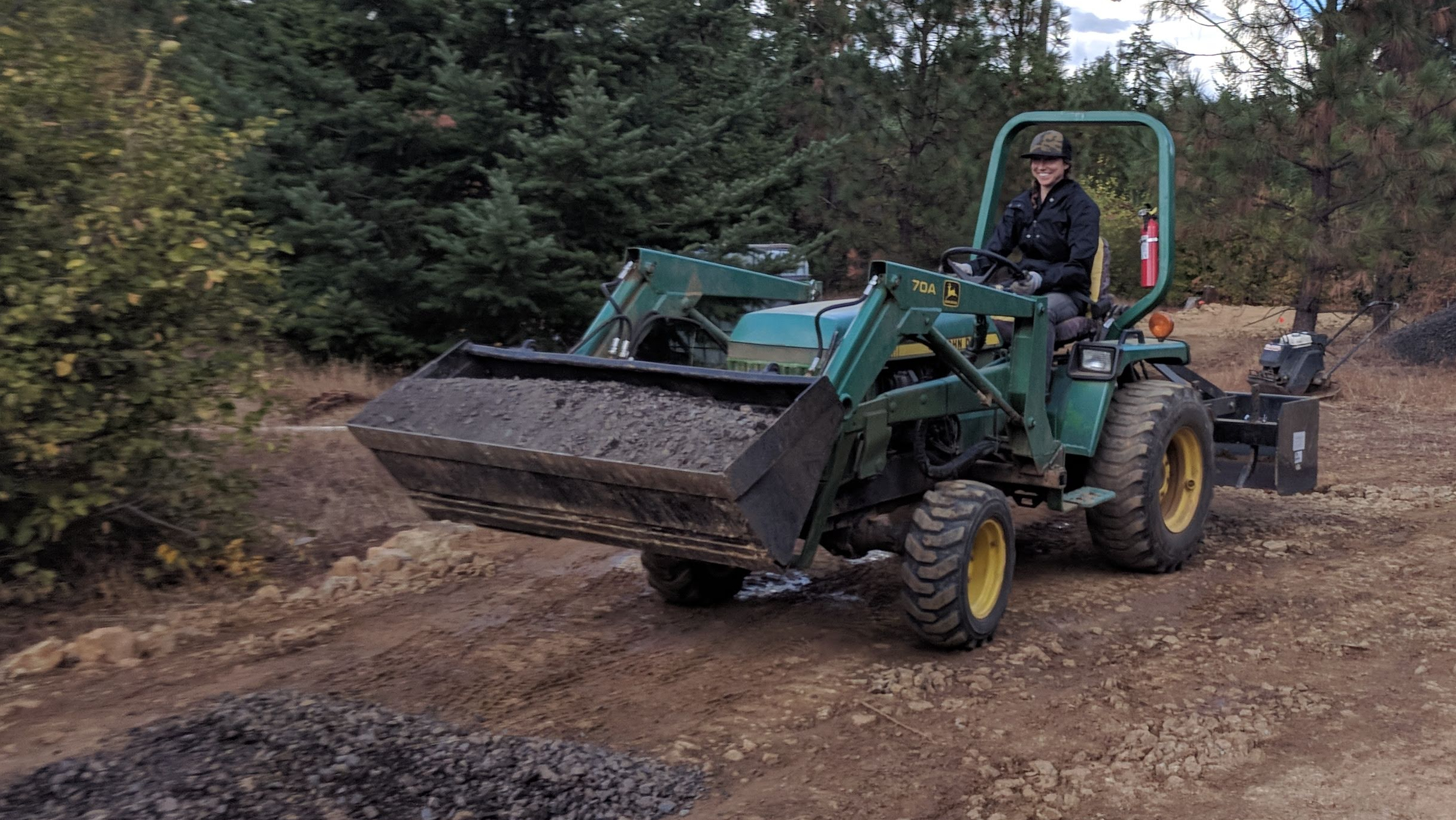 Attachments – a bucket for scooping gravel, a back blade for smoothing the ground, a grapple that Sam made for picking up logs and piles of branches, and a tree spade for digging slotted hole to plant trees (also one of Sam’s creations).