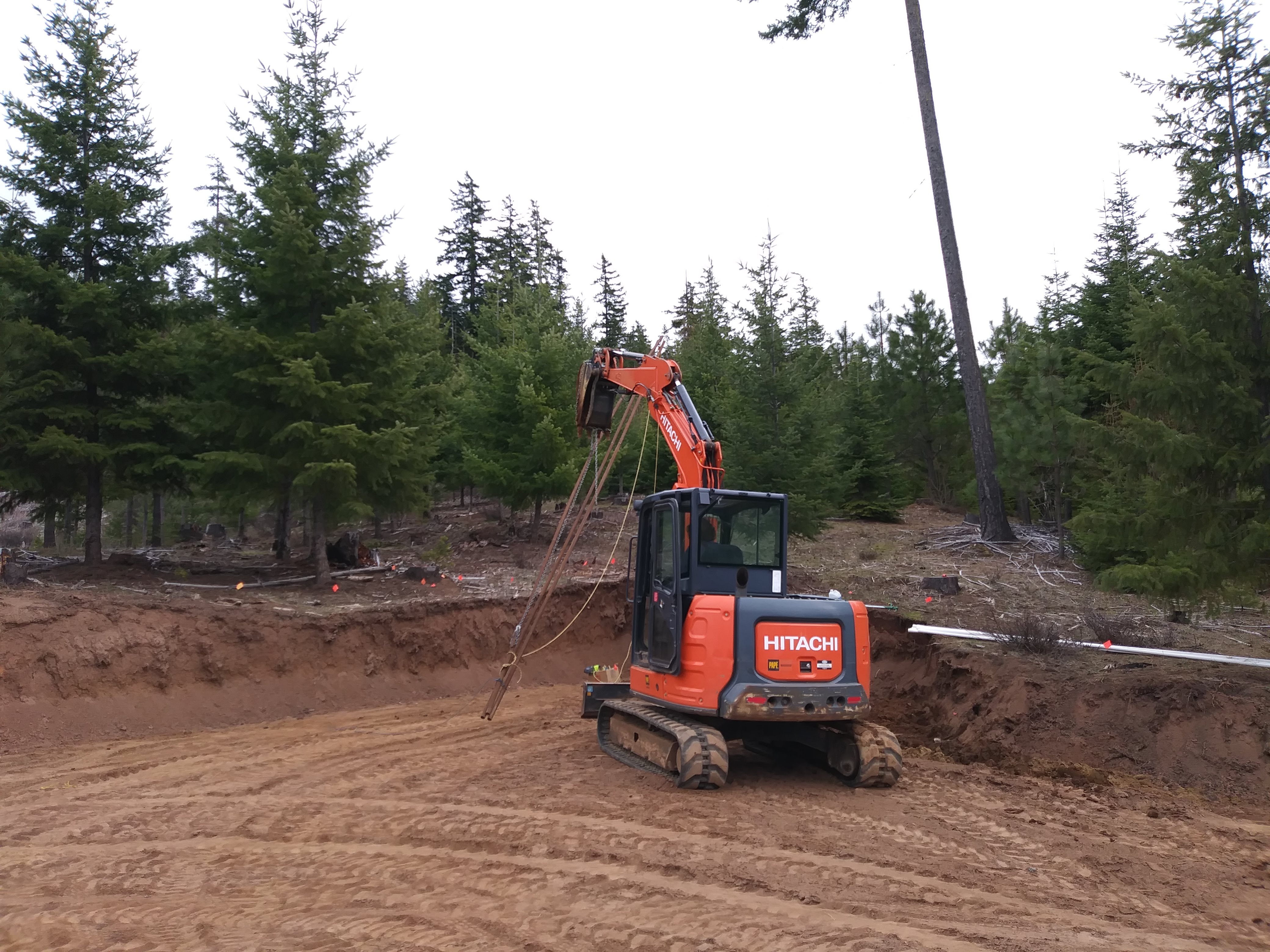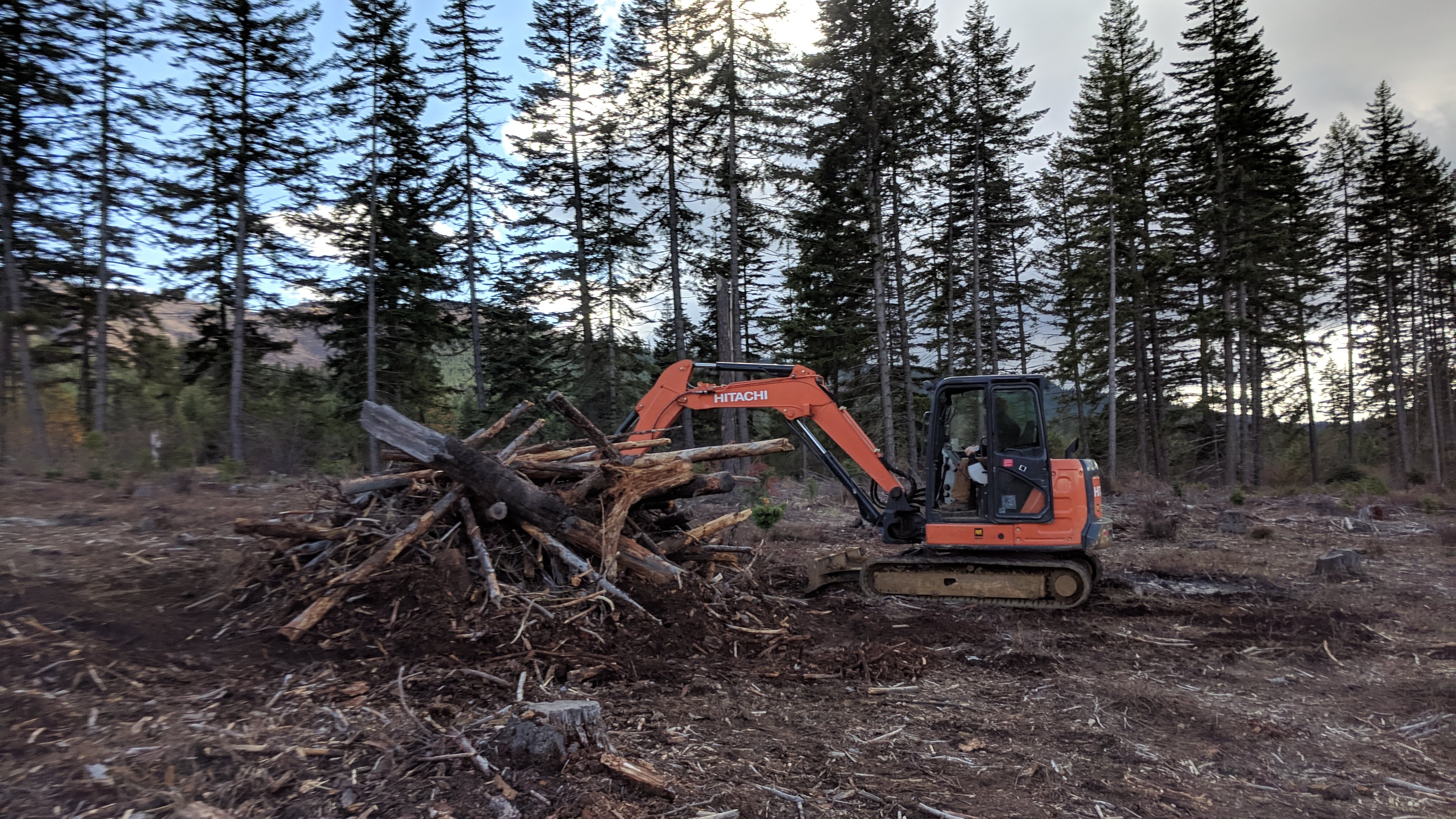 The 1996 John Deere 955 tractor is the smallest yet possibly the most versatile piece of equipment. It is mostly used for picking things up (trees, branches, logs, etc) in tight spaces with a lot of stumps. Its little bucket is good for small jobs, like filling narrow trenches with gravel. Upgrades include an engine rebuild and a tall exhaust pipe to direct the smoke away from the driver.