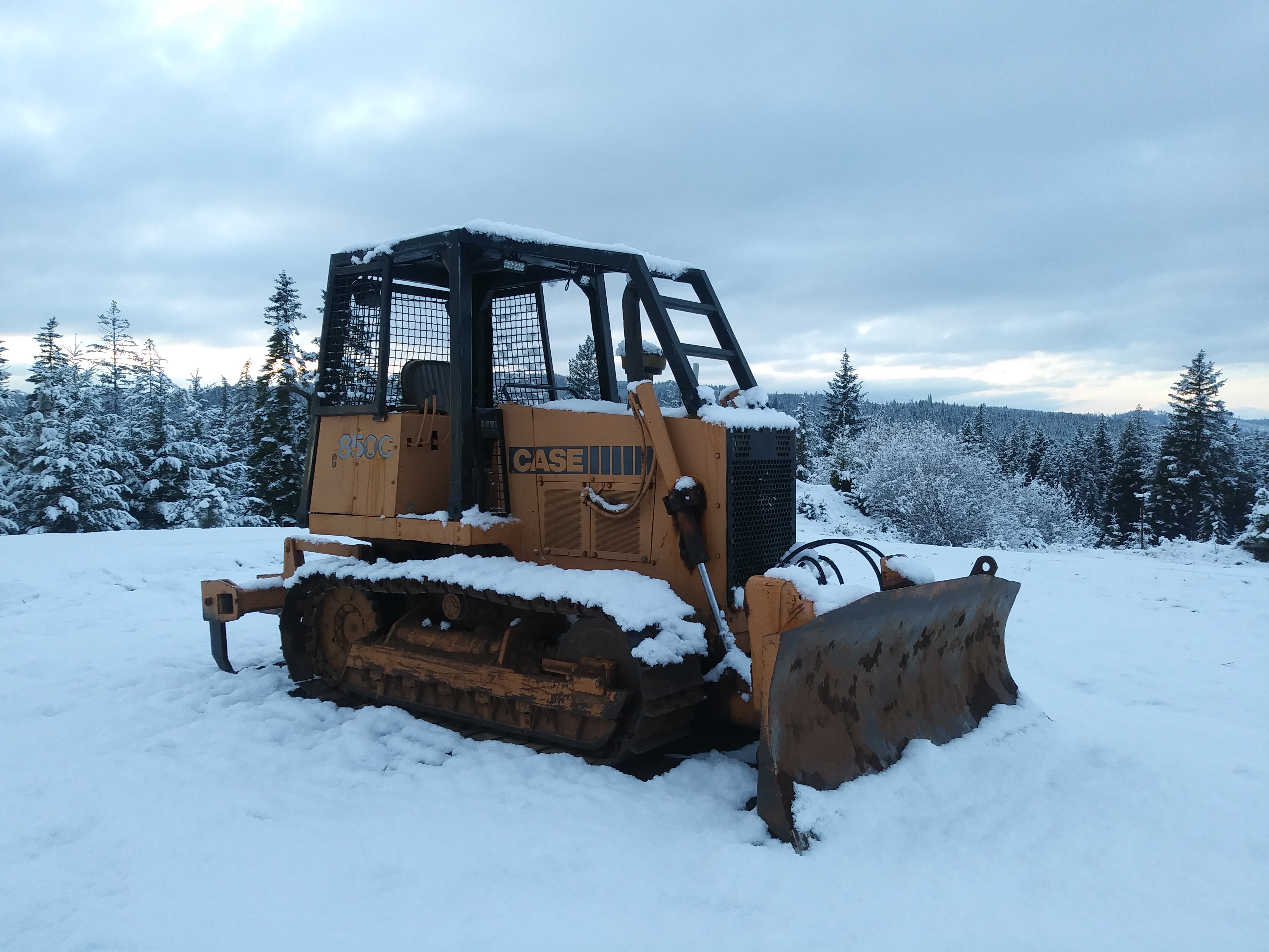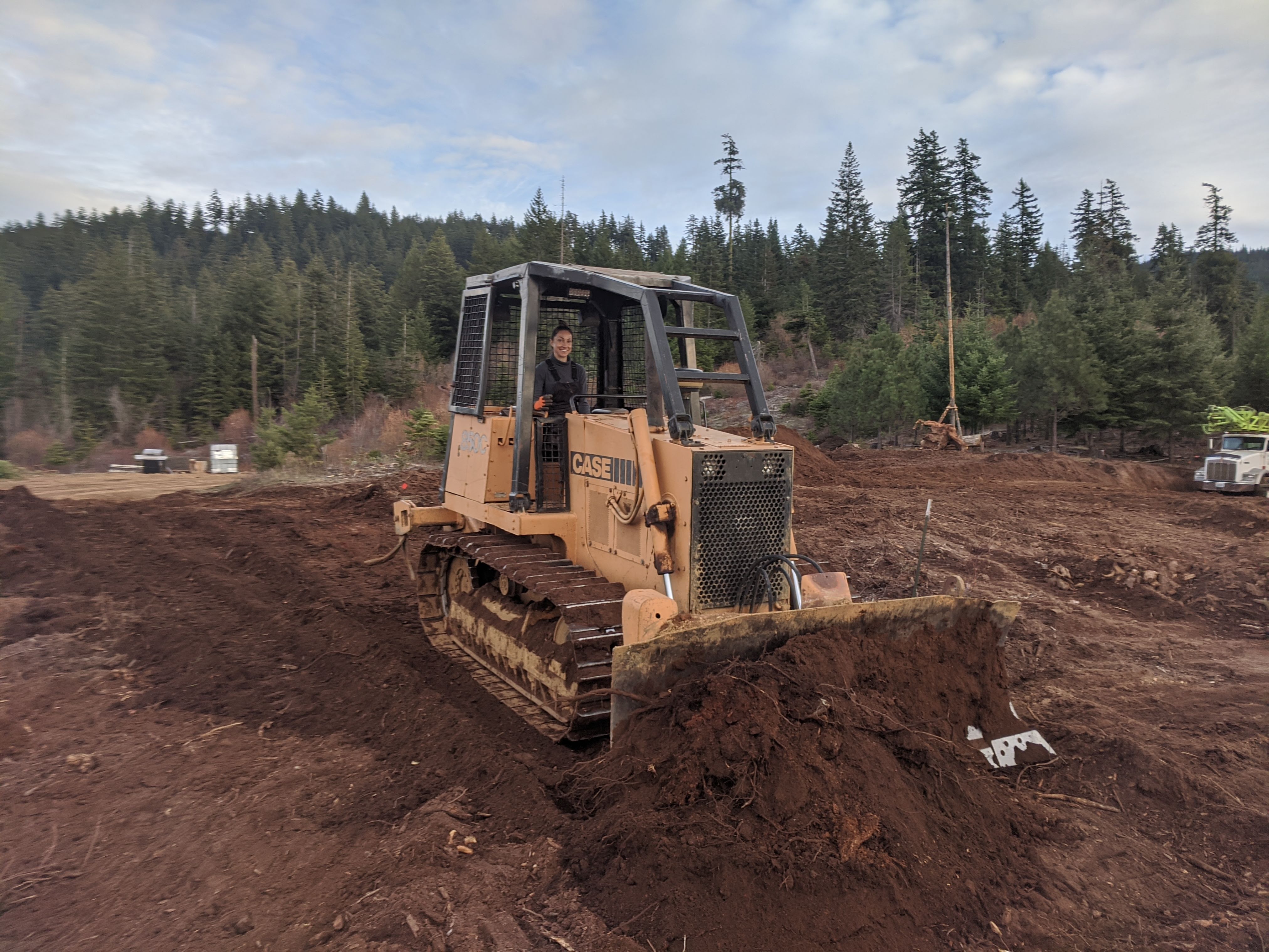 The 1982 Case 850C Bulldozer was the last machine to join the fleet. The blade is adjustable in three directions, which is handy for adding a little pitch for drainage to the roads. It can push a lot of material and is also good for smoothing out surfaces. In the winter, the dozer is the best machine for plowing snow and can also serve as a ski shuttle to the top of the ridge.
